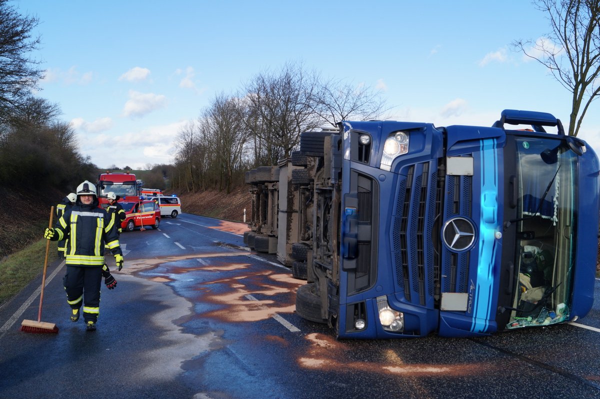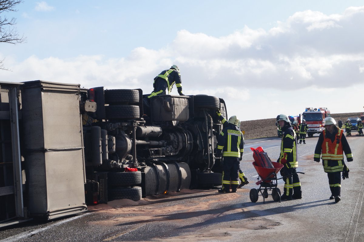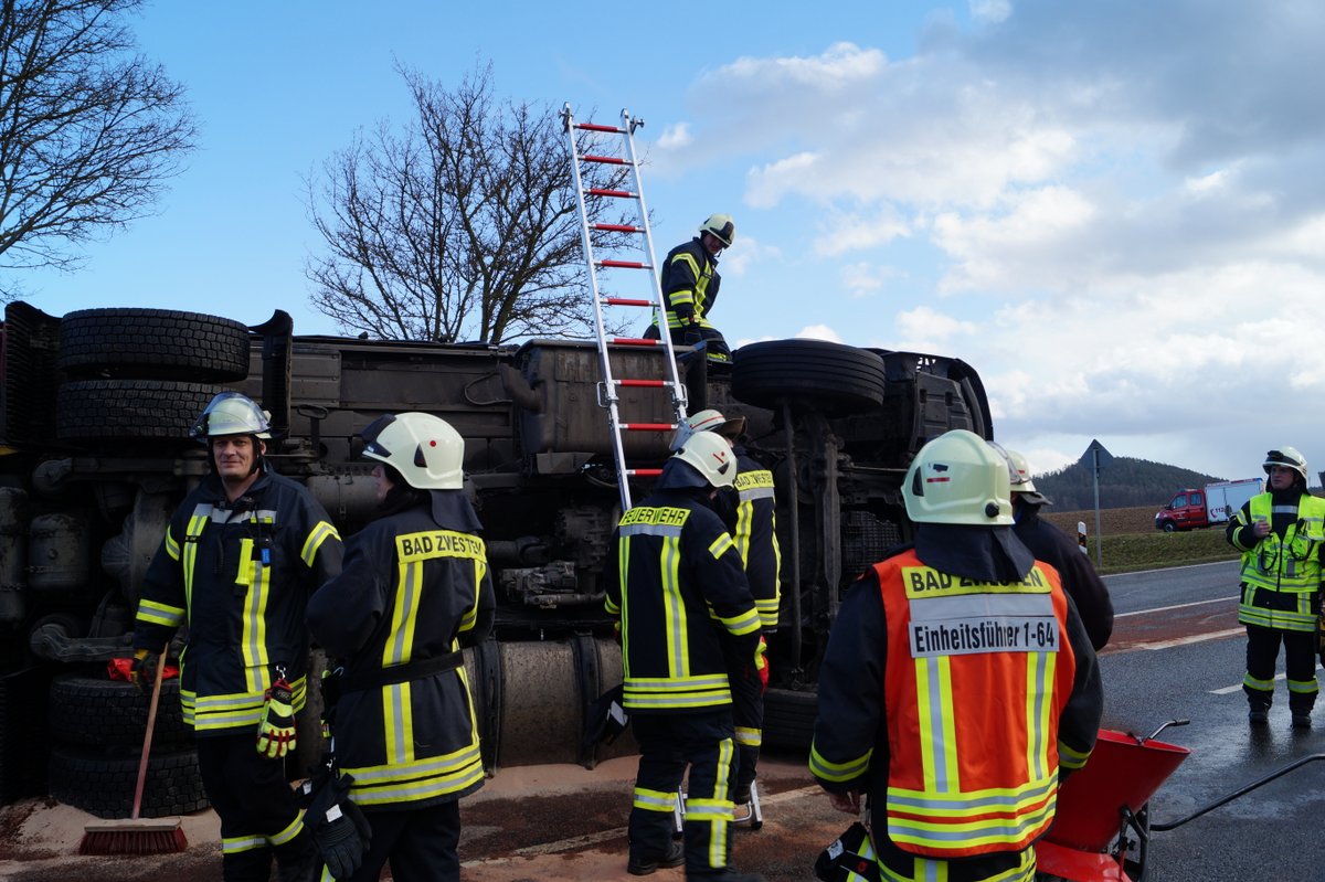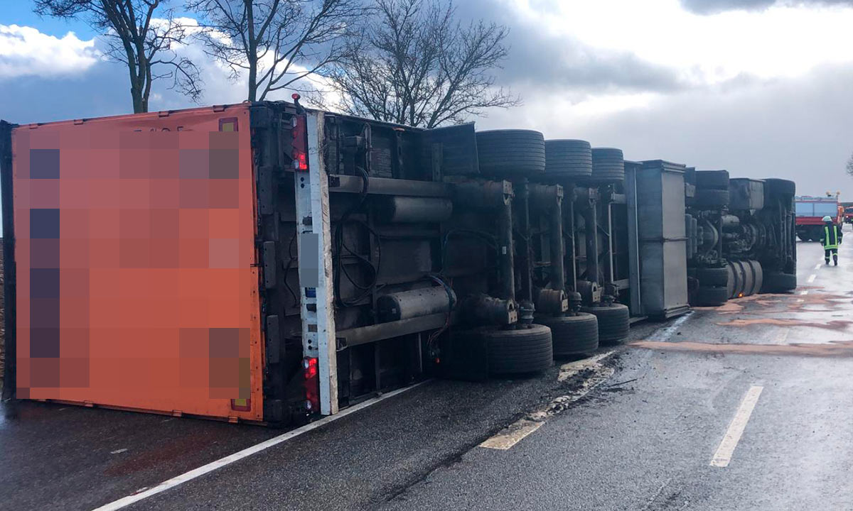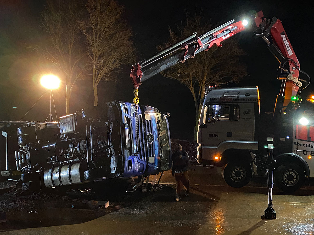 Bei Eintreffen der ersten Rettungskräfte war der 45- Jährige bereits aus seinem Fahrerhaus befreit. Die Feuerwehren sicherten die Einsatzstelle und streuten mit Bindemittel ausgelaufene Betriebsstoffe ab. Der Restdiesel im Tank musste von den Kameraden ab- bzw. umgepumpt werden.