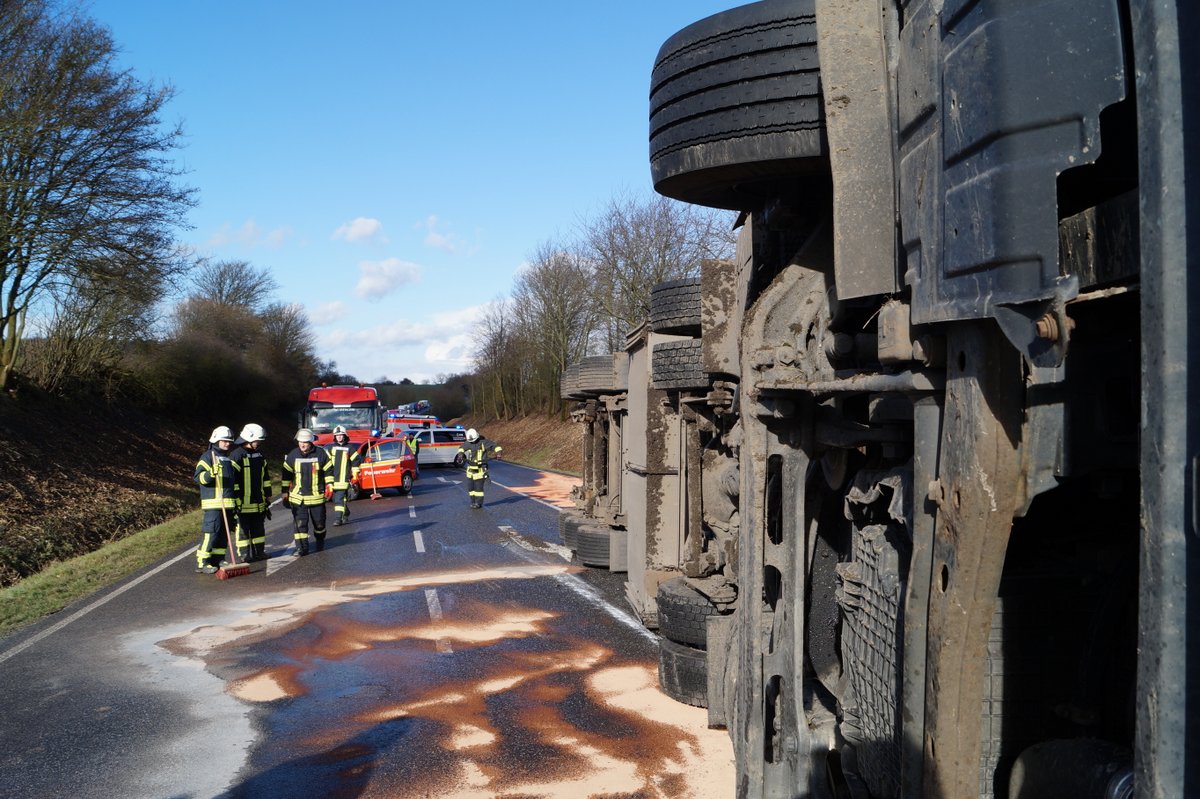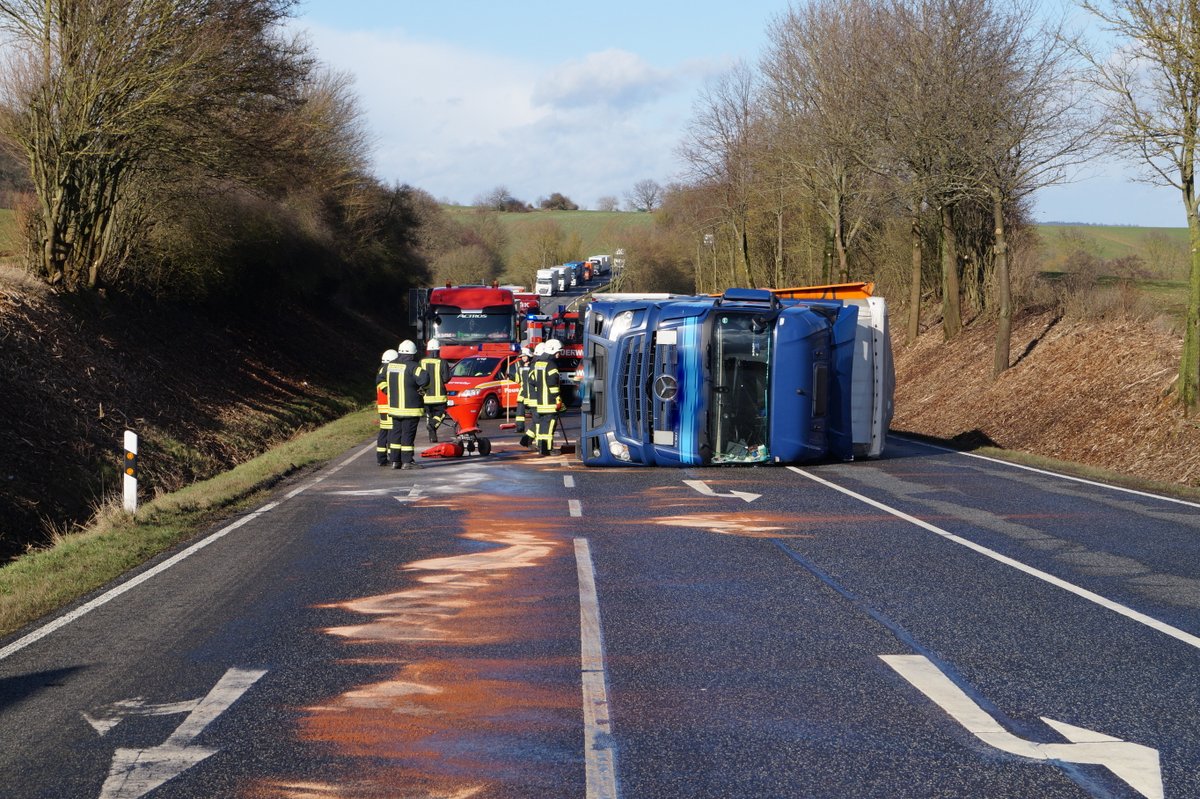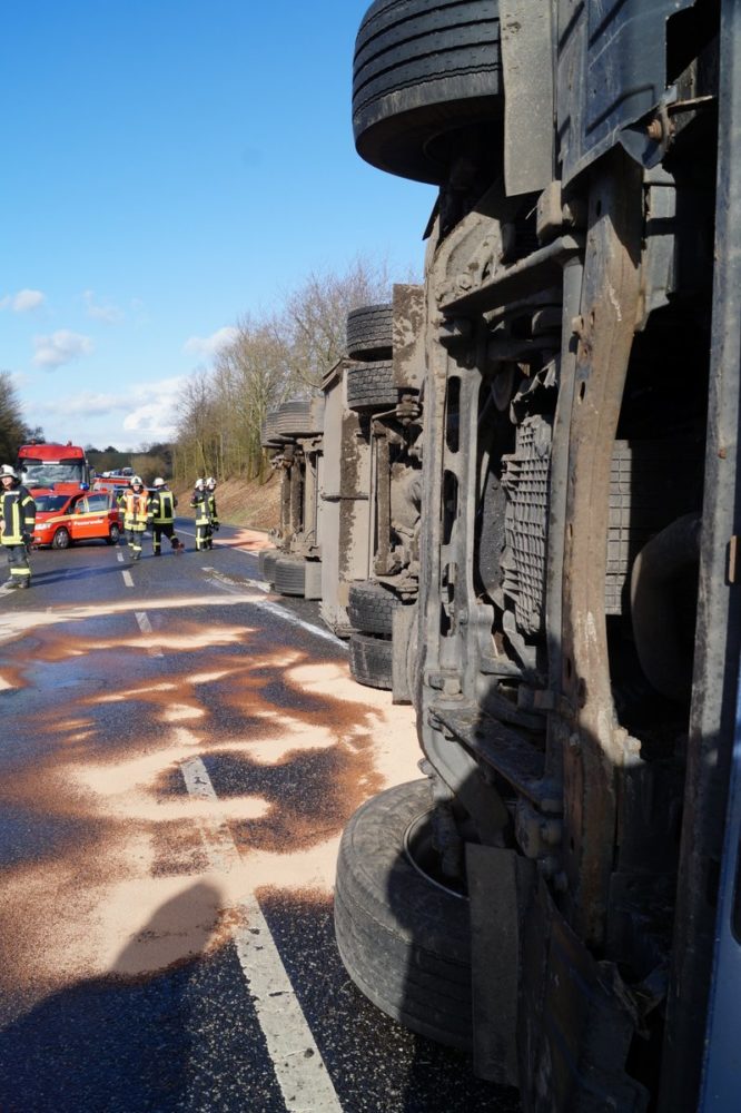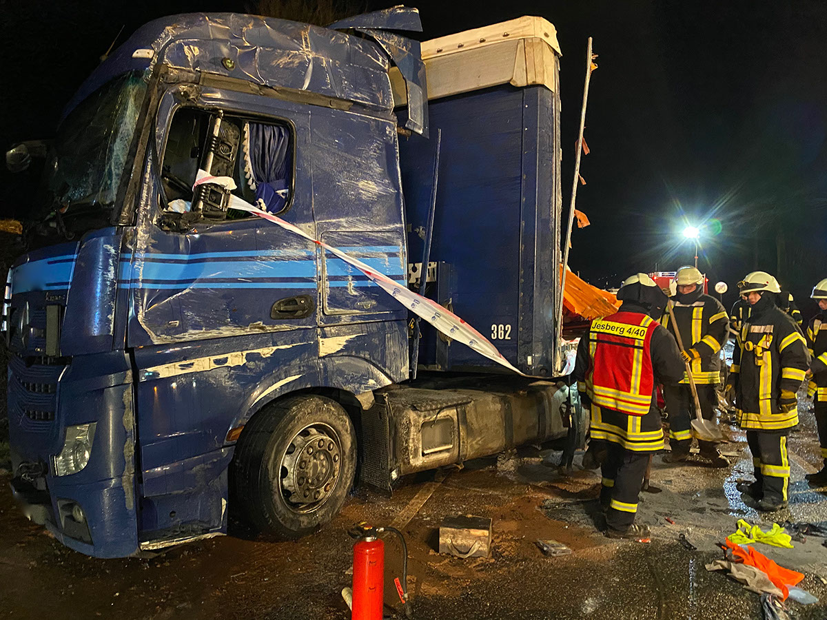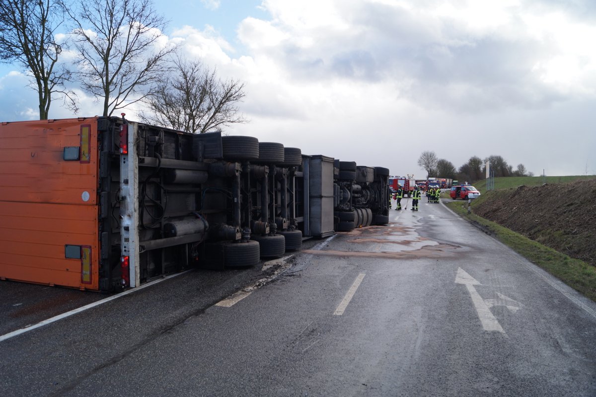 Bei Eintreffen der ersten Rettungskräfte war der 45- Jährige bereits aus seinem Fahrerhaus befreit. Die Feuerwehren sicherten die Einsatzstelle und streuten mit Bindemittel ausgelaufene Betriebsstoffe ab. Der Restdiesel im Tank musste von den Kameraden ab- bzw. umgepumpt werden.
