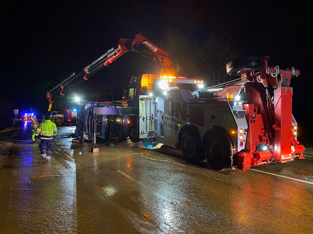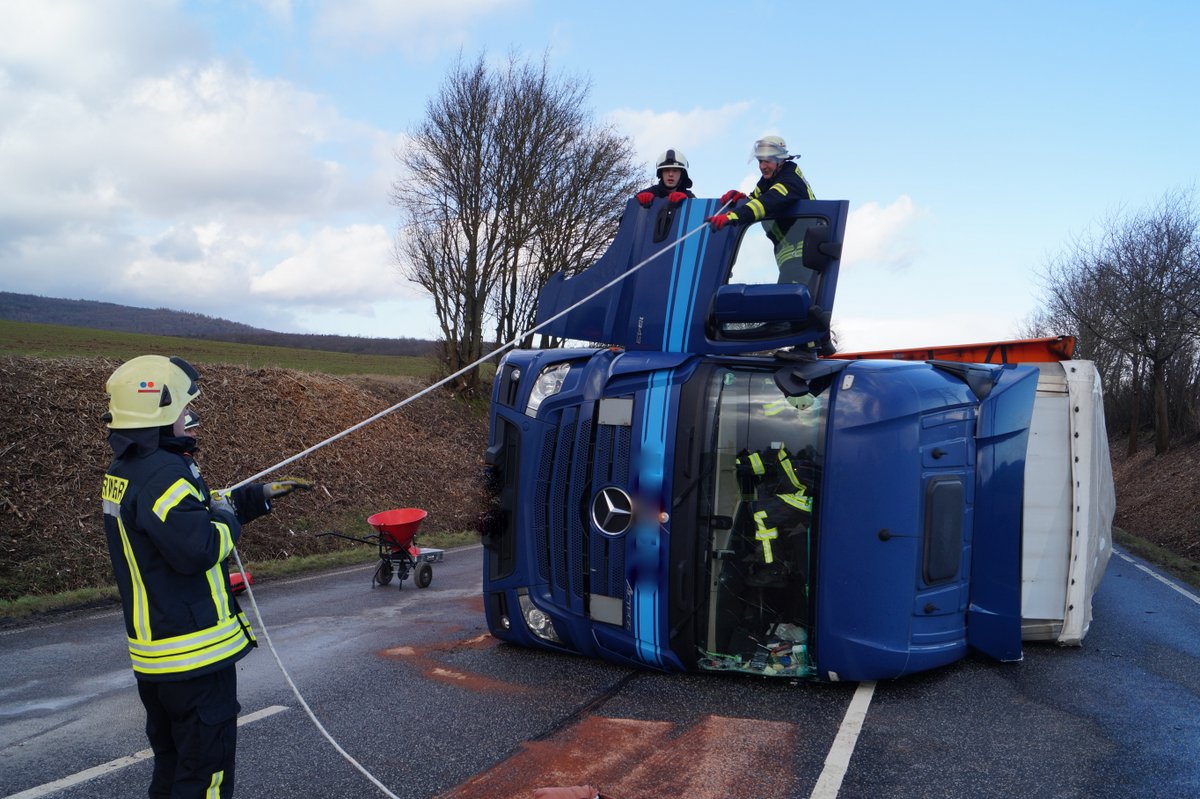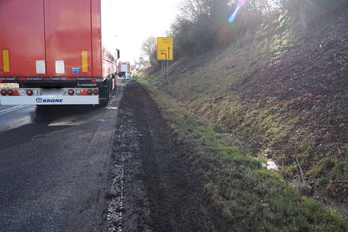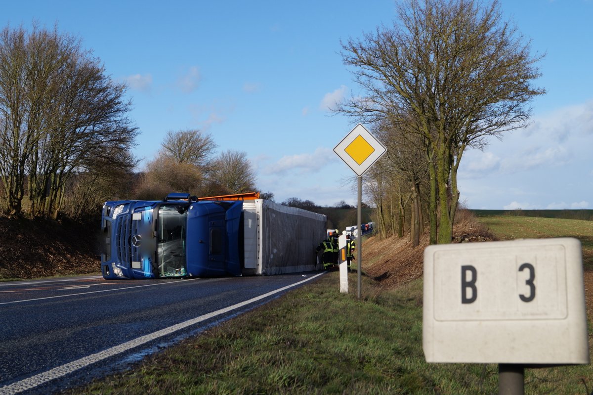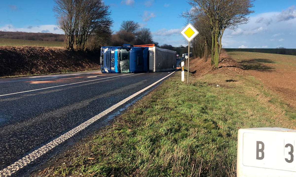 JESBERG. Die Bundesstraße 3 zwischen Bad Zwesten und Jesberg musste am Montag gegen 13:40 Uhr aufgrund eines Lkw-Unfalls voll gesperrt werden. Der 45 Jahre alter Fahrer aus Nentershausen geriet mit seinem Sattelzug vermutlich auf die rechte Bankette. Der Lkw schaukelte auf und kippte, auch aufgrund des straffen Windes, in Höhe des Abzweigs nach Reptich auf die Seite.
