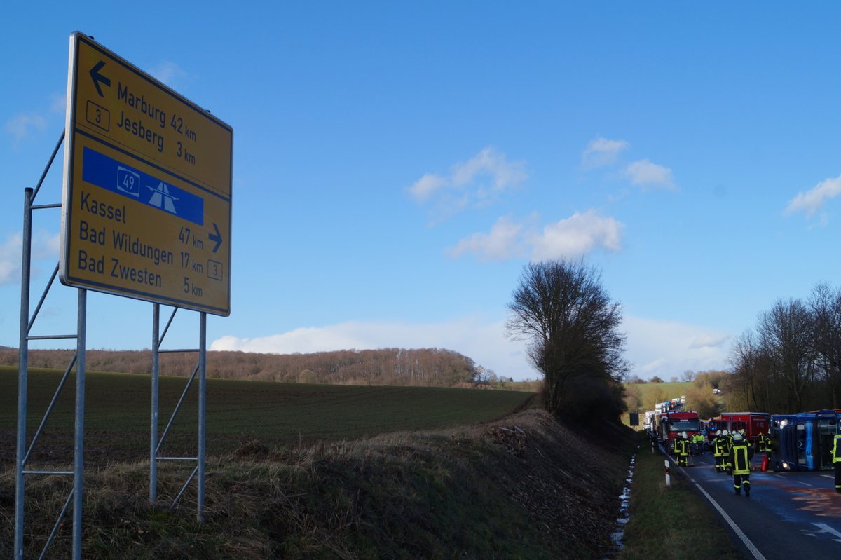 Der Fahrer erlitt schwere, keine lebensbedrohlichen Verletzungen und wurde nach seiner Erstversorgung an der Unfallstelle in ein Krankenhaus nach Bad Wildungen gebracht.