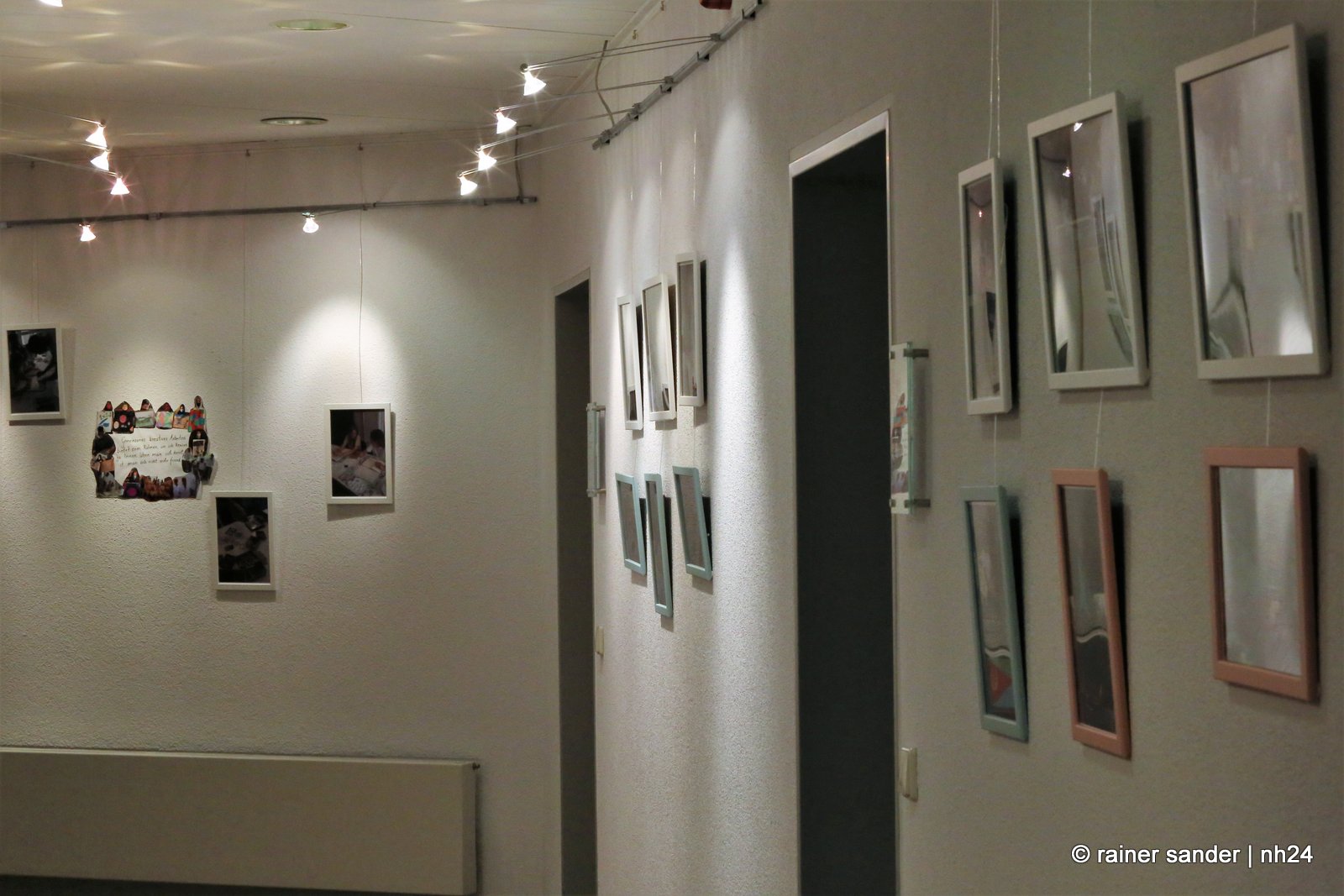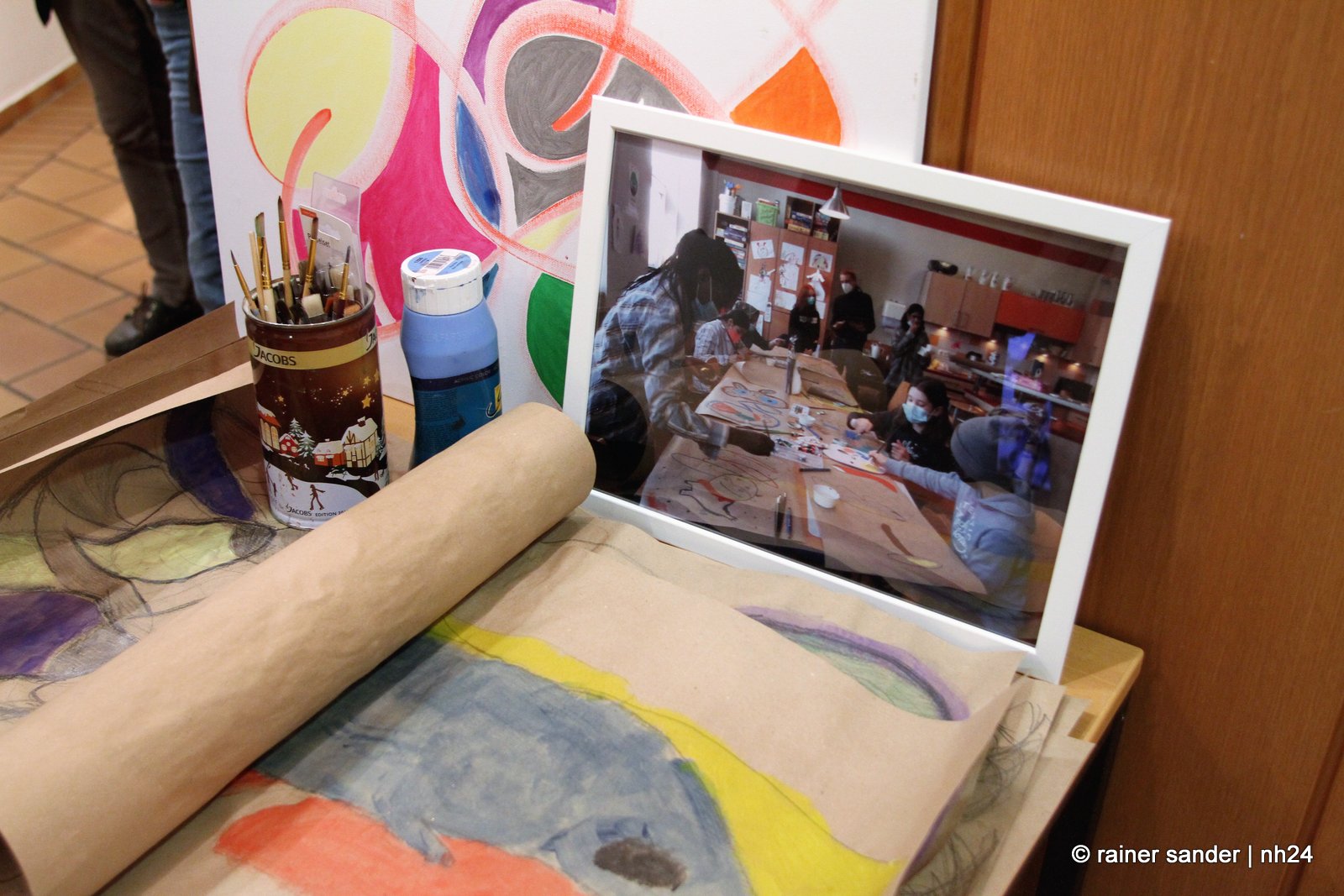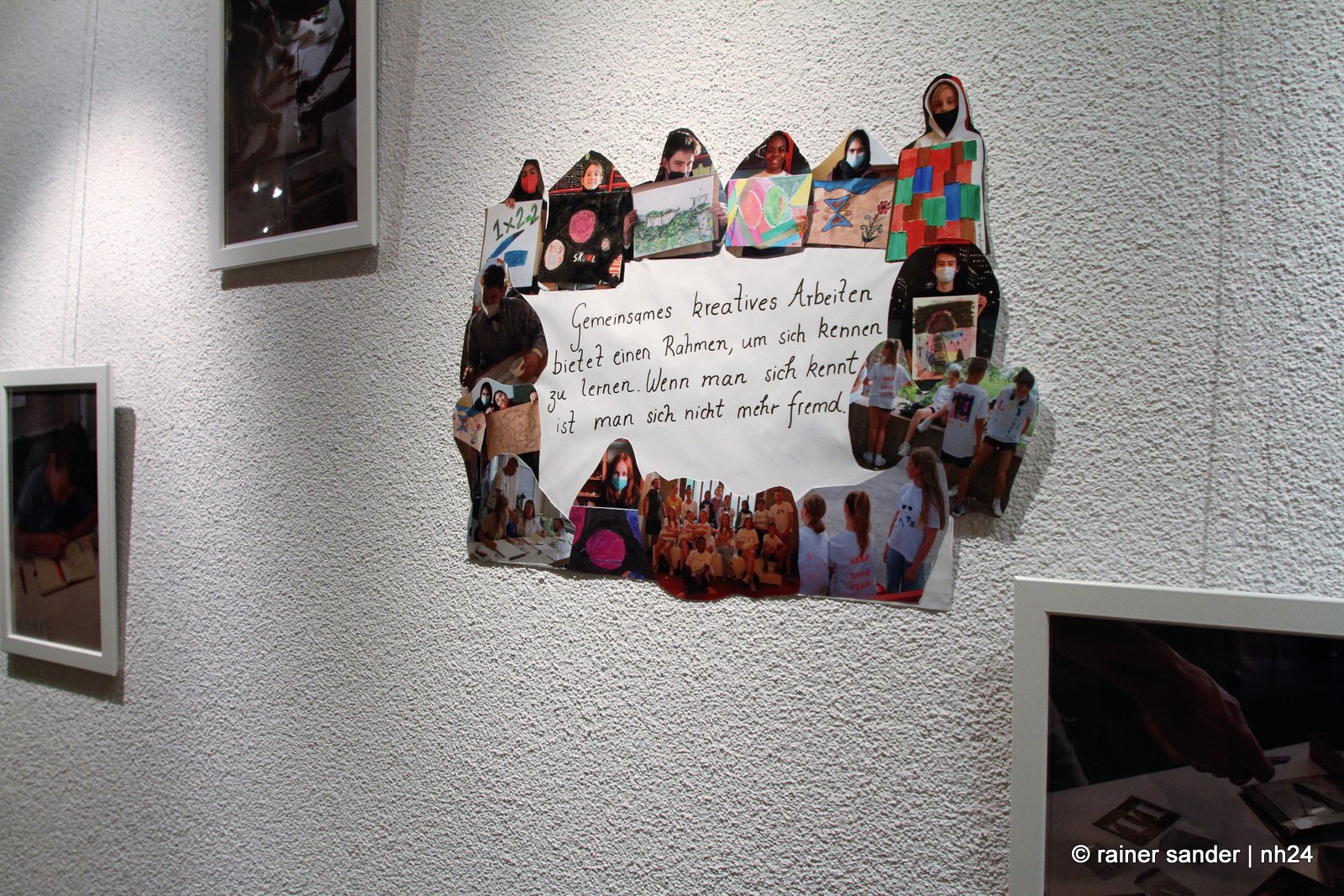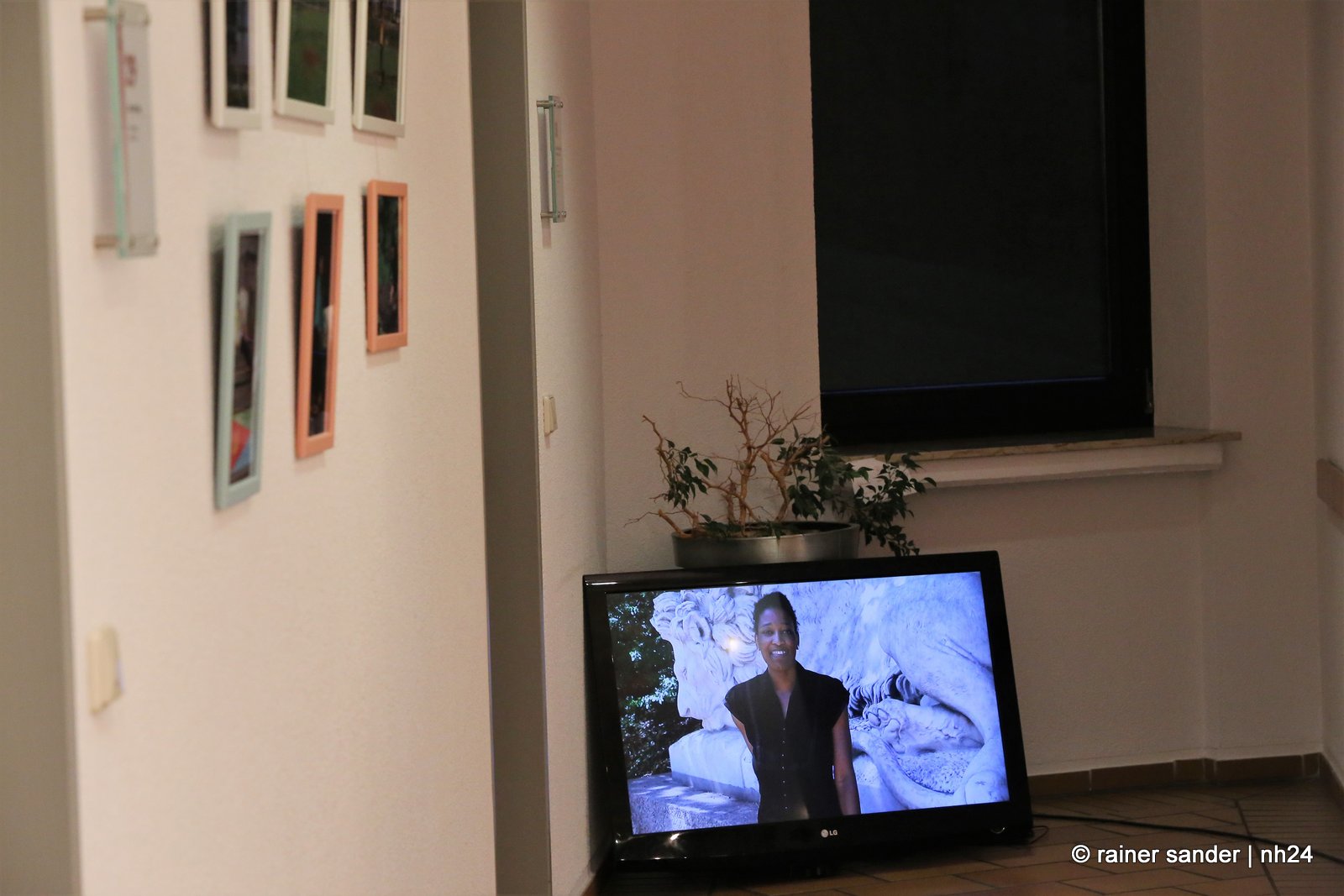 Die Ausstellung ist aufgeteilt in das Kreative der Workshops mit Farben und Medien. Jugendliche sagen im Video „ich wünsche Dir …“ Zoe, Sarah und andere wurden interviewt. Auch Susann (37) die vor rund 50 Besuchern der Vernissage stolz berichtet, dass sie, angekommen im Jahr 2016, inzwischen kurz vor dem Abschluss einer Ausbildung als Erzieherin steht.