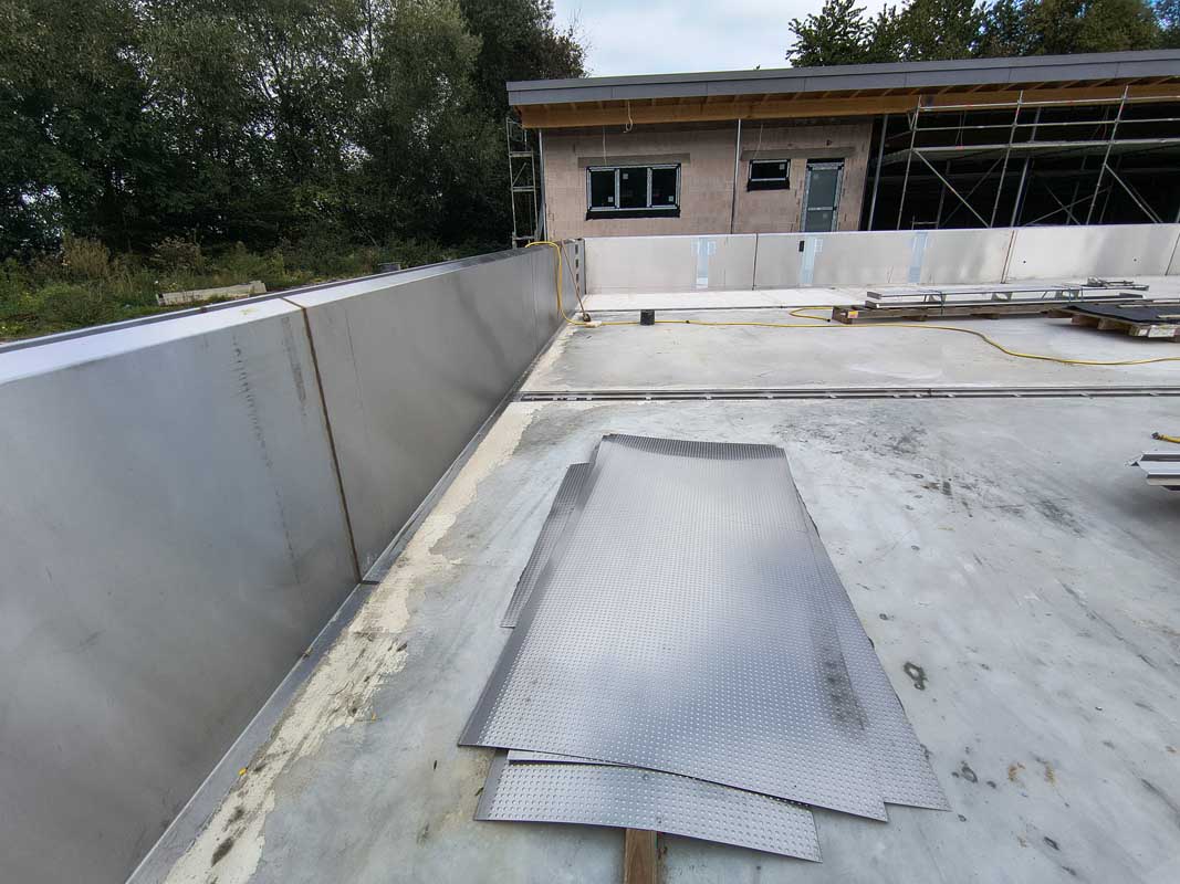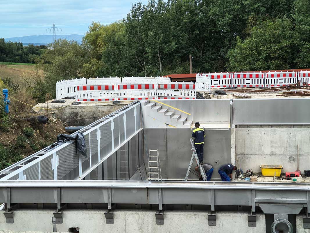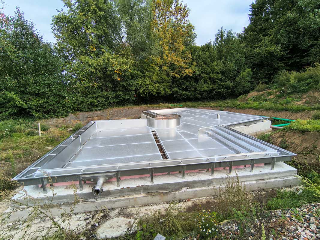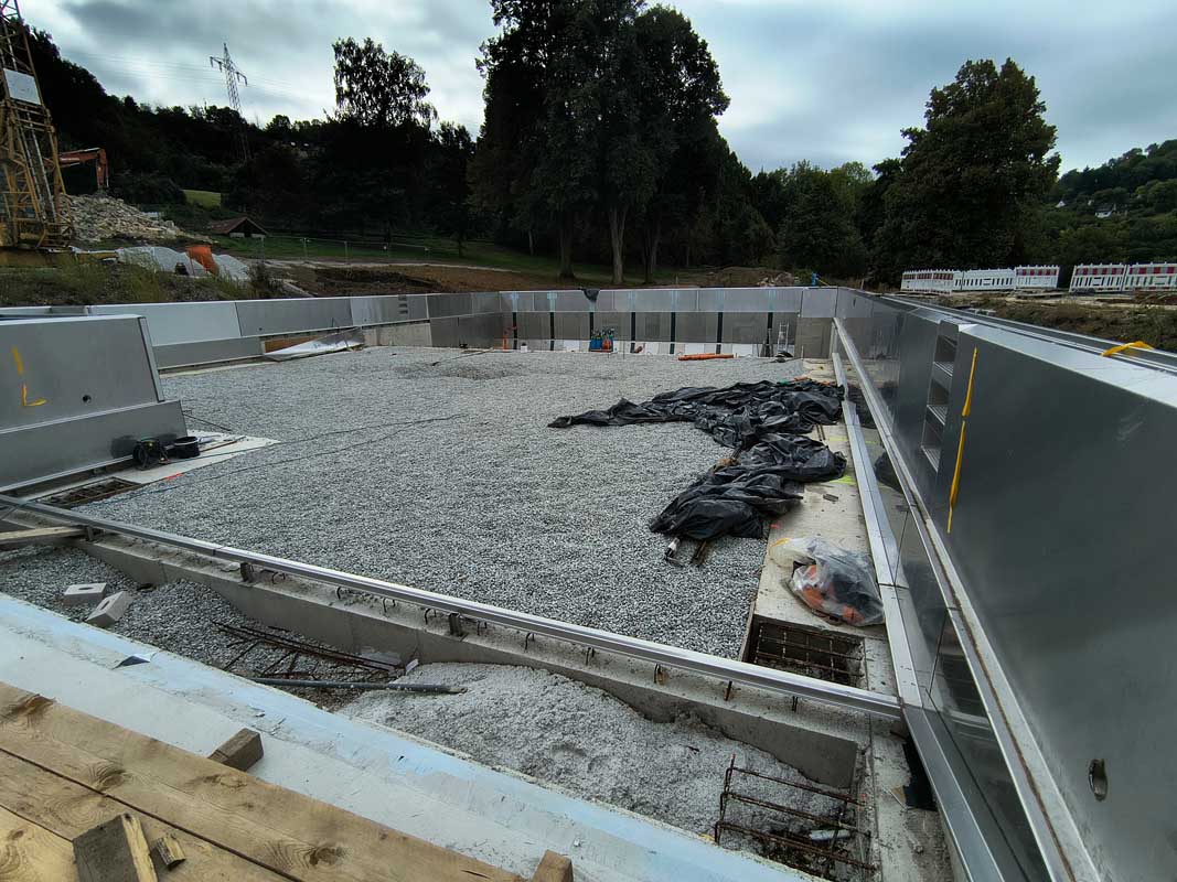 Am Schwimmbecken sind die Arbeiten weit fortgeschritten. Das Kinderplanschbecken ist in seiner Grundkonstruktion fertig, der Stahlboden wurde bereits installiert. Beim großen Schwimmbecken sind die äußeren Stahlwände gesetzt, weitere Elemente folgen. Der Beckenboden ist mit Beton ausgegossen, der Einbau des Edelstahlbodens und der Rohrleitungen steht bevor. Der Schwimmerbereich wird eine Tiefe von 3,65 Metern erreichen, sodass dort ein 3-Meter-Sprungturm Platz findet. Der Nichtschwimmerbereich wird zwischen 1,10 und 1,30 Meter tief sein.