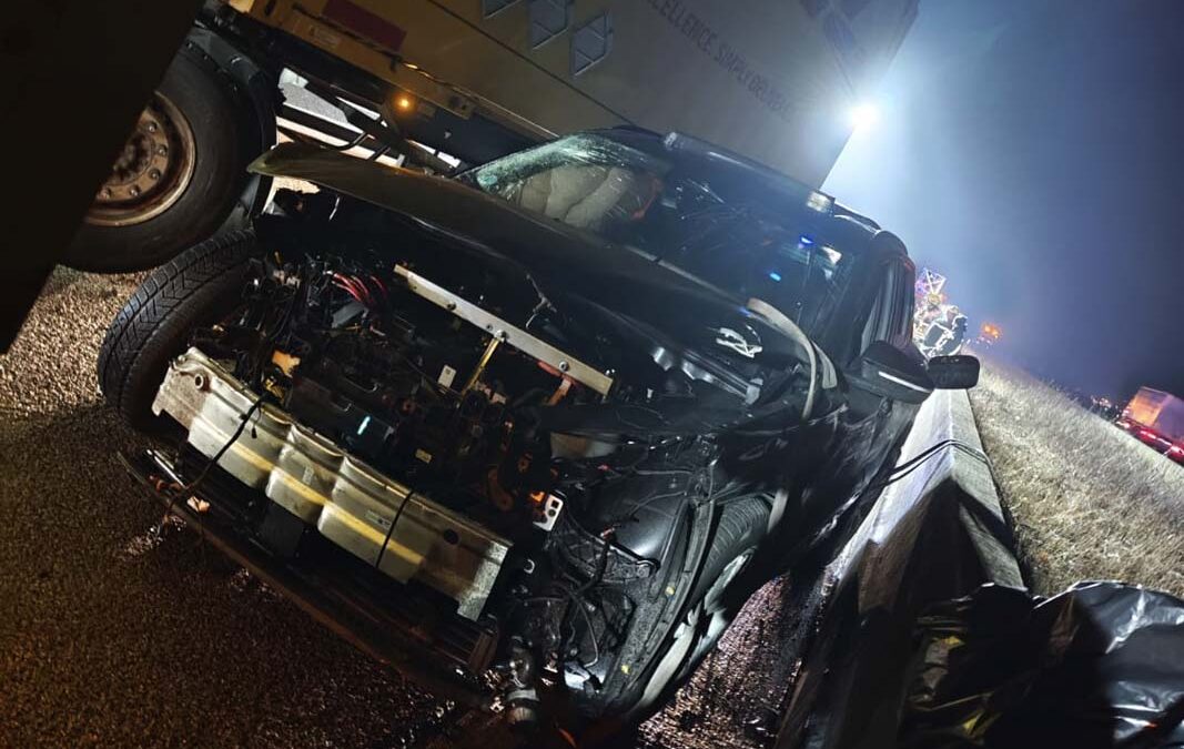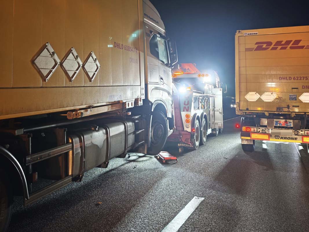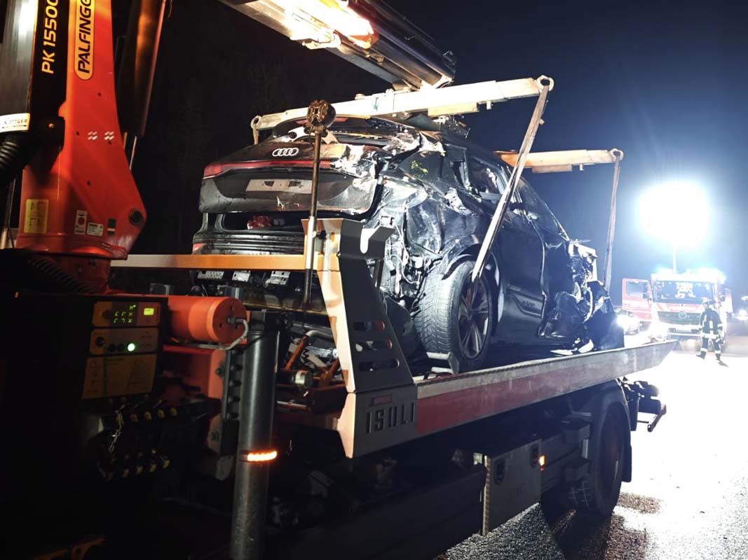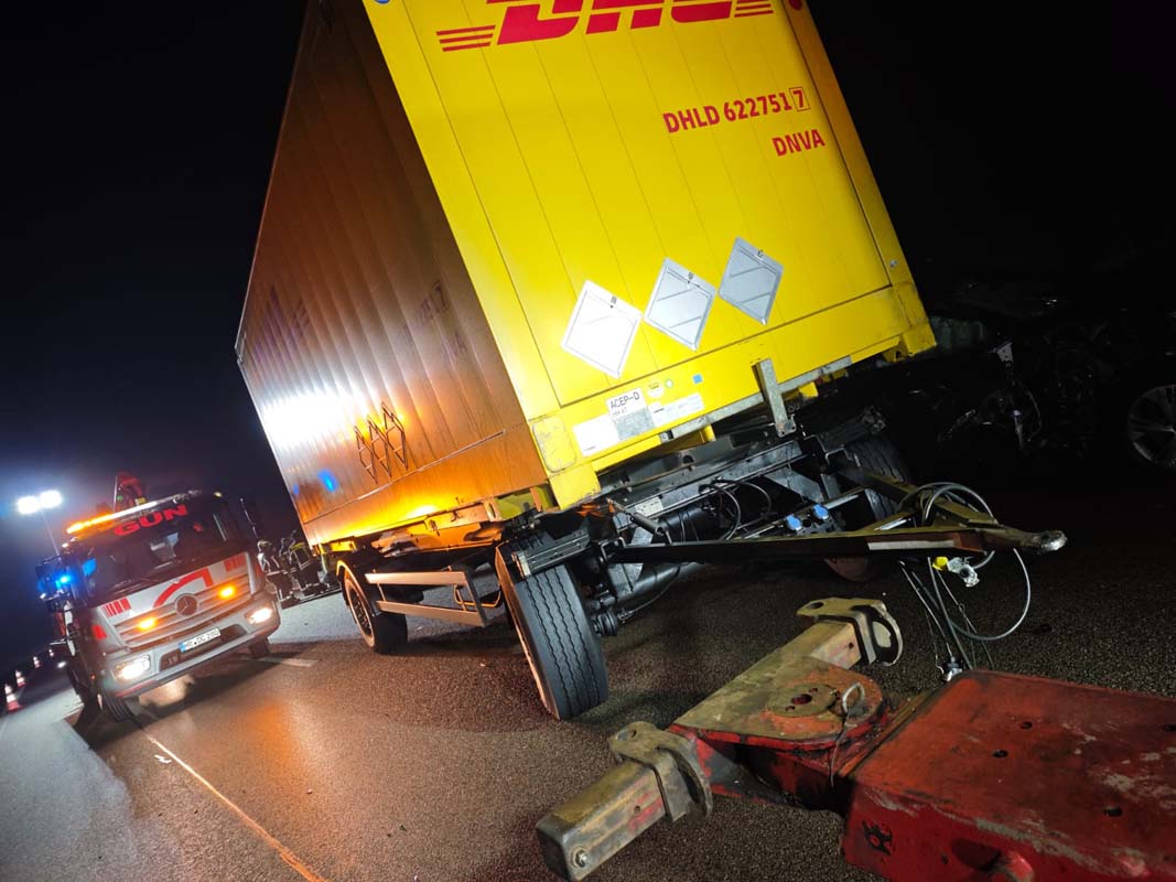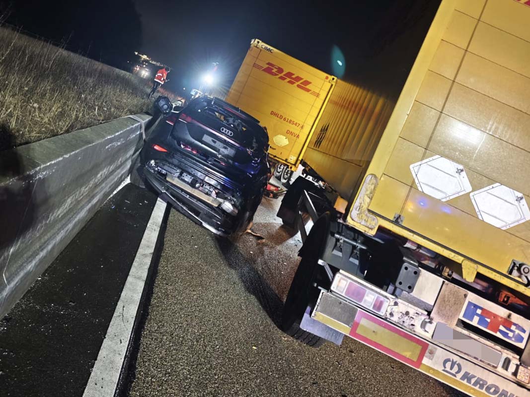 Der Audi touchierte den Lastzug aus dem Landkreis Ratzeburg seitlich und wurde zwischen diesem und der Betongleitwand eingeklemmt.