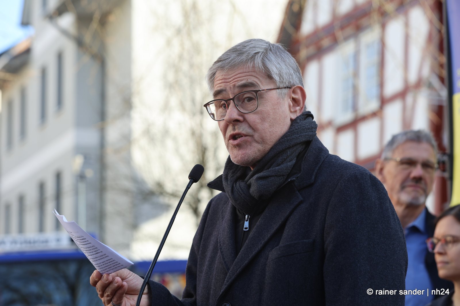Jochem Hamacher von „Mach Mit“ berichtet von Initiativen mitten in zwei Jahren Krieg, Töten, Sterben und unfassbarem Leid. Das Thema macht Angst. Der Vorsitzende der Stadtverordnetenversammlung, Jochen Noll, verknüpfte die Krise mit der aktuellen Diskussion hierzulande. Vielfalt macht jede Stadt lebendig. Es gelte, demokratiefeindlichen Handlungen entschieden entgegentreten. MdL Dominik Leyh sah Deutschland einst umzingelt von den Freunden der Demokratie. „Wir haben uns alle die Augen gerieben.“ Jetzt müsse man der Ukraine an die Hand geben, was sie braucht.