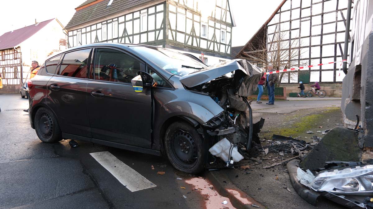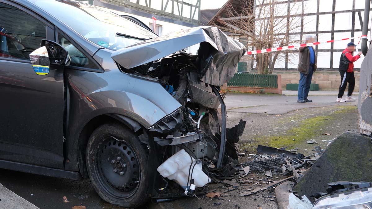 Die Frau geriet aus noch ungeklärter Ursache nach links von der Fahrbahn ab, überquerte die Gegenfahrbahn und prallte gegen eine Hauswand. Der Aufprall verursachte erhebliche Schäden an der Fahrzeugfront und am Sockel des Gebäudes.
