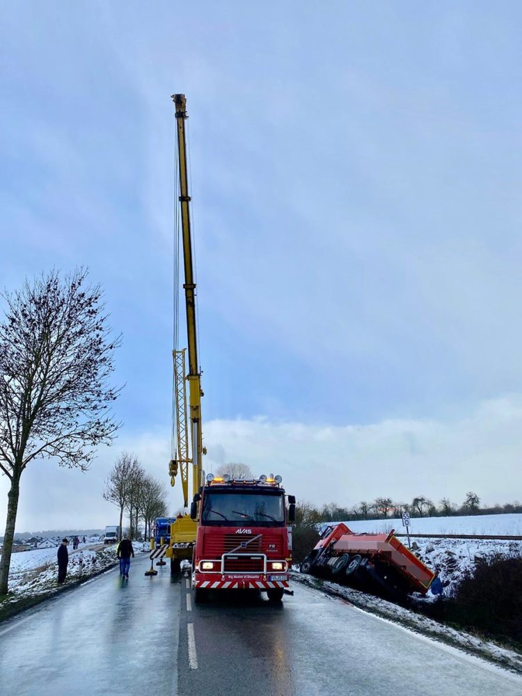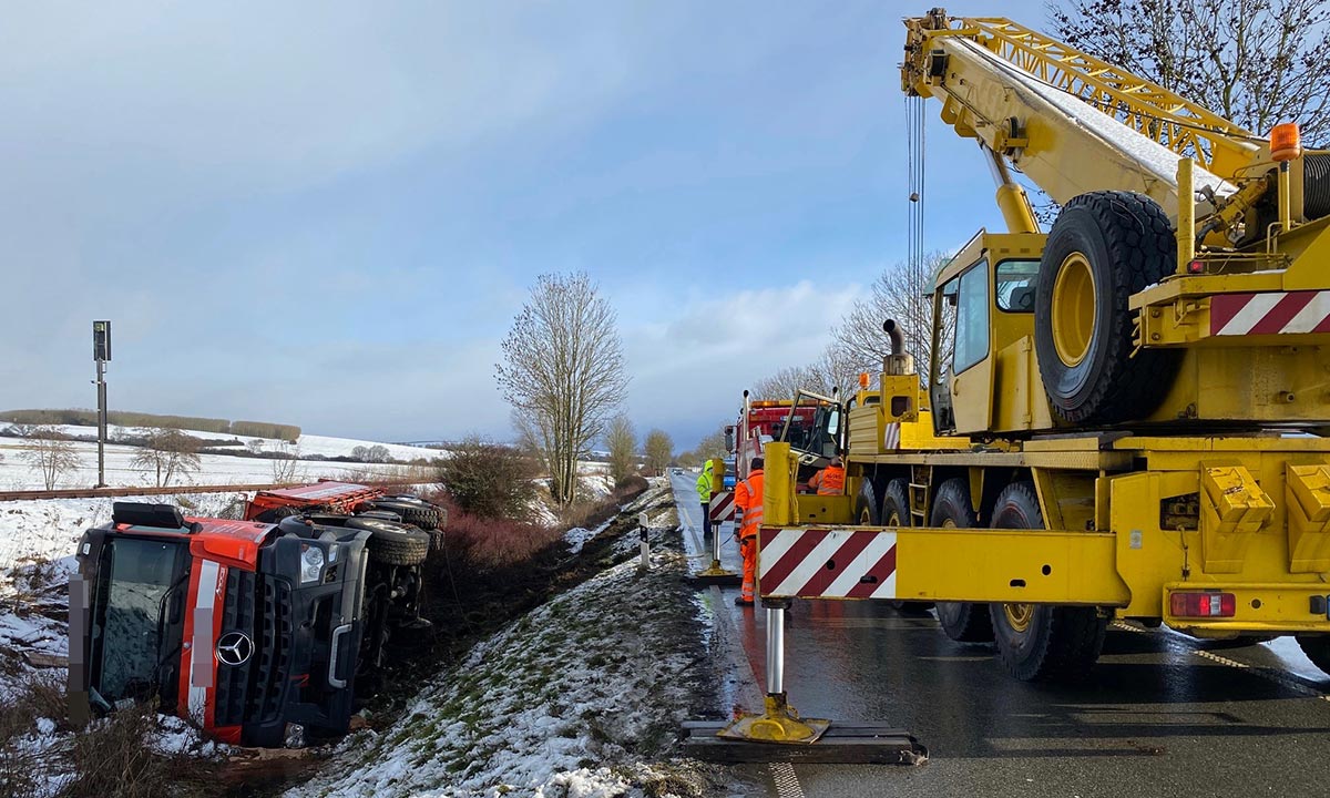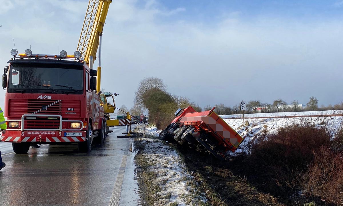 Der umgekippte Lkw musste mit der Hilfe eines Autokrans geborgen und anschließend von einem Bergeuntermehmen abgeschleppt werden.