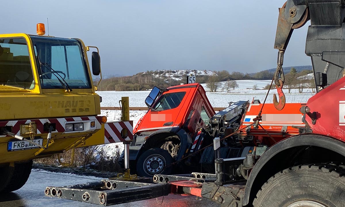 Der Lkw-Fahrer aus dem Landkreis Waldeck-Frankenberg verletzte sich dabei leicht. Ein Rettungsteam brachte den Mann vorsorglich in ein Krankenhaus.
