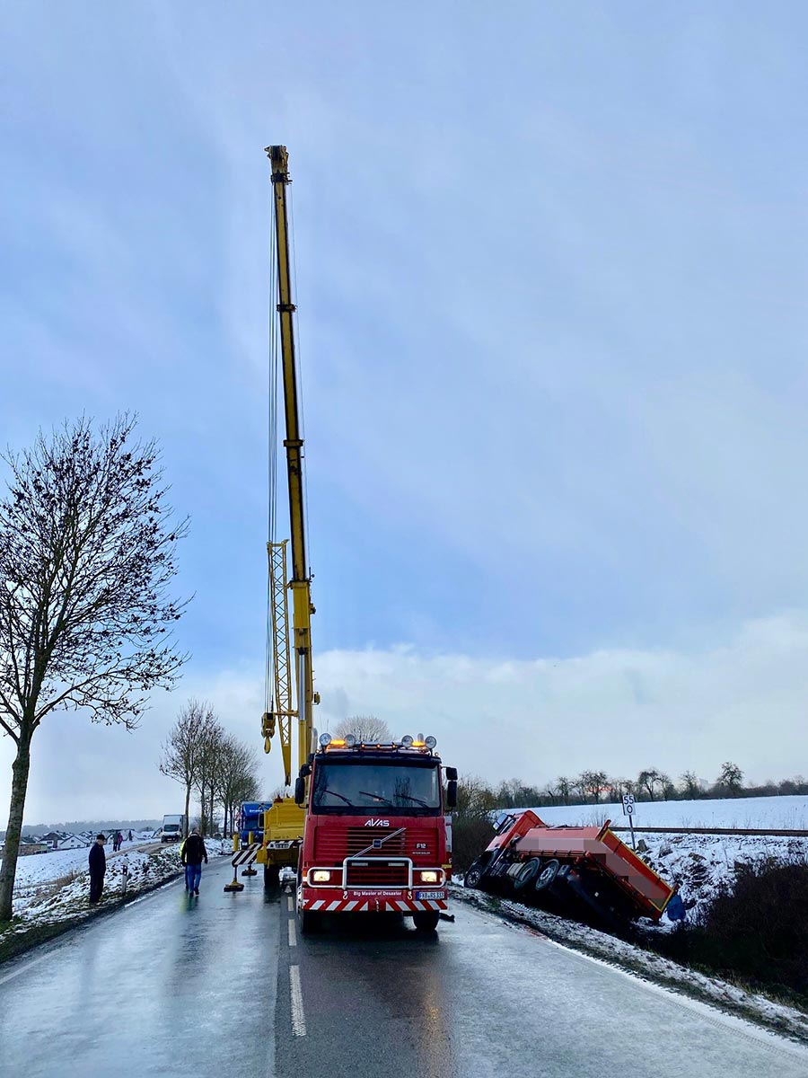 Der umgekippte Lkw musste mit der Hilfe eines Autokrans geborgen und anschließend von einem Bergeuntermehmen abgeschleppt werden.