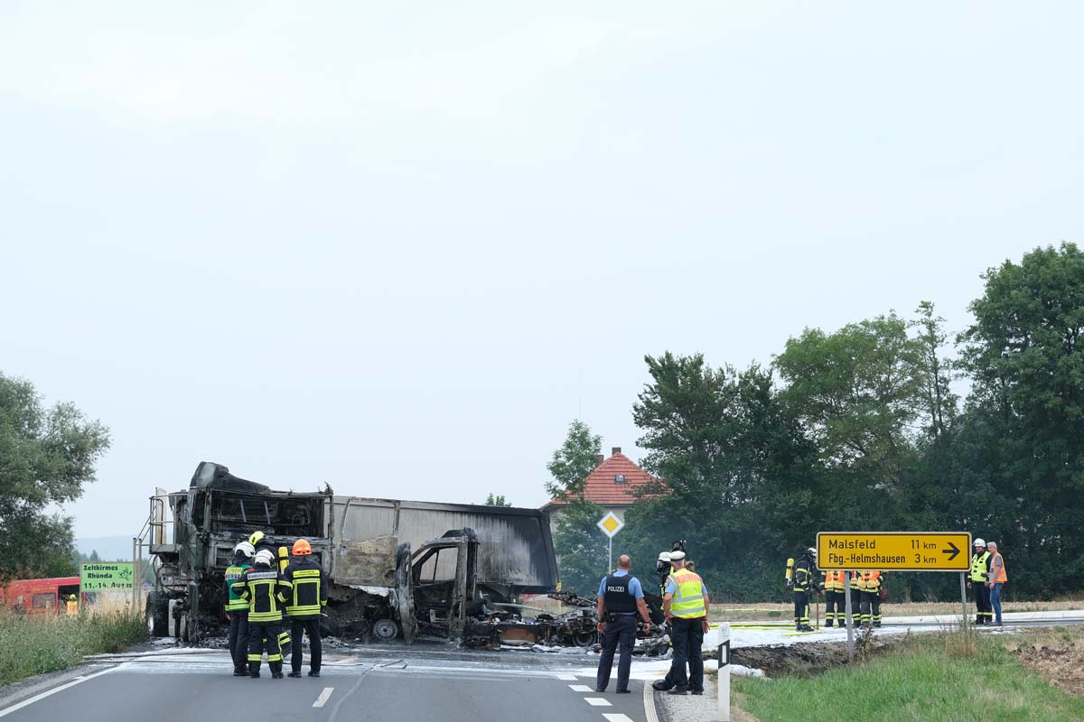 Der Unfall ereignete sich gegen 13:45 Uhr, wie ein Polizeisprecher in Homberg berichtet. Der Sattelzug, dessen Mulden-Auflieger voll mit einem Baustoff beladen war, wollte von der Landesstraße aus Richtung Malsfeld kommend nach links auf die Bundesstraße abbiegen. Zu dieser Zeit fuhr die Besatzung des Rettungswagens von Wabern in Richtung Gensungen. Der Rettungswagen, dessen Besatzung Vorfahrt hatte, prallte mit nicht sehr hoher Geschwindigkeit gegen den abbiegenden Lkw. Die Insassen der Fahrzeuge konnten sich selbstständig retten, bevor der Rettungswagen und der Lkw in Flammen aufgingen. Beide Fahrzeuge brannten vollständig aus. Feuerwehrleute aus Felsberg löschten den Brand.
