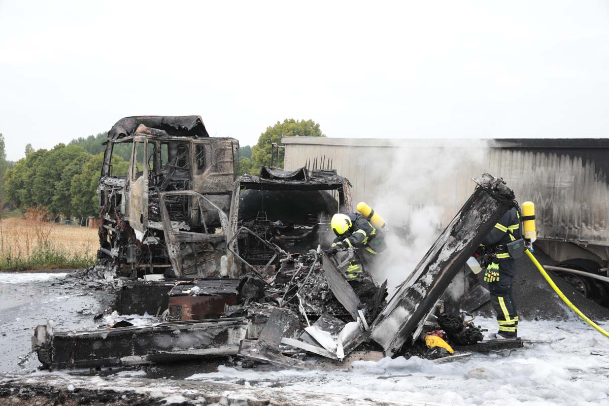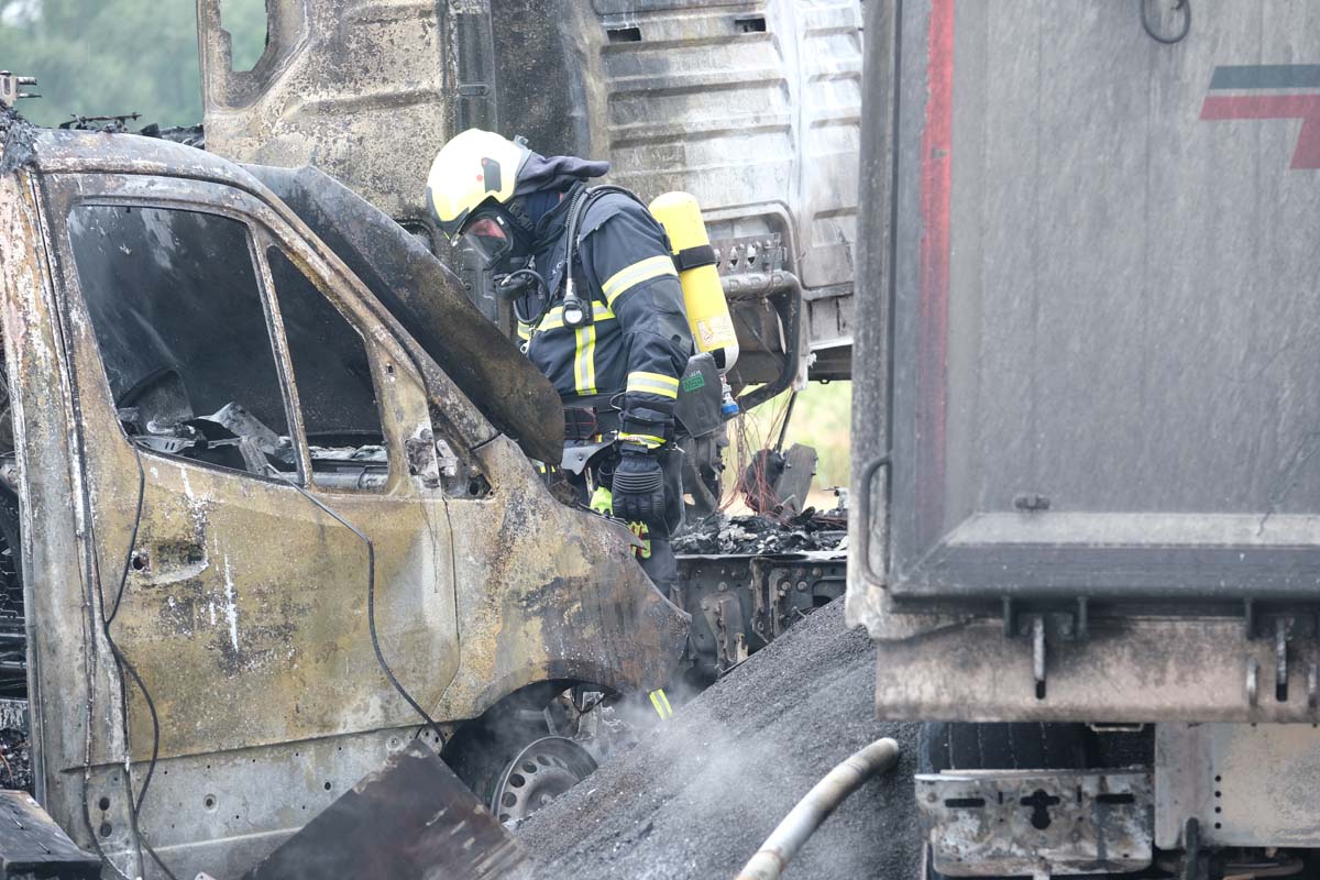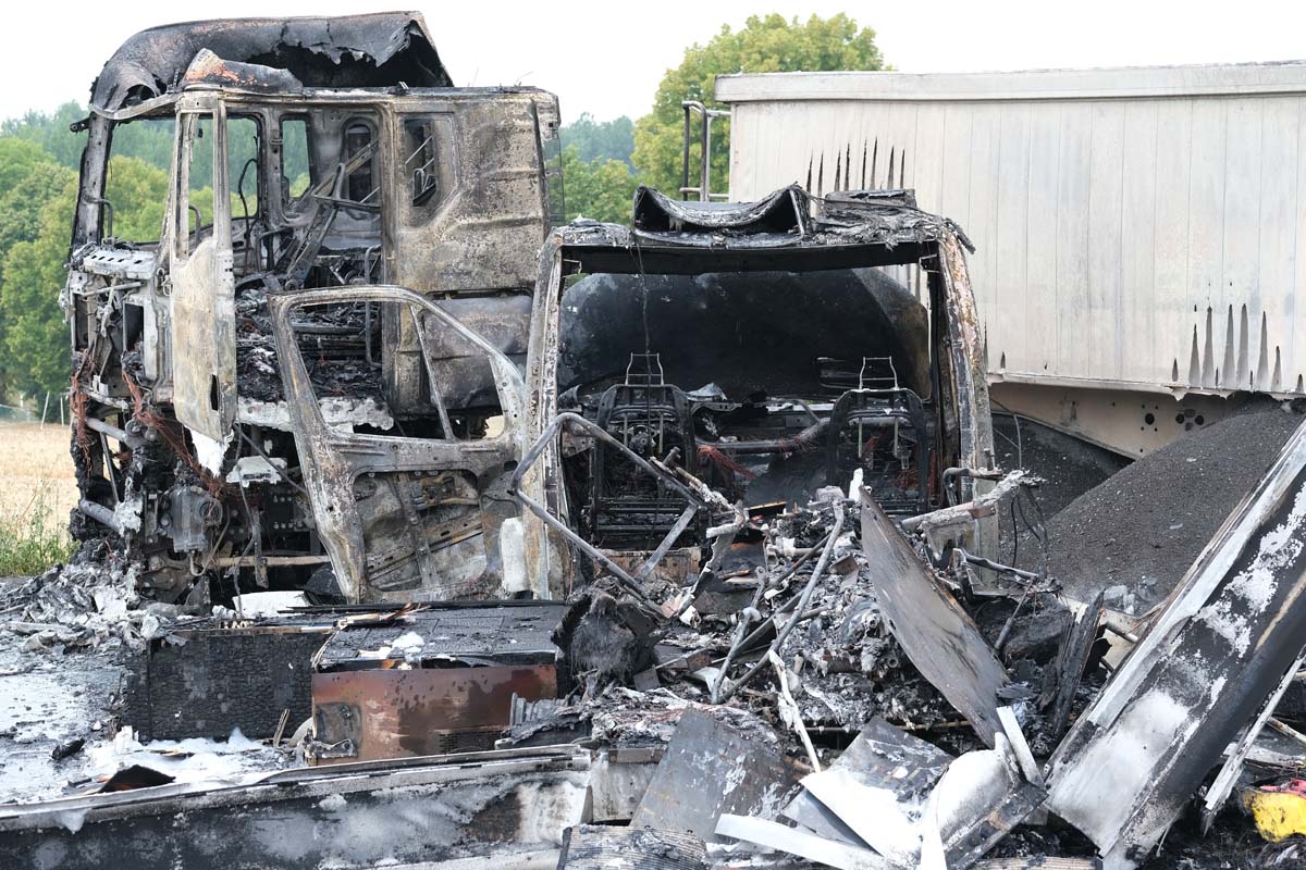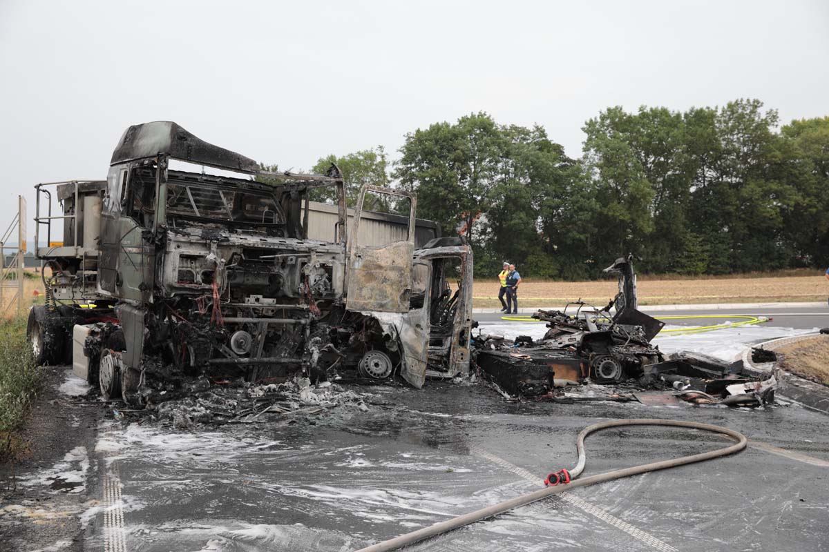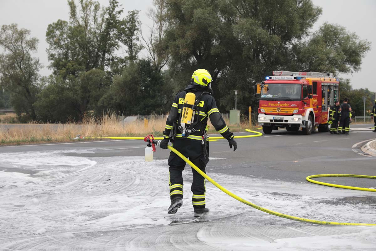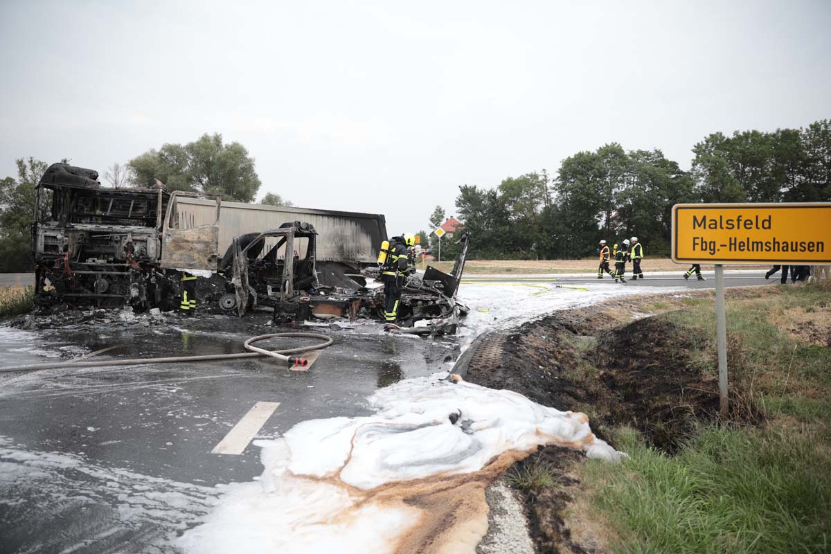 FELSBERG (wal). Bei einem Unfall im Kreuzungsbereich der Bundesstraße 253 und der Landesstraße 3427 in Höhe von Felsberg-Rhünda (Schwalm-Eder-Kreis) ist am Donnerstagmittag ein 25 Jahre alter Mann leicht verletzt worden. Die beiden Fahrzeuge, ein Rettungswagen (RTW) des DRKs und ein Sattelzug, brannten nach dem Unfall vollständig aus.