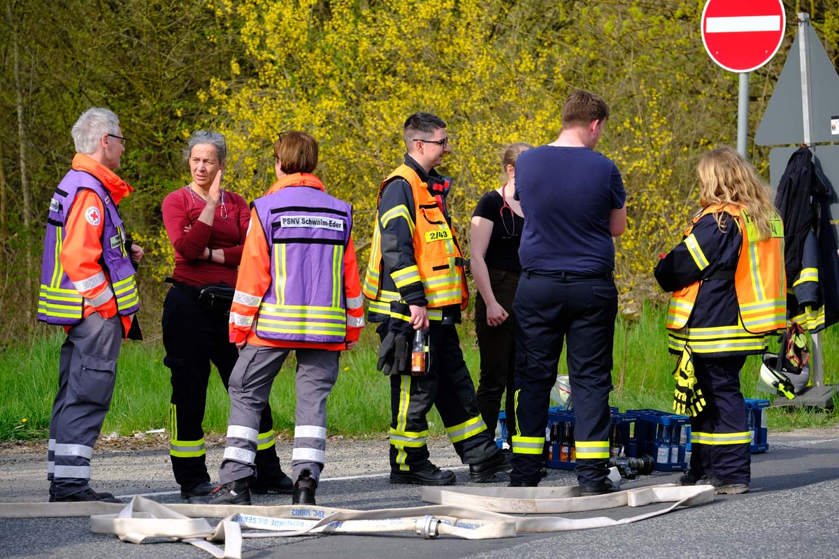 Zunächst gingen Gemeindebrandinspektor Neuwirth und seine Kameraden von mindestens einer eingeklemmten Person aus, so hieß es auch in der Alarmierung, was sich an der Unfallstelle aber nicht bestätigen sollte. Ersthelfer, Feuerwehrleute, unter ihnen auch die First Responder (Helfer vor Ort) Gilserbergs, leisteten den Verletzten bis zum Eintreffen des Rettungsdienstes Erste Hilfe. Im Anschluss übernahmen deren medizinische Versorgung vier Rettungs- und zwei Notarztteams, die Crews von zwei Rettungshubschraubern (Christoph 7 aus Kassel, und Christoph Gießen) ein Leitender Notarzt und ein Organisatorischer Leiter Rettungsdienst. Aufgrund der Dauer des Einsatzes und der Vielzahl der eingesetzten Kräfte war auch ein Sanitätszug des DRK im Einsatz. Vor Ort waren zudem ein Team der Psychosozialen Notfallversorgung (PSNV – die Teams leisten Akuthilfe nach Verkehrsunfällen, Gewalttaten oder Großschadensereignissen bei Betroffenen und auch Einsatzkräften) sowie Notfallseelsorger und Gilserbergs Bürgermeister Rainer Barth.