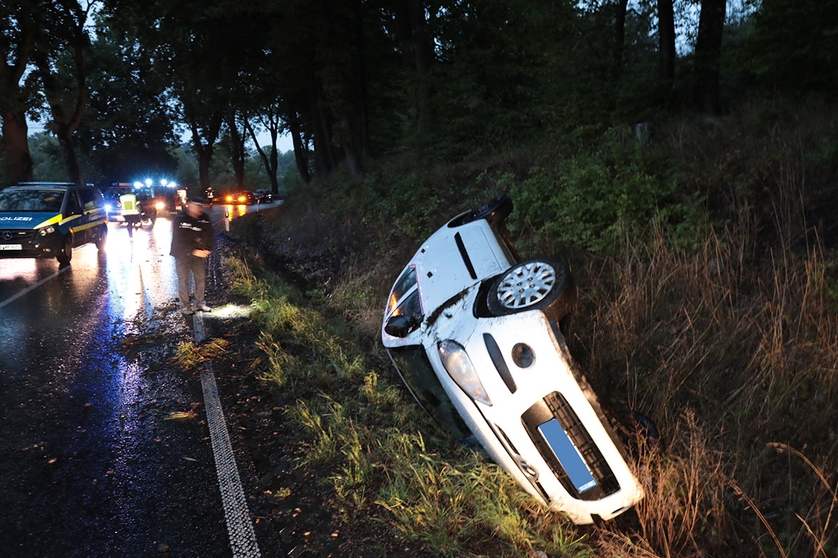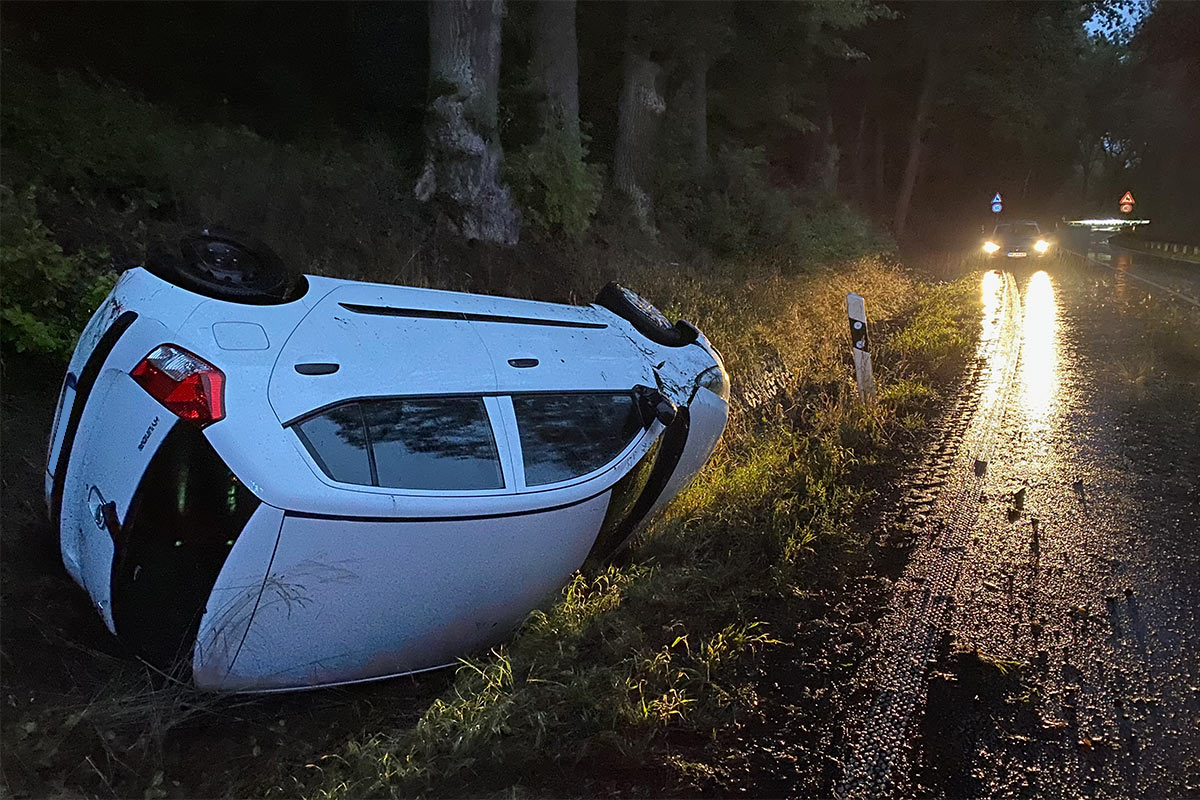 SCHWALMSTADT-WIERA / NEUSTADT (wal). Im strömenden Regen verlor am frühen Sonntagabend eine Autofahrerin aus Neustadt auf der B 454 zwischen Schwalmstadt-Wiera (Schwalm-EderKreis) und Neustadt im Landkreis Marburg-Biedenkopf die Kontrolle über ihren Kleinwagen. Der Pkw kam auf der Seite liegend im Straßengraben zum Stillstand.