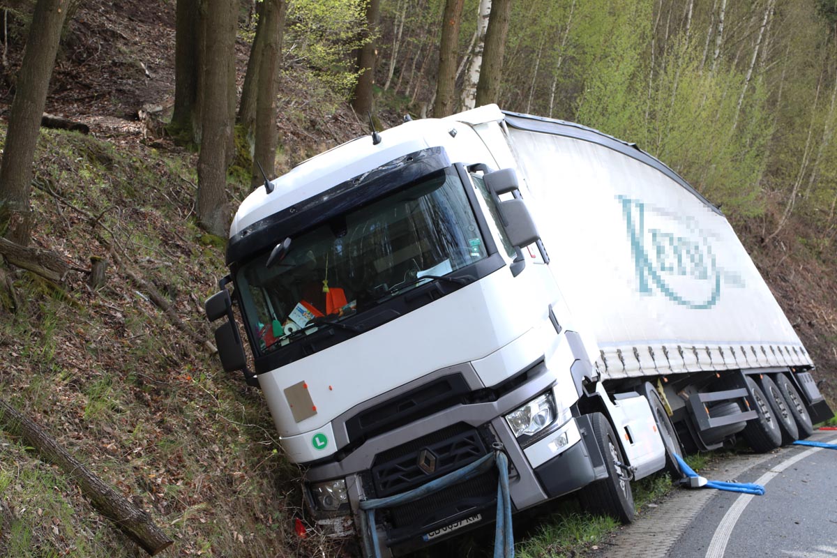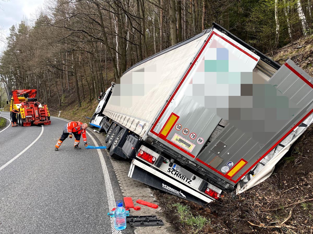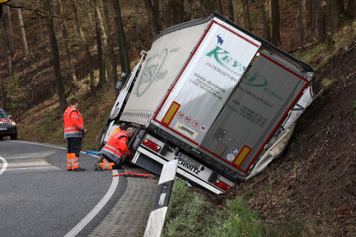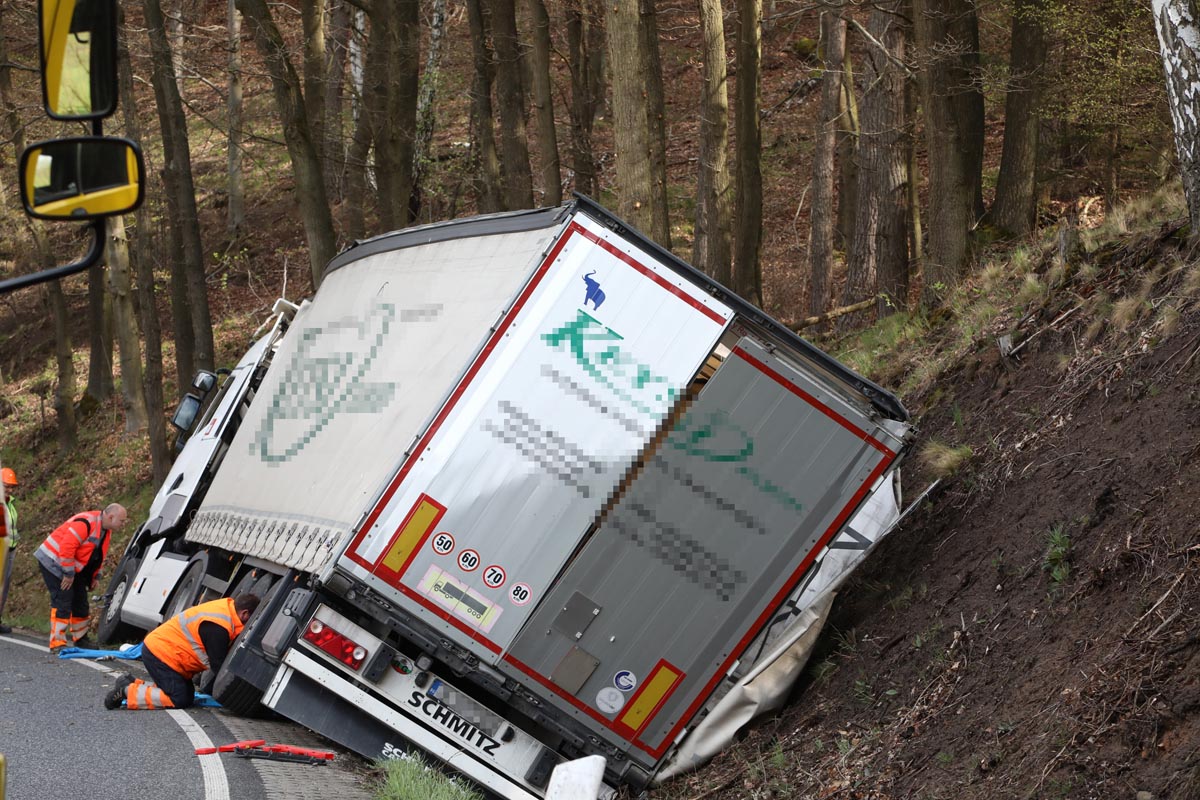 Die hohe Böschung hielt den unbeladenen Sattelzug, der leicht auch die rechte Seite kippte.