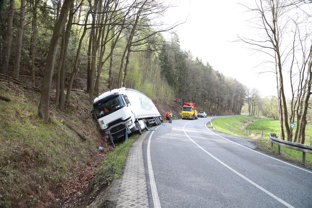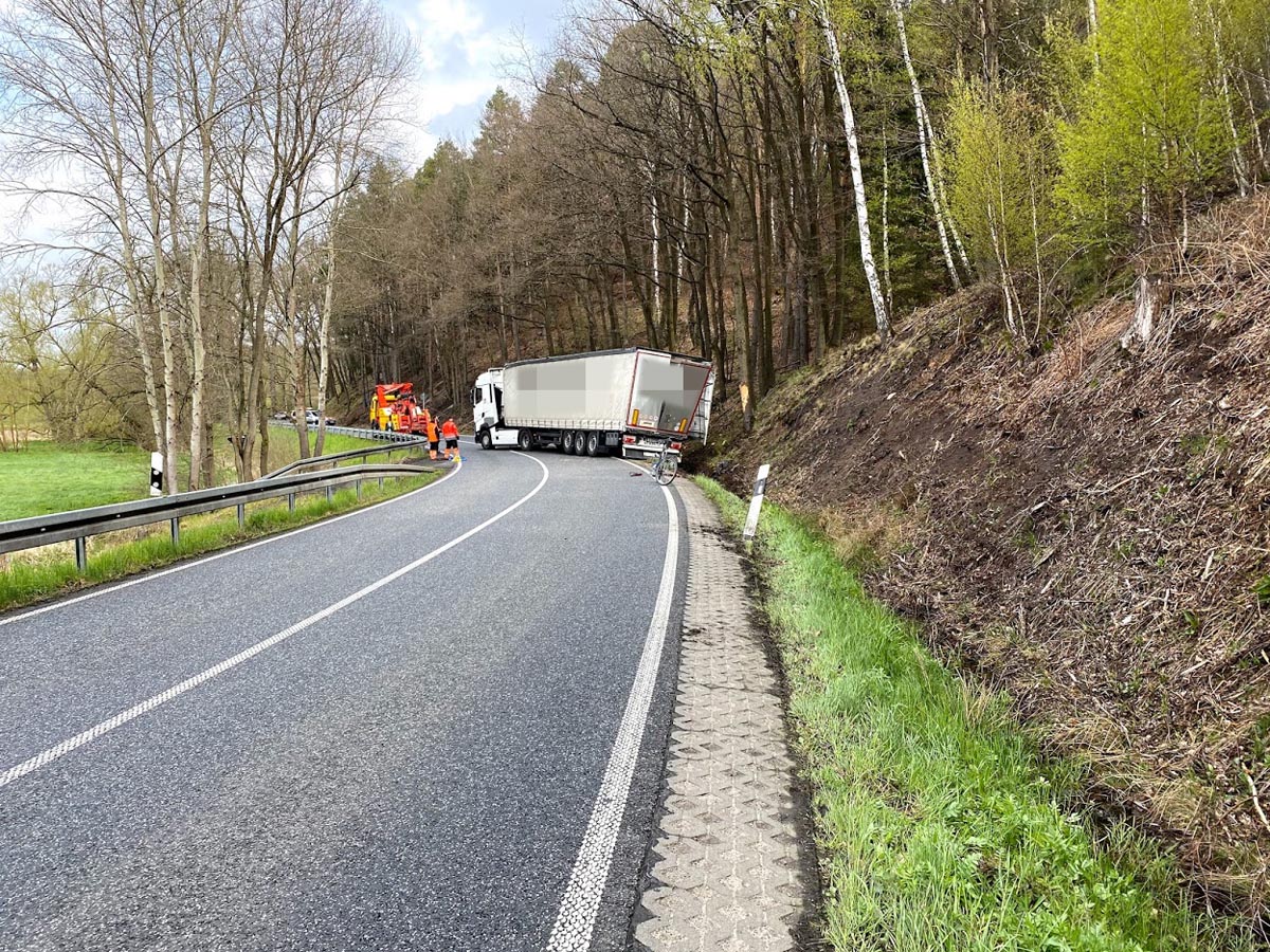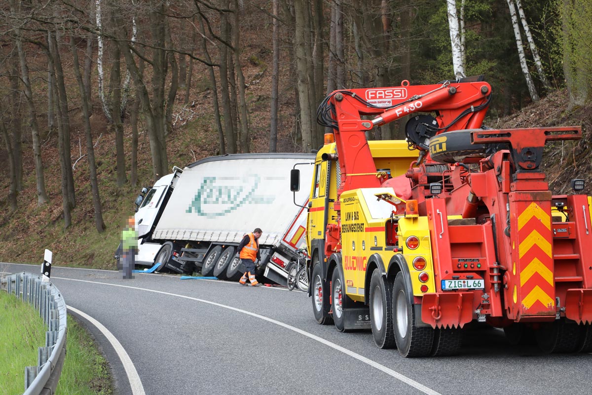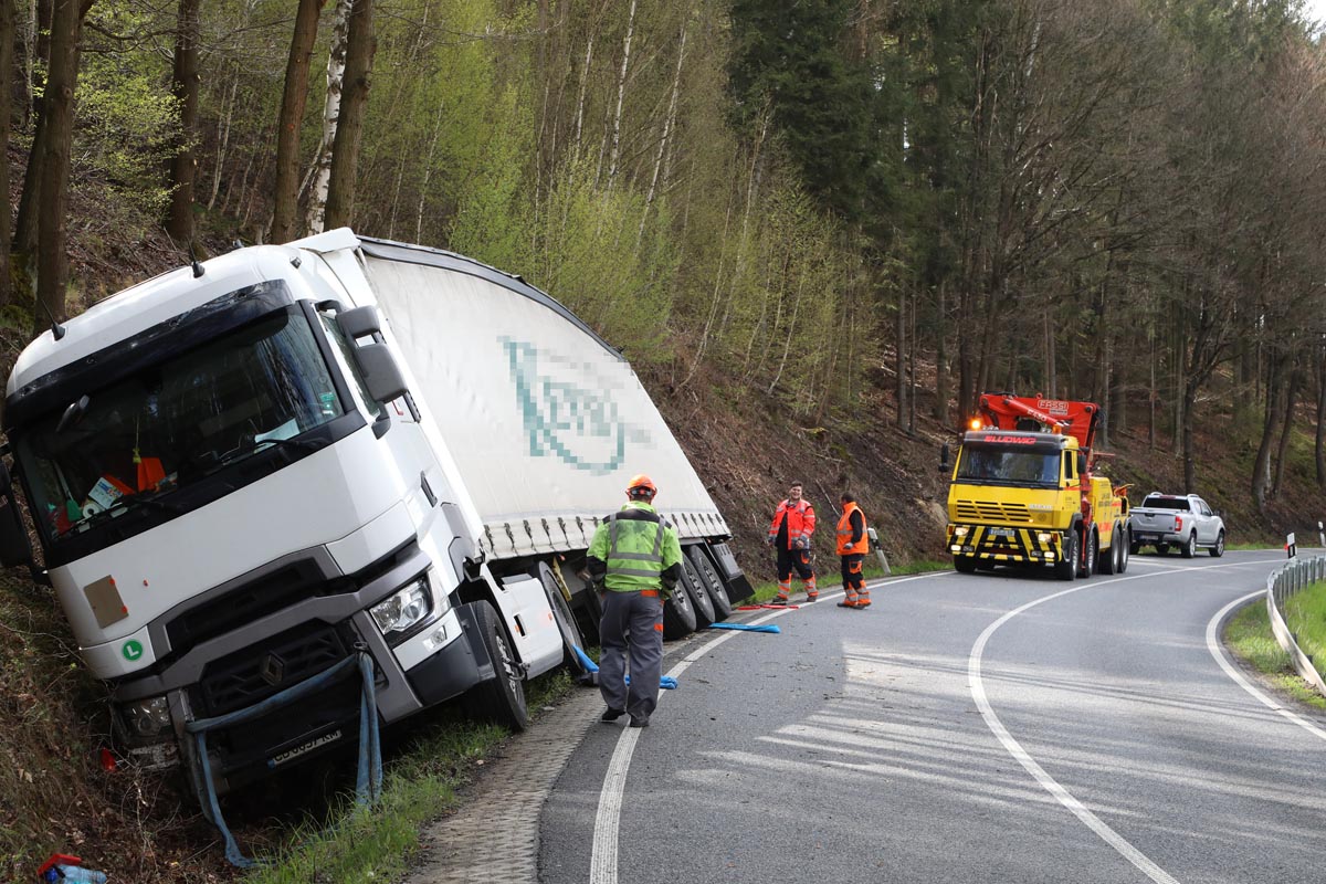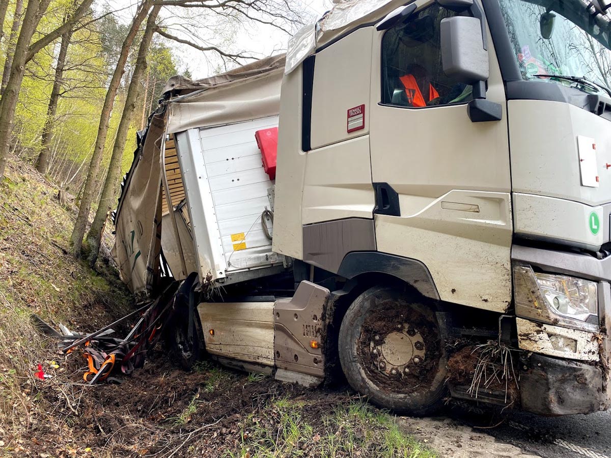 Die hohe Böschung hielt den unbeladenen Sattelzug, der leicht auch die rechte Seite kippte.