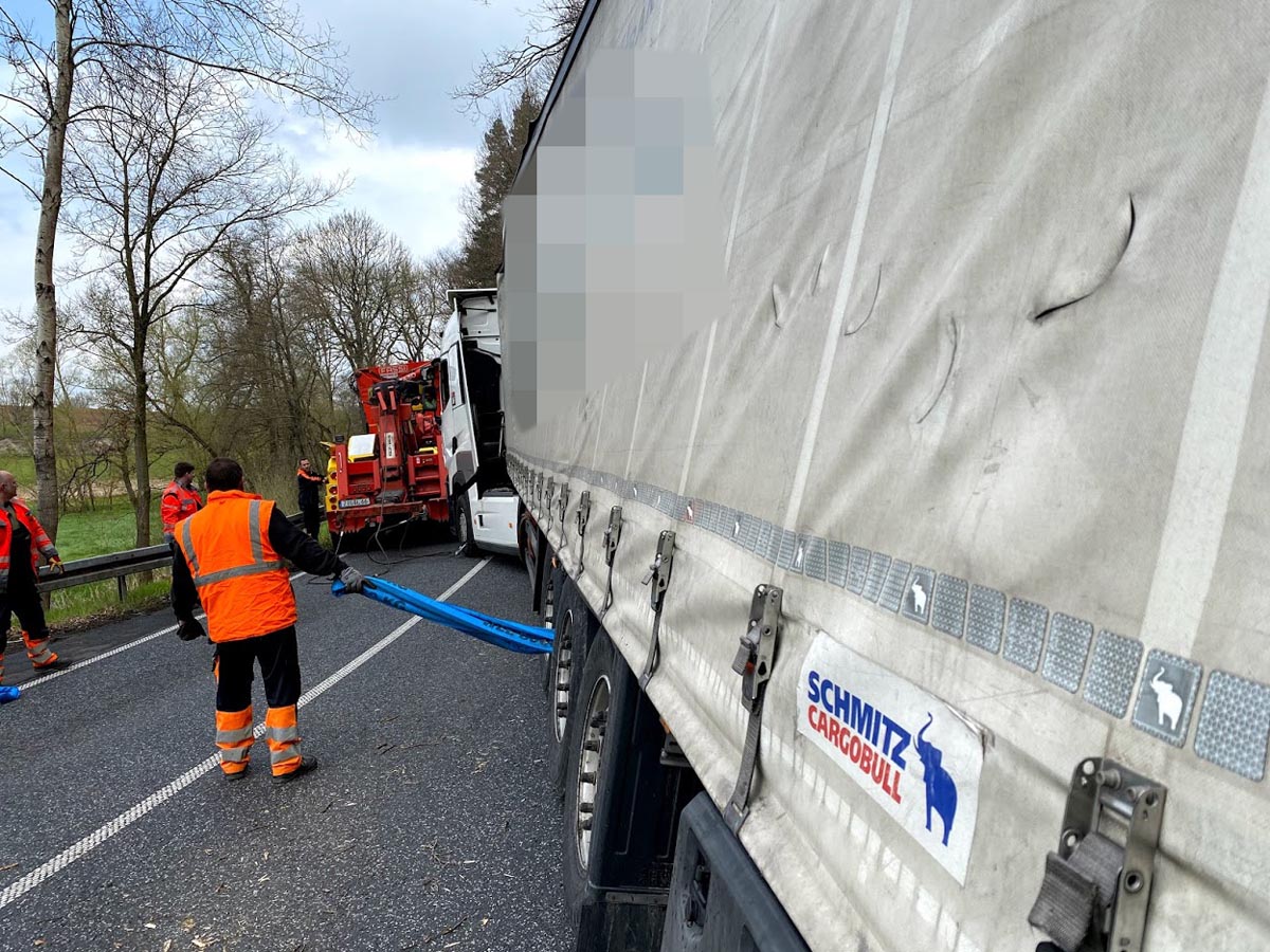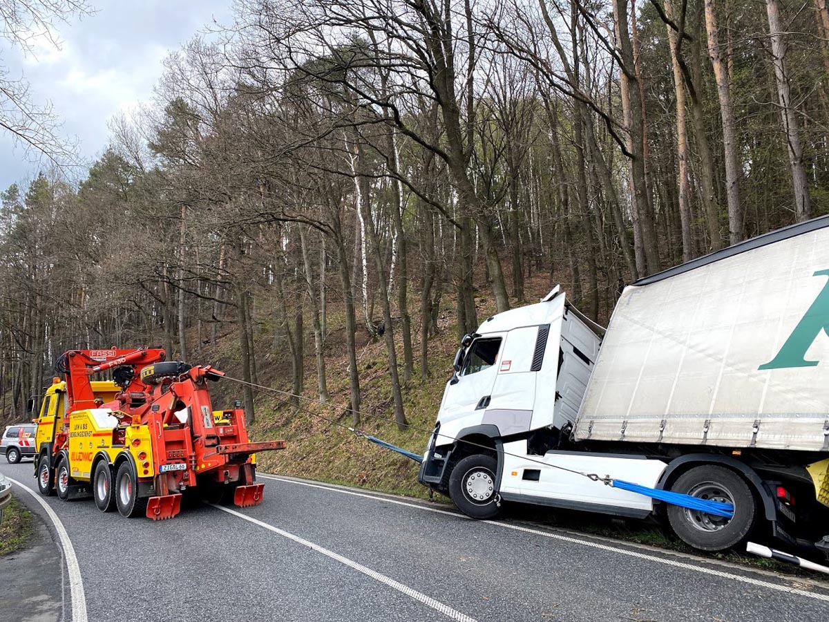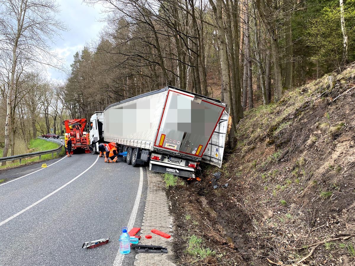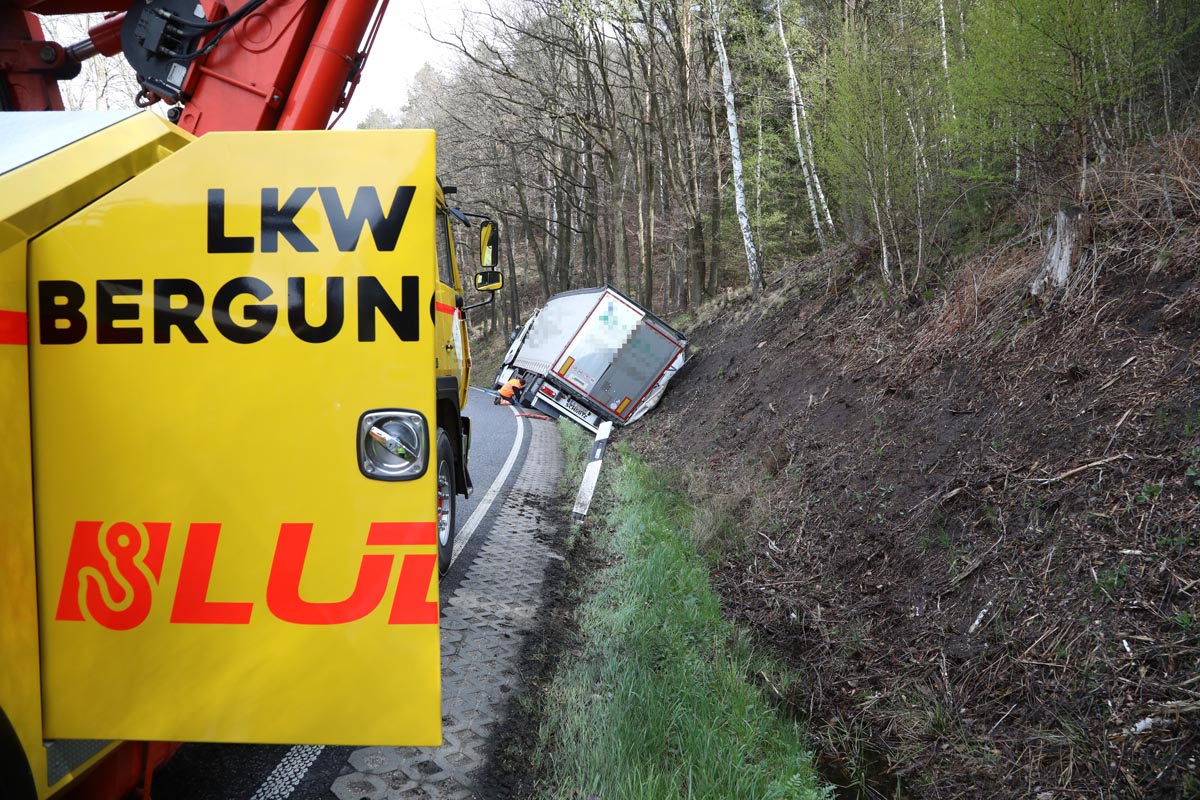 Die hohe Böschung hielt den unbeladenen Sattelzug, der leicht auch die rechte Seite kippte.