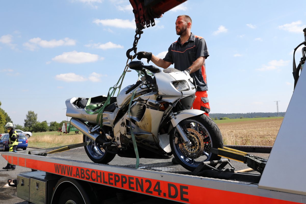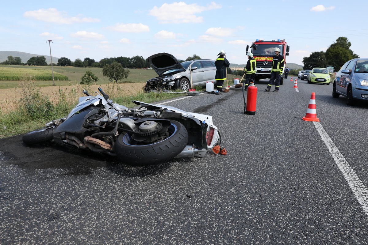 Wie uns ein Beamter der Polizeistation Schwalmstadt vor Ort sagte, war die 52-jährige Pohlheimerin (Landkreis Gießen) mit ihrer gut 20 Jahren alten Maschine von Lischeid kommend in Richtung Gilserberg unterwegs. Sie wollte gemeinsam mit ihrem Ehemann, der mit seinem Motorrad etwas Vorsprung hatte, ihren 92 Jahre alten Vater in Kassel besuchen. Kurz vor Gilserberg überholte sie ein Fahrzeug und übersah dabei den entgegenkommenden Passat eines Mannes aus dem Landkreis Göttingen. Die 52-Jährige hinterließ eine 15 Meter lange Bremsspur, verlor die Kontrolle über ihre Maschine und kam zu Fall. Geistesgegenwärtig gelang es ihr, sich von der Maschine zu trennen. Das schwere Motorrad prallte frontal in den entgegenkommenden Passat, die 52-Jährige verletzte sich nur leicht. Auch die drei Insassen des Passat aus Ebergötzen, der 42 Jahre alte Fahrer, seine Lebensgefährtin (40) und deren 19-jährige Tochter wurden glücklicherweise nur leicht verletzt.