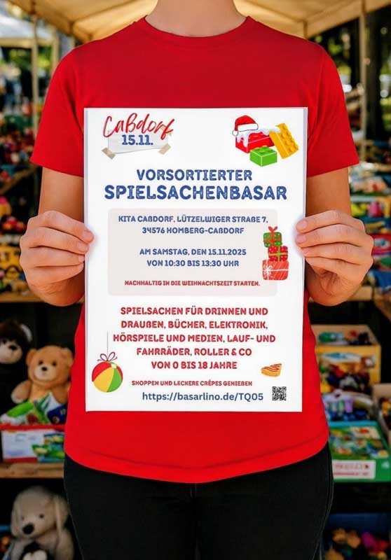 Nach dem erfolgreichen Start im Herbst vergangenen Jahres und zwei weiteren Veranstaltungen folgt nun ein besonderer Basar unter dem Motto „Nachhaltig in die Weihnachtszeit“. Der vorsortierte Spielsachenbasar findet am Samstag, 15. November 2025, von 10:30 bis 13:30 Uhr in der Kita Caßdorf, Lützelwiger Straße 7, statt. Das Datum wurde bewusst vor die „Black Week“ gelegt, um eine nachhaltige und kostengünstige Alternative zum herkömmlichen Geschenkekauf zu bieten.