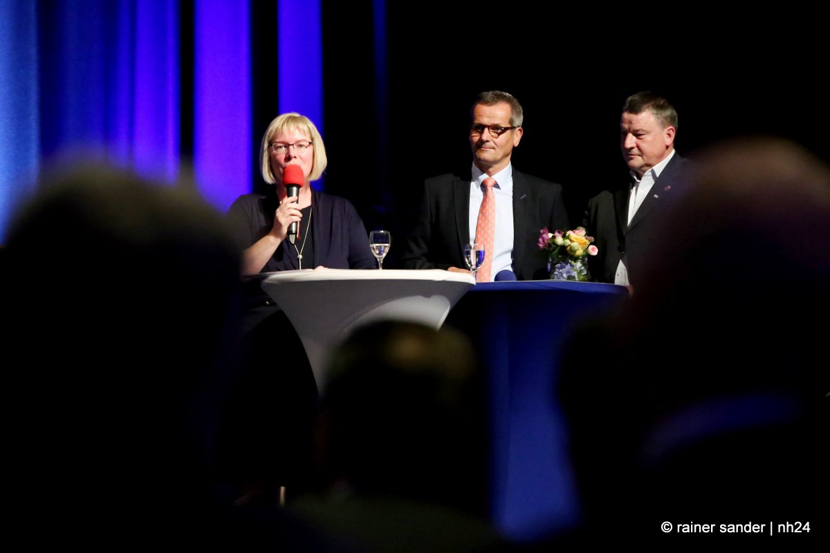 - Silke Engler mit Werkschef Thorsten Jablonski und Betriebsratschef Carsten Bätzold beim Festakt 60 Jahre VW ©Foto: Rainer Sander | nh24