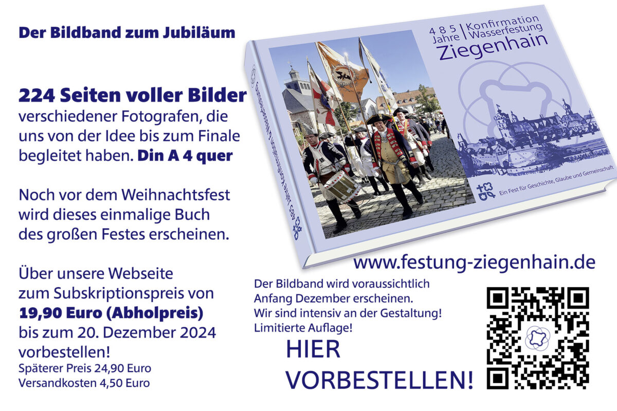 SCHWALMSTADT-ZIEGENHAIN. Nach dem überwältigenden Erfolg des Festungsjubiläums im September, das über 10.000 Besucher und 1.500 Teilnehmer in die Konfirmationsstadt lockte, kündigt das Organisationsteam die Veröffentlichung eines umfangreichen Bildbands an. Dieses Werk mit 224 Seiten und Hunderten von Fotografien wird die unvergesslichen Momente des Festes festhalten und soll am 4. Dezember 2024 erscheinen.