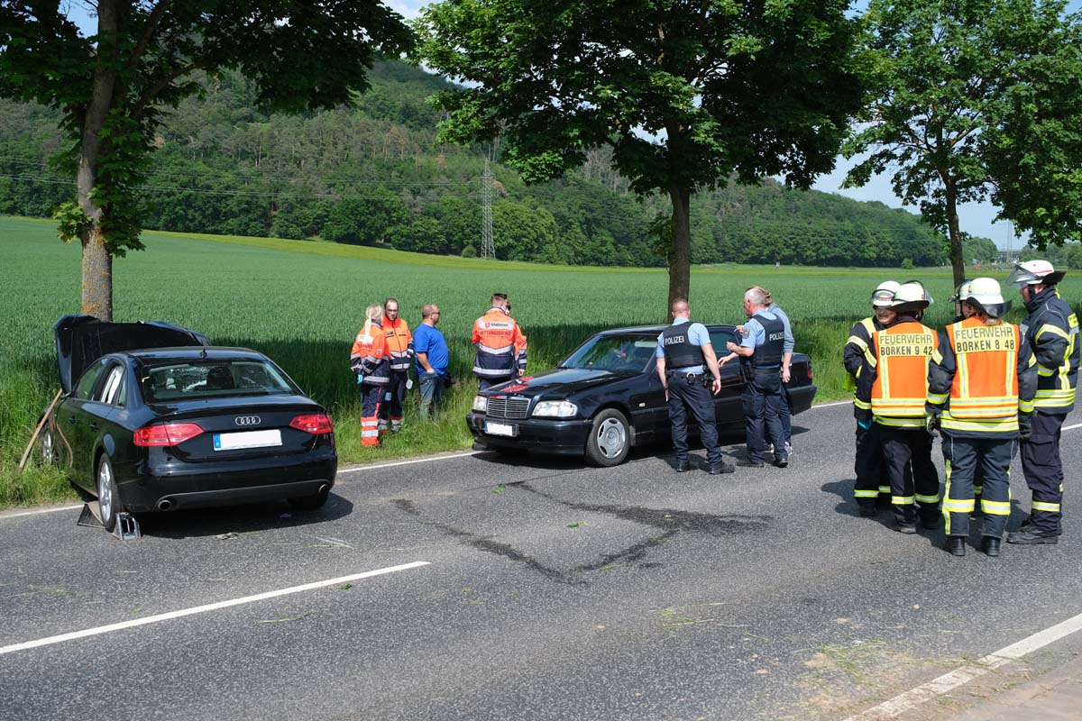 Es war gegen 15 Uhr, als der 53-Jährige die Kontrolle über den Audi verlor. Das Auto durchbrach einen Zaun, durchfuhr geradeaus eine Koppel, auf der sich zu diesem Zeitpunkt Pferde befanden, durchbrach einen weiteren Zaun, überquerte die B 3 kurz vor dem Ortseingang von Kerstenhausen und prallte frontal gegen einen Baum. Eine Autofahrerin (63) aus Borken, die mit ihrem Mercedes in Richtung Kerstenhausen fuhr, touchierte den zum Stillstand gekommenen Pkw auf dessen Beifahrerseite noch leicht.