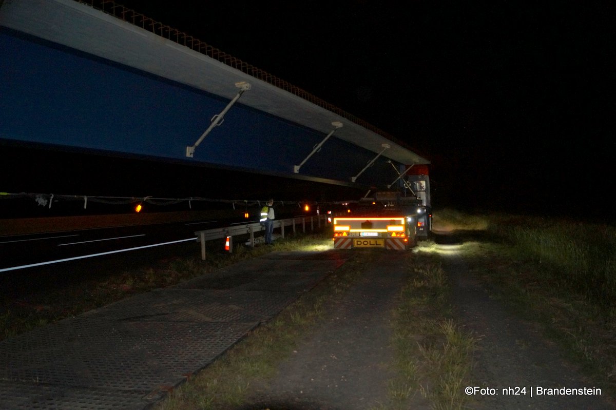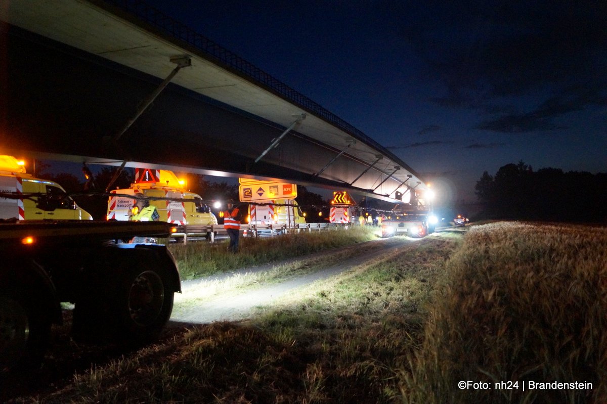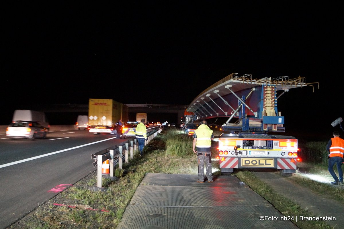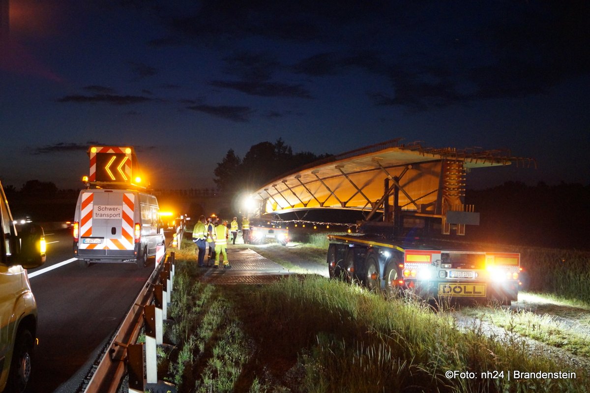 Durch die verzögerte Ankunft der Brückenteile erhöhte sich der Zeitdruck an der Baustelle massiv, da der eigens für die knapp 50 Tonnen Teile auf der Baustelle aufgestellte Spezialkran am Montag Richtung Belgien abfahren muss. Am späten Freitagabend war es dann so weit, über eine Alternativroute, hierzu wurde ein Genehmigungsverfahren mit Dringlichkeitsvermerk von der Gemeinde gestellt, bewegte sich der Tross Richtung A7.