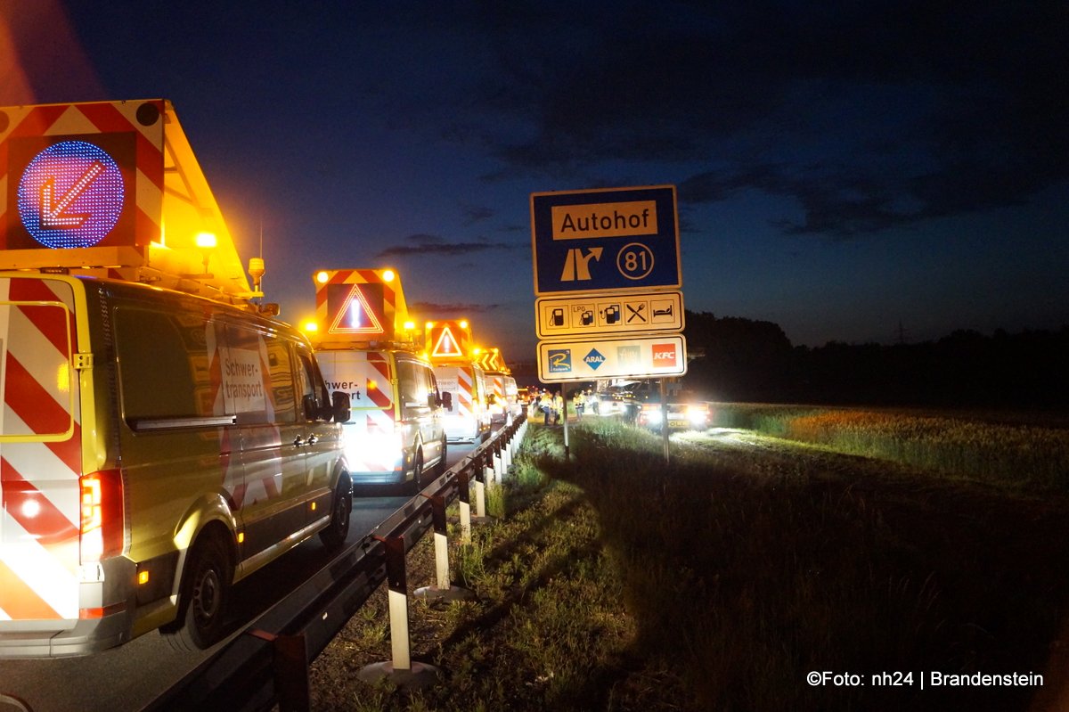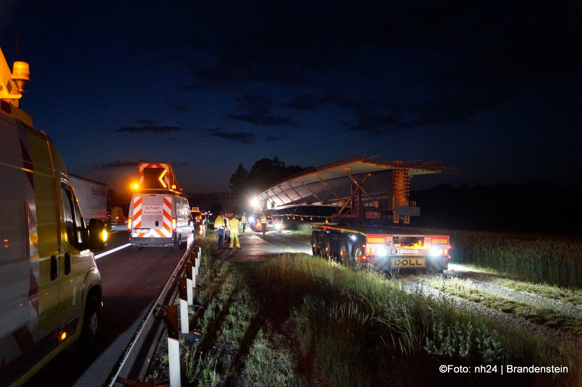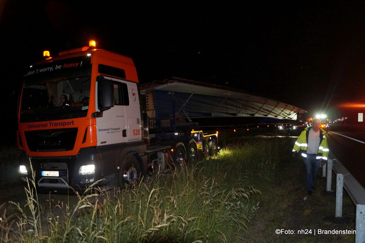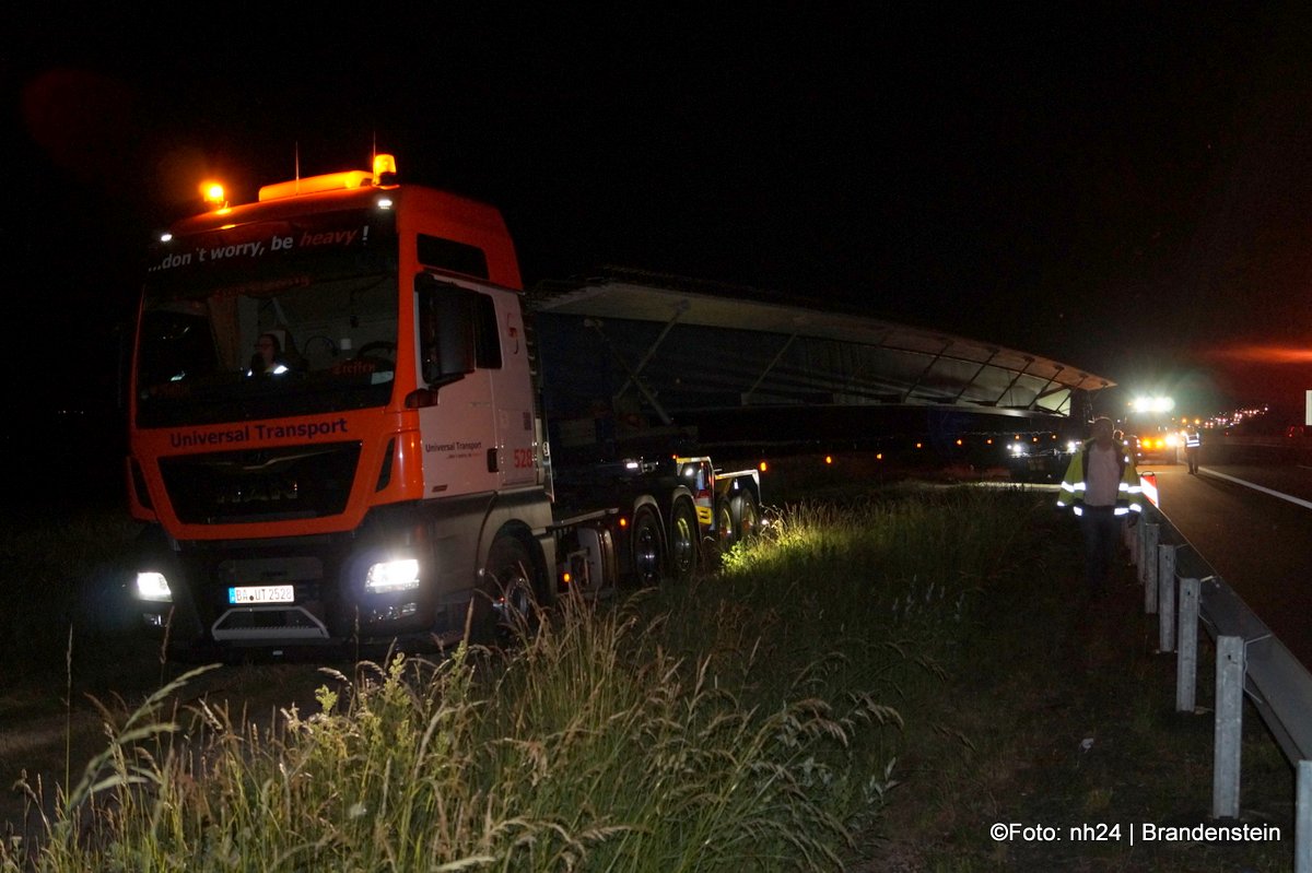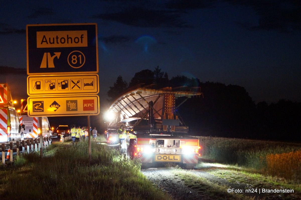Durch die verzögerte Ankunft der Brückenteile erhöhte sich der Zeitdruck an der Baustelle massiv, da der eigens für die knapp 50 Tonnen Teile auf der Baustelle aufgestellte Spezialkran am Montag Richtung Belgien abfahren muss. Am späten Freitagabend war es dann so weit, über eine Alternativroute, hierzu wurde ein Genehmigungsverfahren mit Dringlichkeitsvermerk von der Gemeinde gestellt, bewegte sich der Tross Richtung A7.