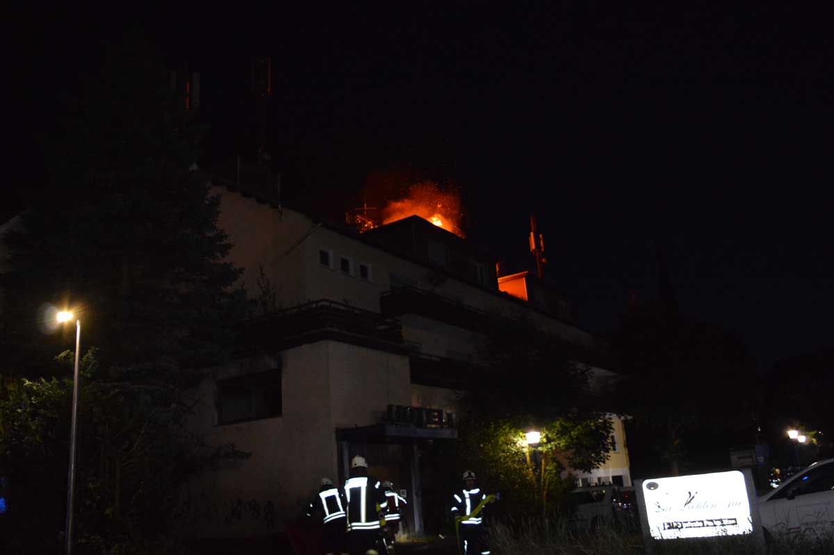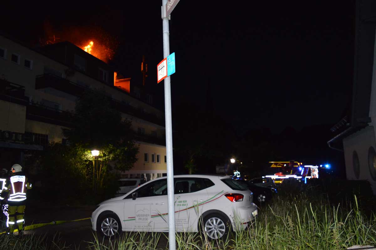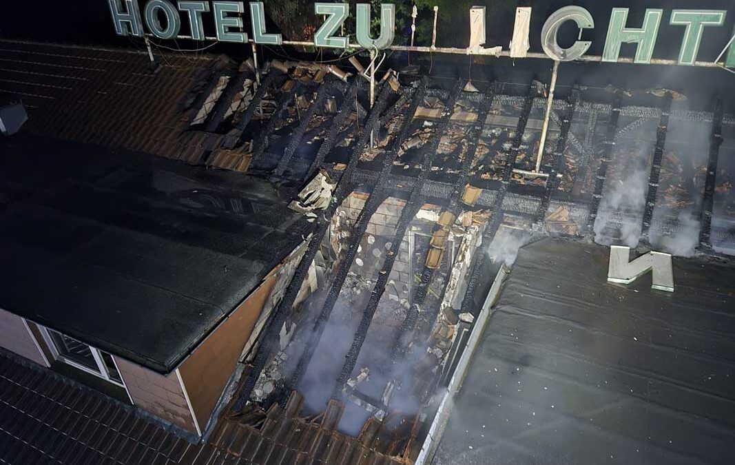 HESSISCH LICHTENAU. Am Fronleichnamstag gegen 22:40 Uhr ist im leerstehenden Hotel „Zur lichten Aue“ in der Desseler Straße in Hessisch Lichtenau erneut ein Brand ausgebrochen. Beim Eintreffen der Feuerwehr schlugen Flammen aus dem Dachstuhl. Unklar war zunächst, ob sich Personen im Gebäude aufhielten. Die Feuerwehr leitete den Löschangriff über eine Drehleiter ein, anschließend gingen mehrere Trupps unter Atemschutz im Innenangriff vor.