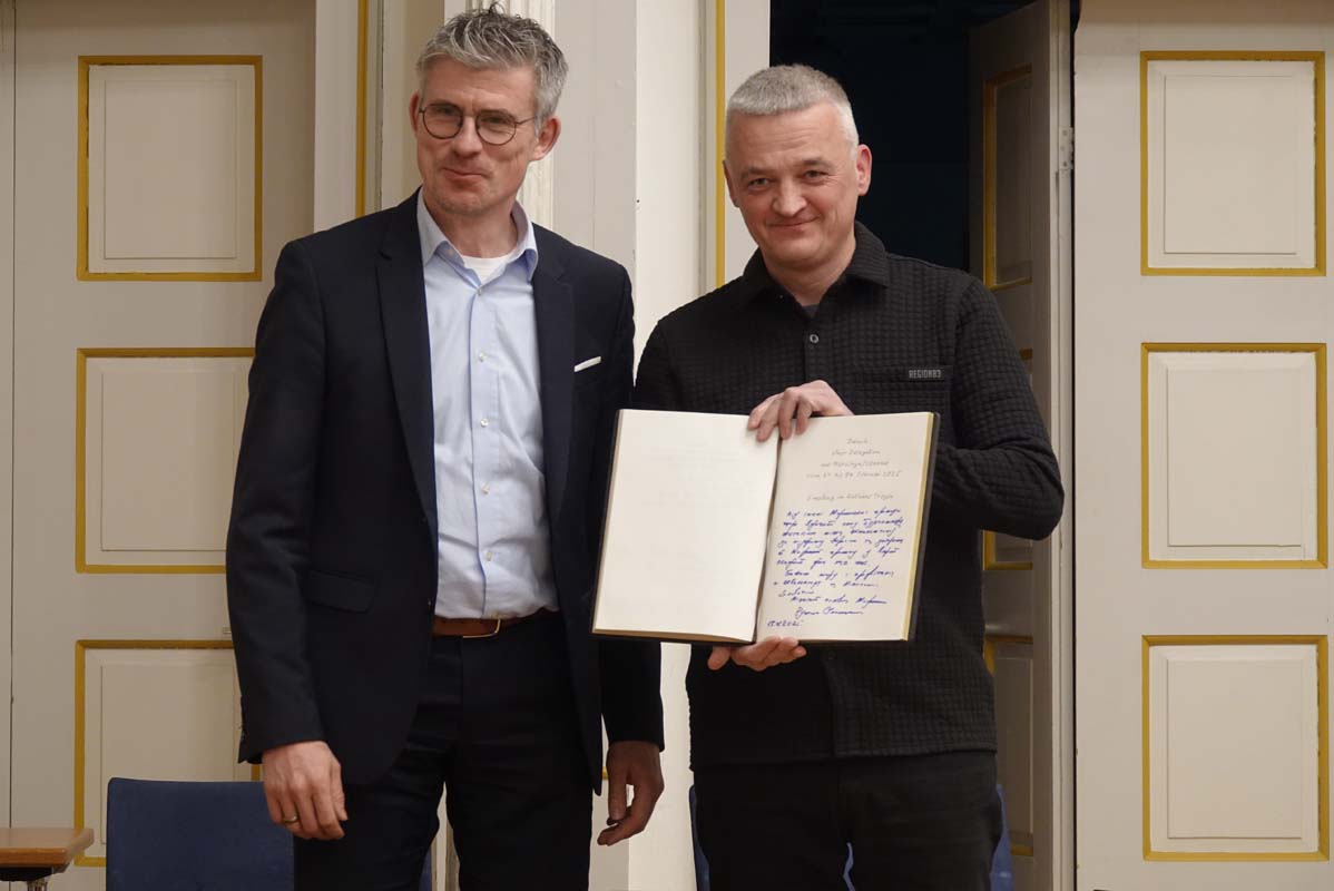 Nach der Ankunft am Montagnachmittag wurde die Delegation im Rathaus Treysa empfangen. Neben Bürgermeister Tobias Kreuter und Achim Nehrenberg von der Stadtverwaltung nahm sie am Abend an der Magistratssitzung teil. Im Anschluss trug sich Bürgermeister Ilnyzkyj ins Goldene Buch der Stadt Schwalmstadt ein.