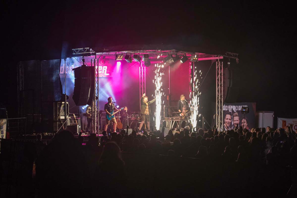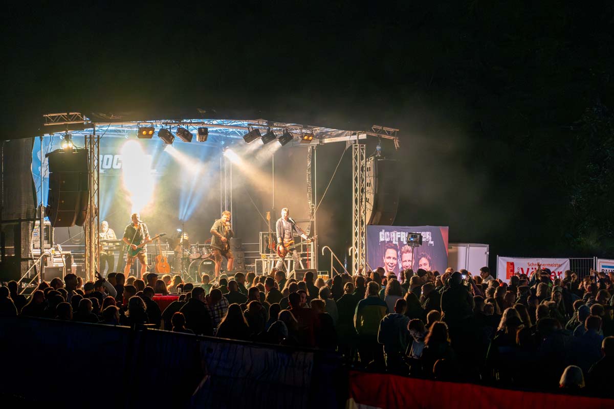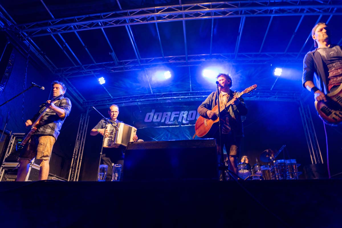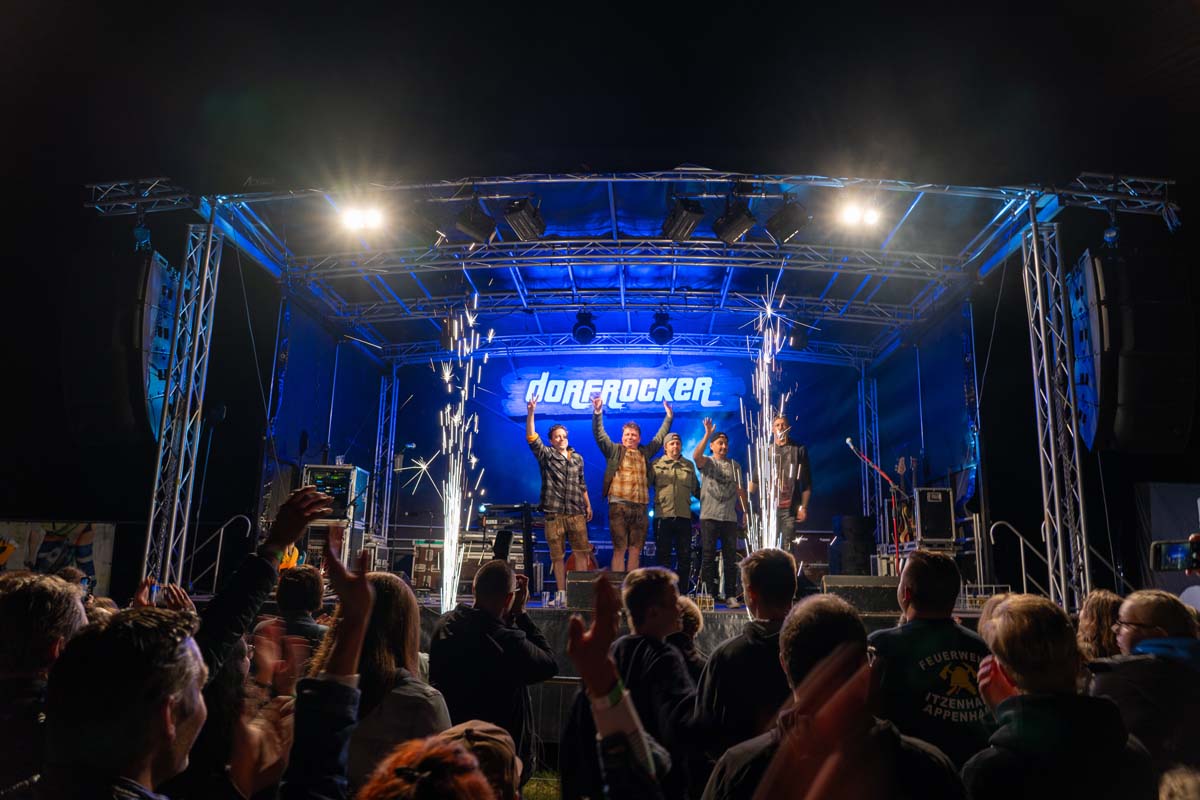 Das Konzert begann um 20:30 Uhr, und die Dorfrocker rockten das kleine Dorf bis kurz vor Mitternacht. Die sympathischen Musiker machten ihrem Namen alle Ehre und begeisterten das Publikum mit einer Vielzahl ihrer Hits. Songs wie „Engelbert Strauss“, „Feuerwehren“, „Der King“ und „So singt das Dorf“ heizten die Menge ordentlich ein.