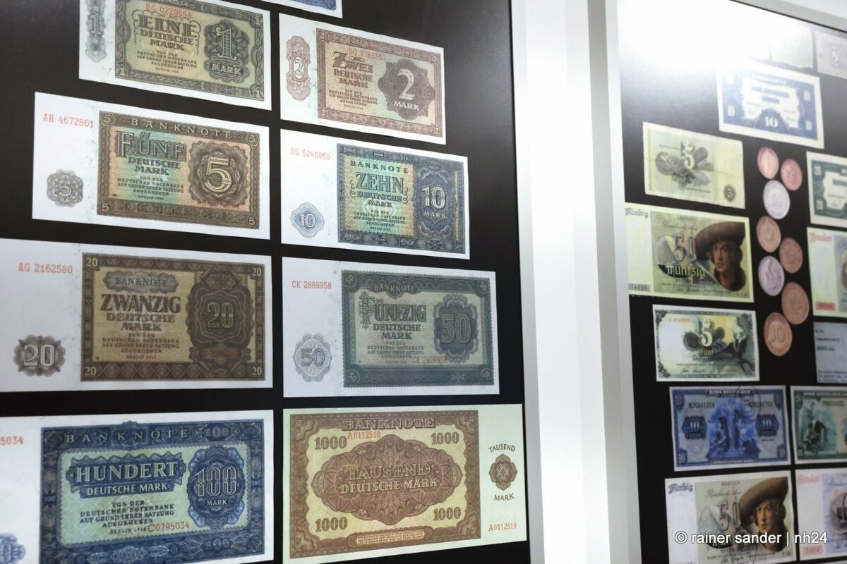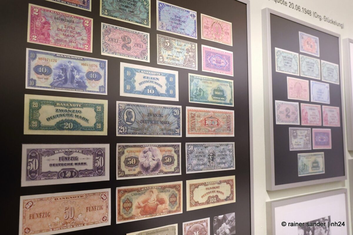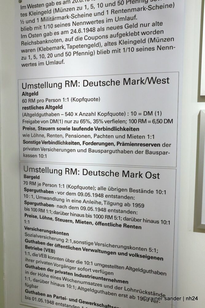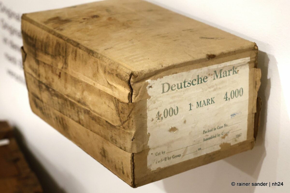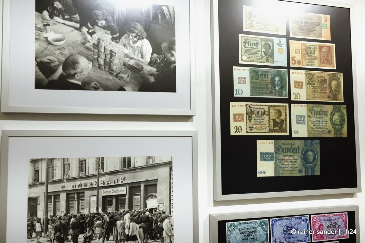 Tondokumente aus den Radioaufzeichnungen dieser beiden Tage sind im Museum zu hören. Auch die Stimme eines Schwarzmarkthändlers, der überzeugt war, dass alles beim Alten bleibt. Er hatte sich getäuscht. Tatsächlich wurde der Schwarzhandel sofort unterbunden. Selbst heimlich nach Berlin gelangte die Währung, was die Abriegelung der Westsektoren und die Sowjetunion und schließlich die Luftbrücke zur Folge hatte. Der Tisch, an dem verhandelt wurde, steht dort im Original, die Transportkisten und die ersten Scheine findet man auch in den Vitrinen. Sogar eine durchschnittliche Kalorienmenge ist als Mahlzeit mit ein paar Schnitten Brot ausgestellt.