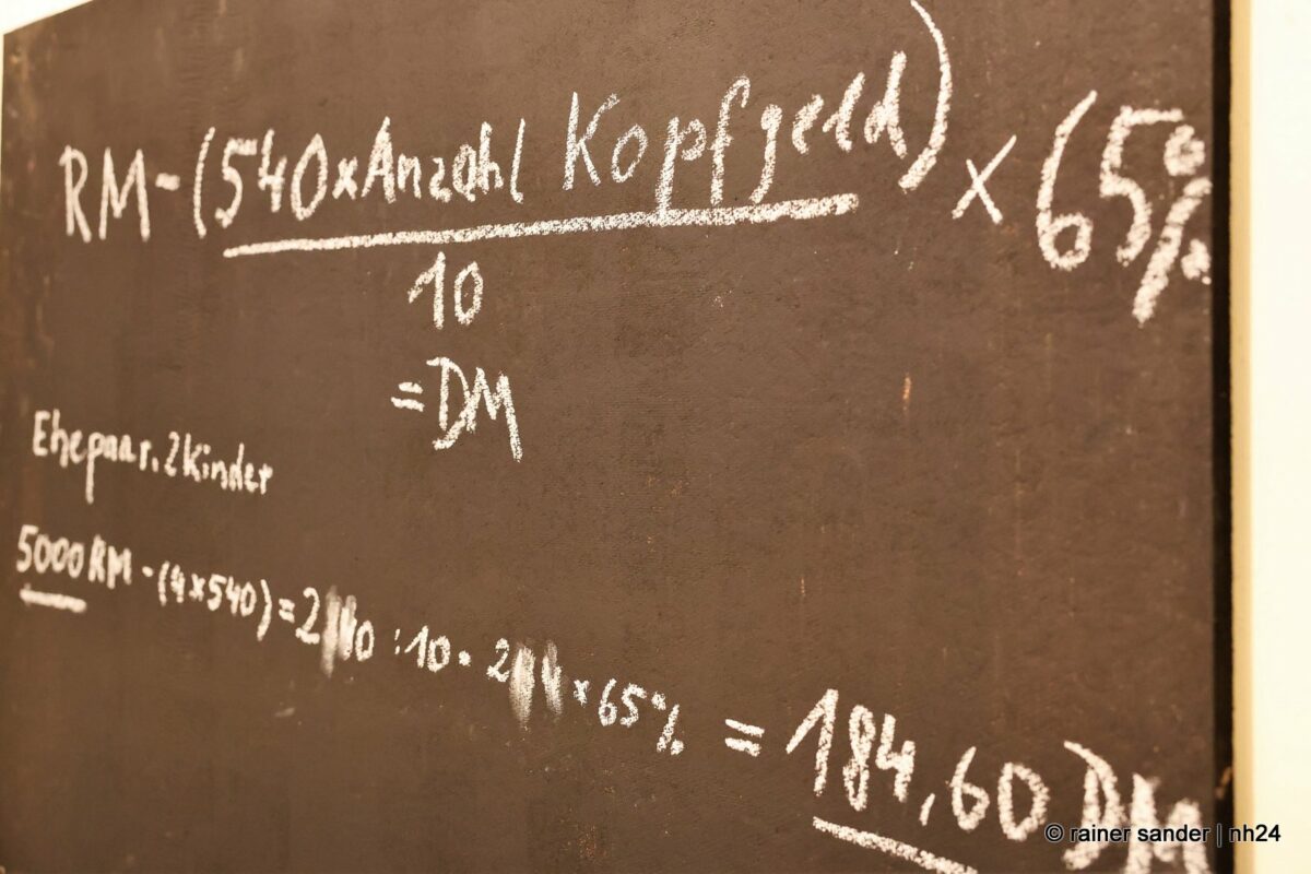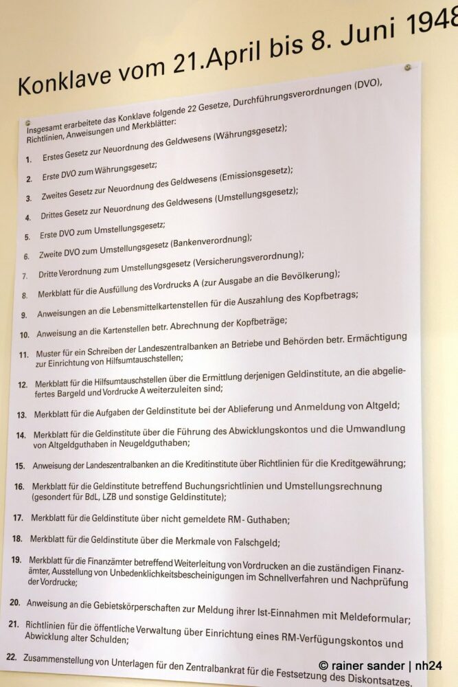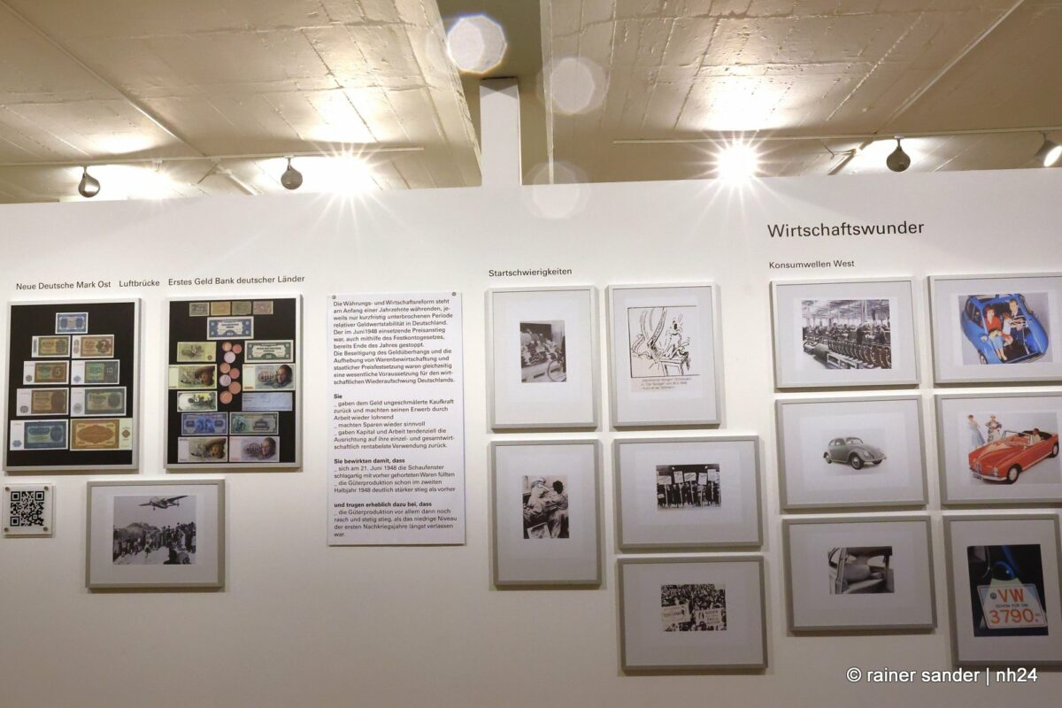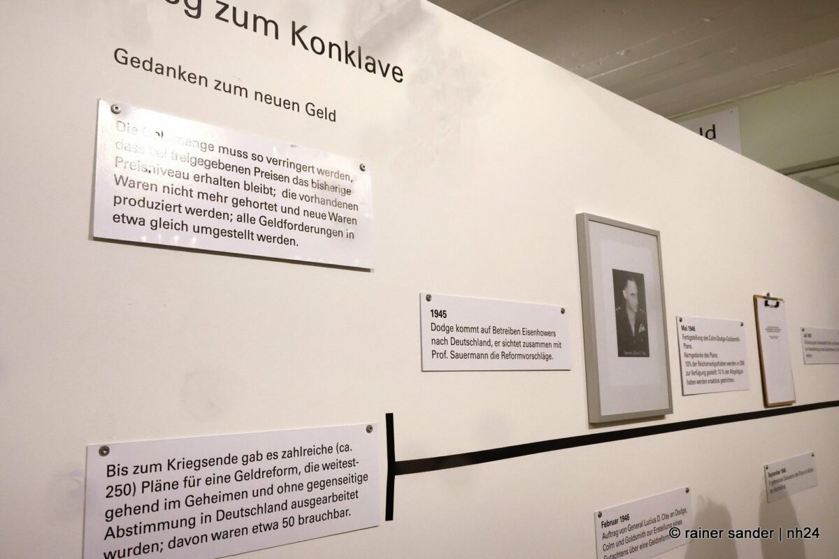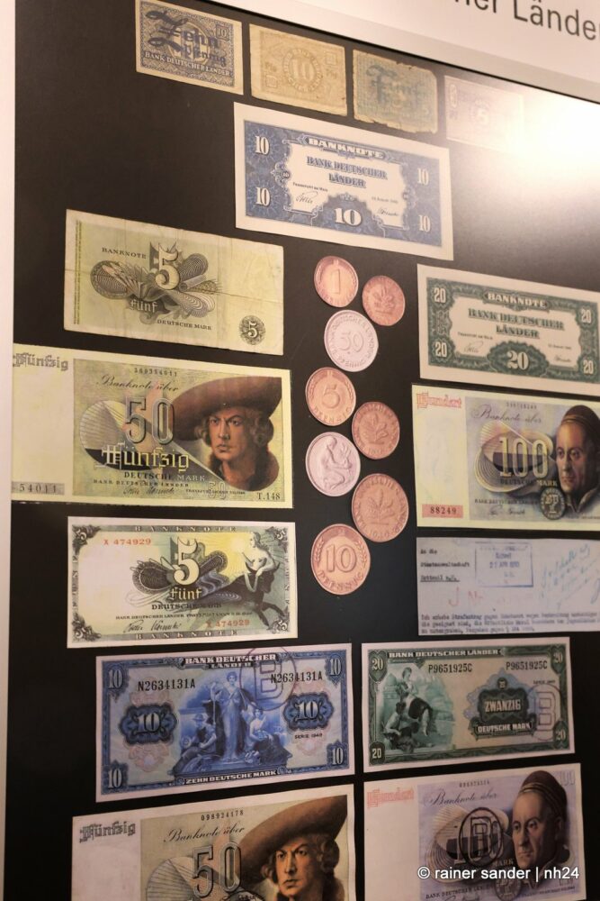Tondokumente aus den Radioaufzeichnungen dieser beiden Tage sind im Museum zu hören. Auch die Stimme eines Schwarzmarkthändlers, der überzeugt war, dass alles beim Alten bleibt. Er hatte sich getäuscht. Tatsächlich wurde der Schwarzhandel sofort unterbunden. Selbst heimlich nach Berlin gelangte die Währung, was die Abriegelung der Westsektoren und die Sowjetunion und schließlich die Luftbrücke zur Folge hatte. Der Tisch, an dem verhandelt wurde, steht dort im Original, die Transportkisten und die ersten Scheine findet man auch in den Vitrinen. Sogar eine durchschnittliche Kalorienmenge ist als Mahlzeit mit ein paar Schnitten Brot ausgestellt.