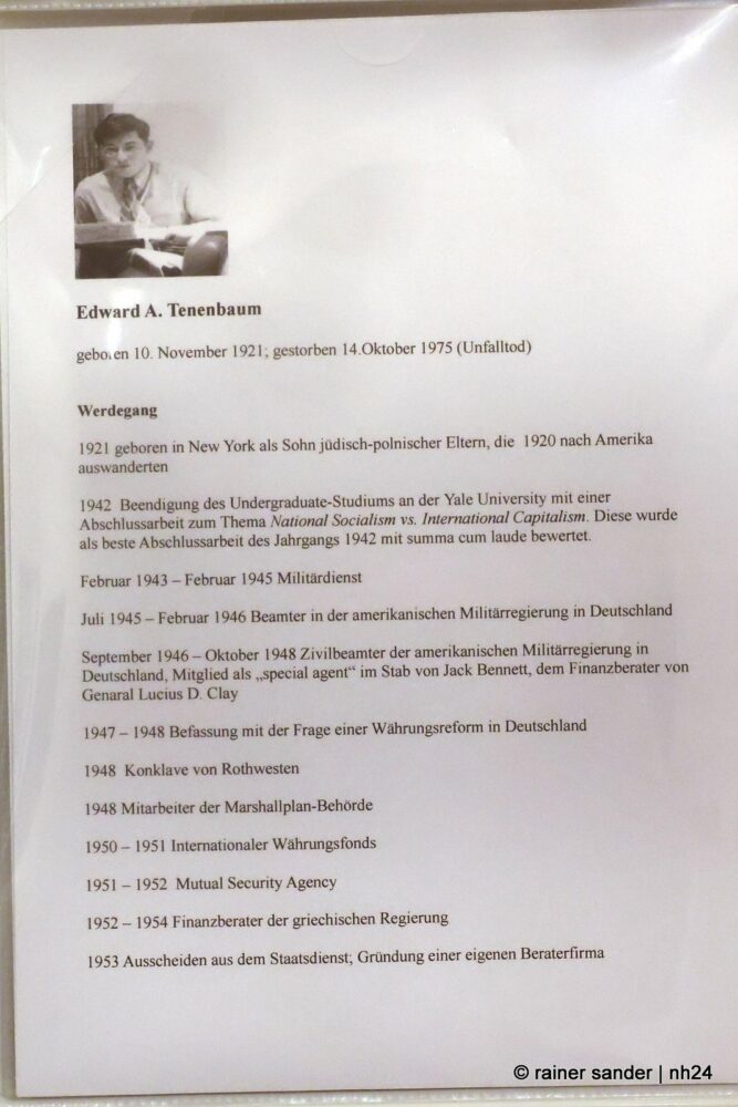 Sie kamen in einem Bus mit verschmierten Fenstern. Niemand sollte sehen, wer hier 49 Tage lang eingeschlossen wird. Außer ein paar Amerikanern waren es deutsche Finanz- und Wirtschaftsfachleute, die eine spannende Aufgabe hatten: die Einführung und vor allem die Organisation einer neuen Währung. Ein Konklave wie zur Papstwahl. Freiheit gab’s erst wieder mit einem Plan zum Druck und der Einführung einer neuen Währung, einschließlich Umstellungsquote, Freibetrag und Festquote, Kopfbetrag, Erstausstattung der öffentlichen Hand, reibungslose Kreditversorgung und Lastenausgleich. Ihr „Chef“: Der amerikanische Ökonom Edward A. Tenenbaum.