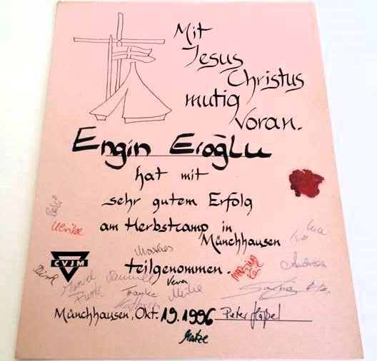 Hier wird als „Beweis“ für Christlichkeit eine Urkunde des CVJM vorgelegt. die dem damals 14 jährigen Eroglu auszeichnet.