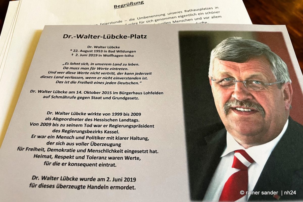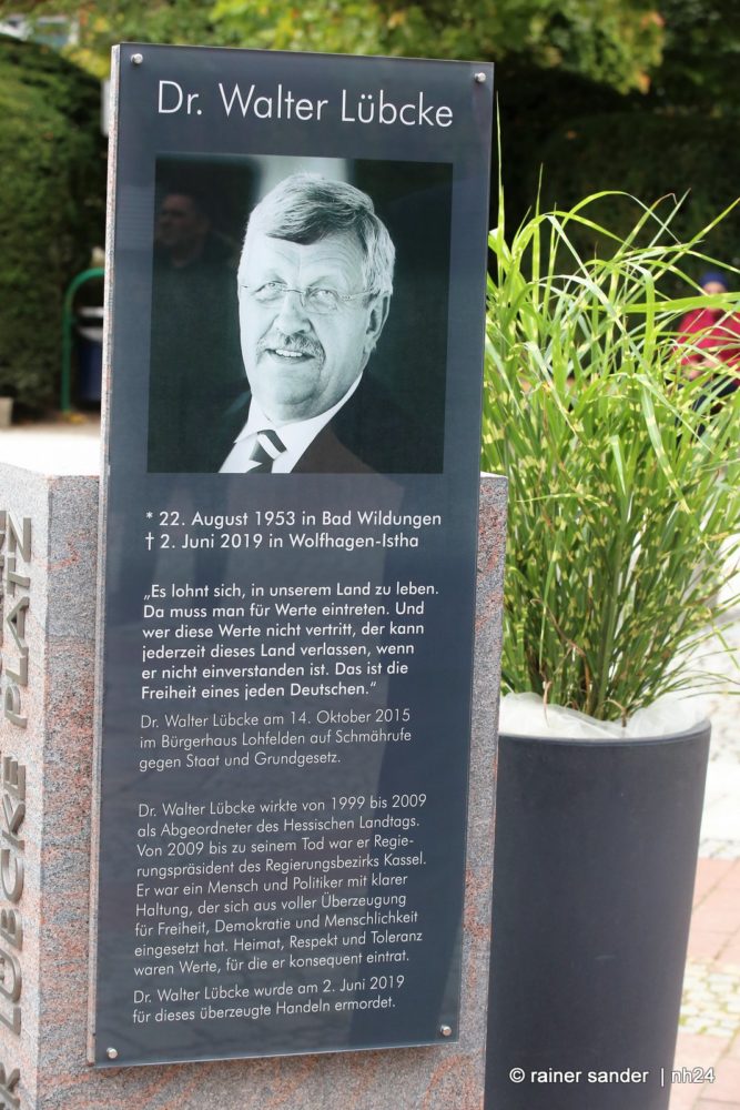 Das allein, kann die Familie nicht trösten und macht die Tat nicht besser oder gibt ihr am Ende gar einen Sinn. Wut und Hass sind immer sinnlos aber eben weit verbreitet. Und sie nehmen zu, wie Eva Kühne-Hörmann angesichts neuer Mails und Kommentare in den sozialen Netzwerken betonte. Sie waren vor dem Hintergrund der Ehrung und Enthüllung einer Gedenktafel bereits wieder im Netz unterwegs. Was hatte Walter Lübke gesagt?