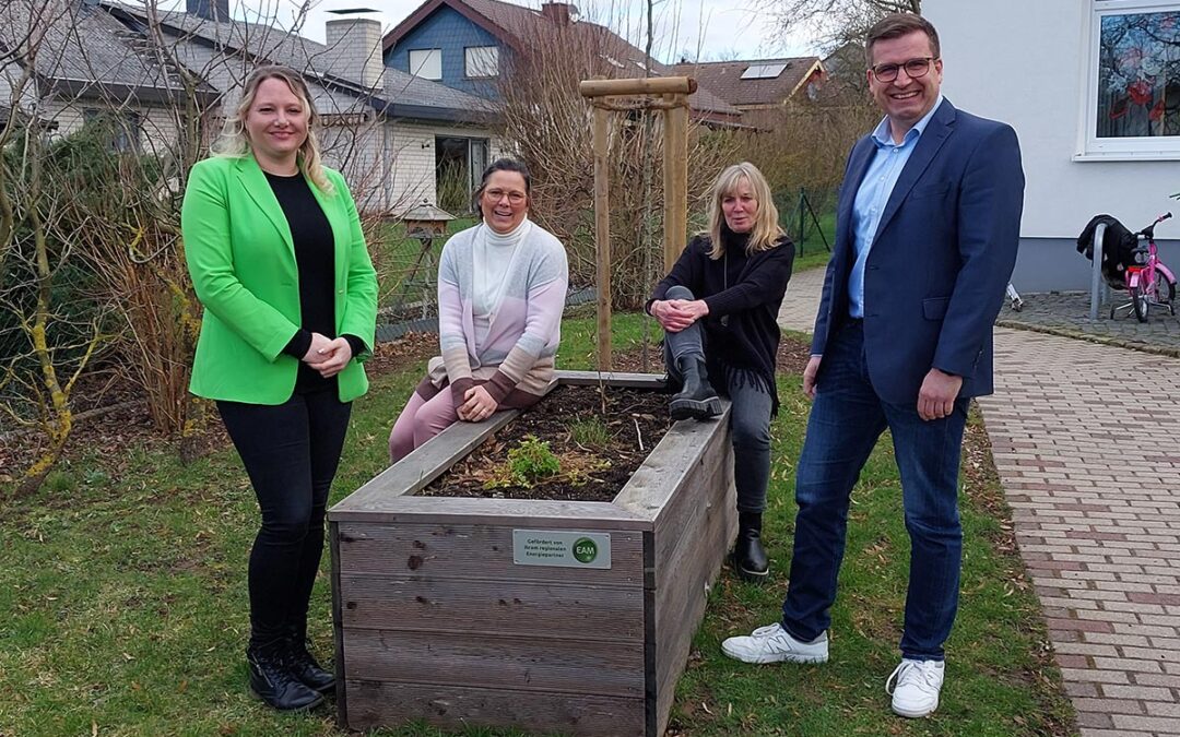 Die Leiterin des EAM Regionalzentrums Mitte, Maria Bax, übergab jetzt ein neues Hochbeet an Espenaus Bürgermeister Carsten Strzoda und Kindergartenleiterin Bärbel Umlauf-Klein. Das Beet soll in der Kindertagesstätte Sonnenhang die Möglichkeit für nachhaltiges Gärtnern bieten.