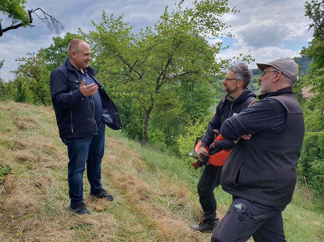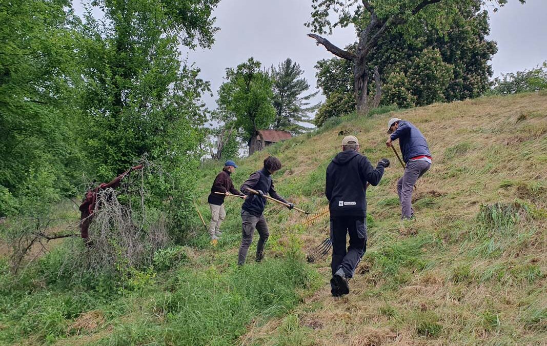 Mit Motorsensen, Rechen und Heugabeln wurde ein steiler Hang gemäht, um den Erhalt der biologischen Vielfalt zu fördern. Ohne regelmäßige Pflege würde die Fläche verbuschen und Blühpflanzen, Insekten und Vögel ihren Lebensraum verlieren. Auch Sandarien und Trockenmauern, wichtige Rückzugsorte für Wildbienen und Eidechsen, wurden vom Bewuchs befreit.