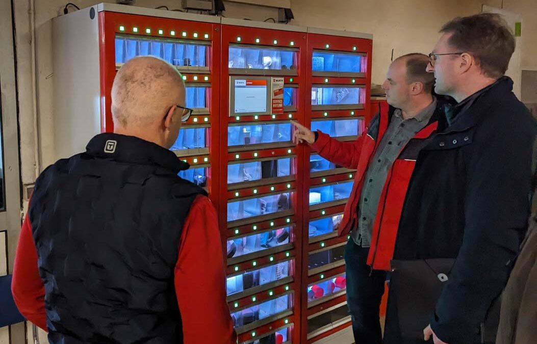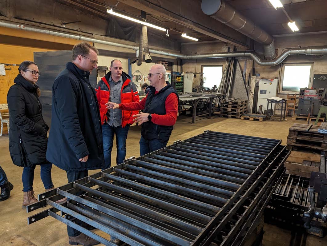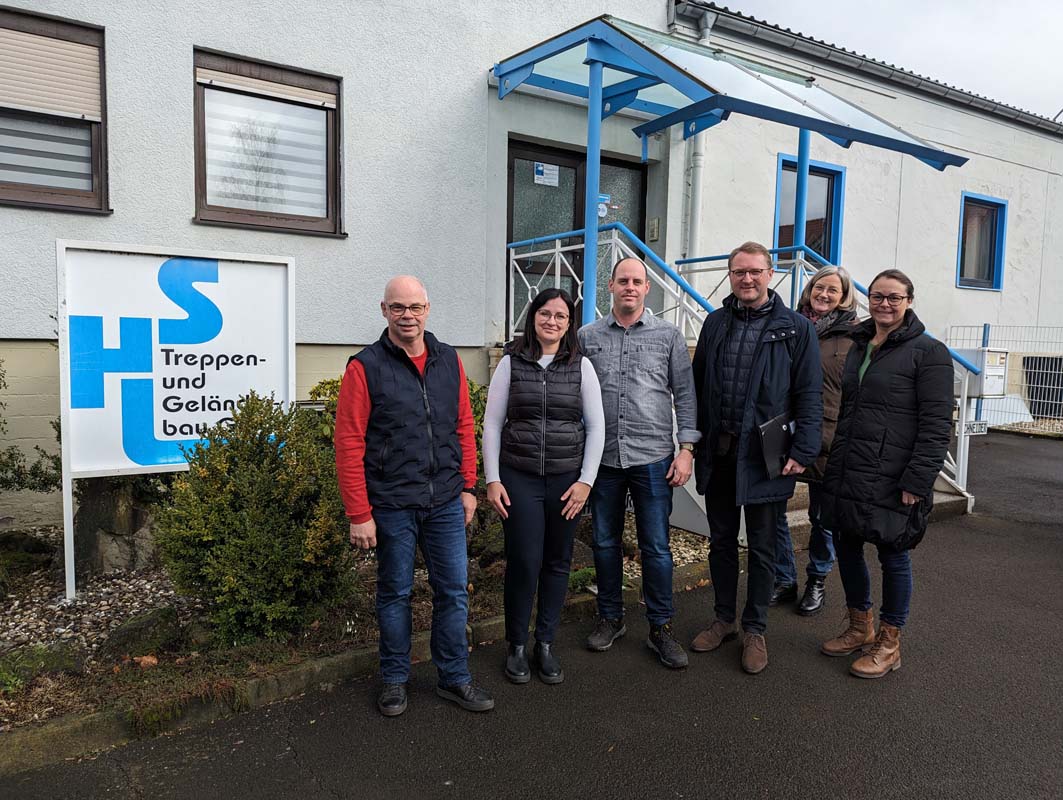 Während seines Unternehmensbesuchs bei HLS Treppen- und Geländerbau in Bobenhausen II erfährt Dr. Jens Mischak, Erster Kreisbeigeordneter, dass auch der auf Treppen, Geländer, Stufen und Vordächer spezialisierte Metallbaubetrieb damit zu kämpfen hat. „Immer wieder wird offensichtlich, dass Verlässlichkeit und Planungssicherheit fehlen. Gerade auf bundespolitischer Ebene ist an dieser Stelle eindeutig Luft nach oben“, stellt Wirtschaftsdezernent Dr. Mischak vor dem Hintergrund des Besuchs bei HLS heraus. Gemeinsam mit Andrea Ortstadt, Wirtschaftsförderung des Vogelsbergkreises, und Susen Neumann, Arbeitgeberservice KVA – Kommunales Jobcenter des Vogelsbergkreises, erhält er von den Geschäftsführern Jürgen und Norman Schneider einen Einblick ins Unternehmen.