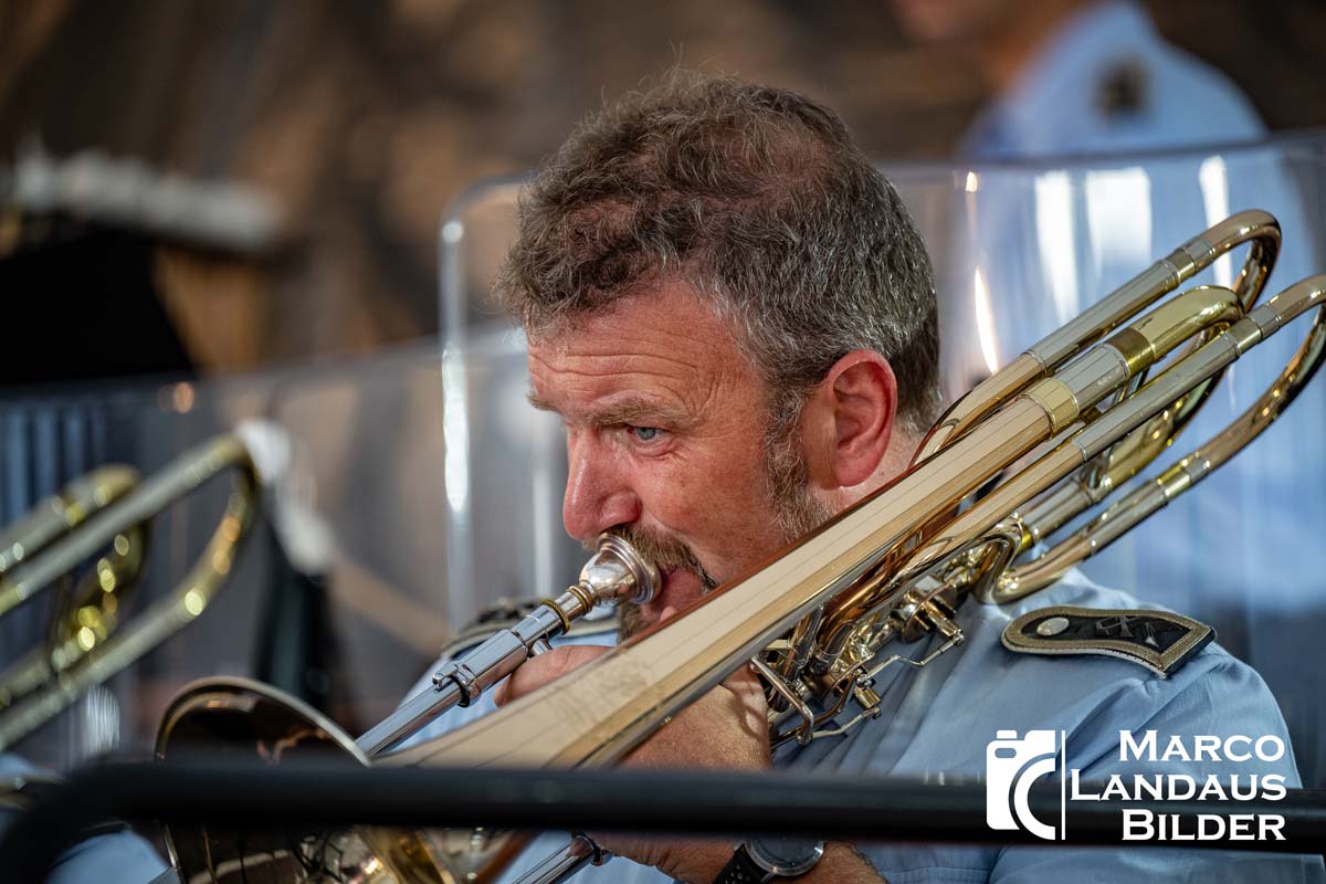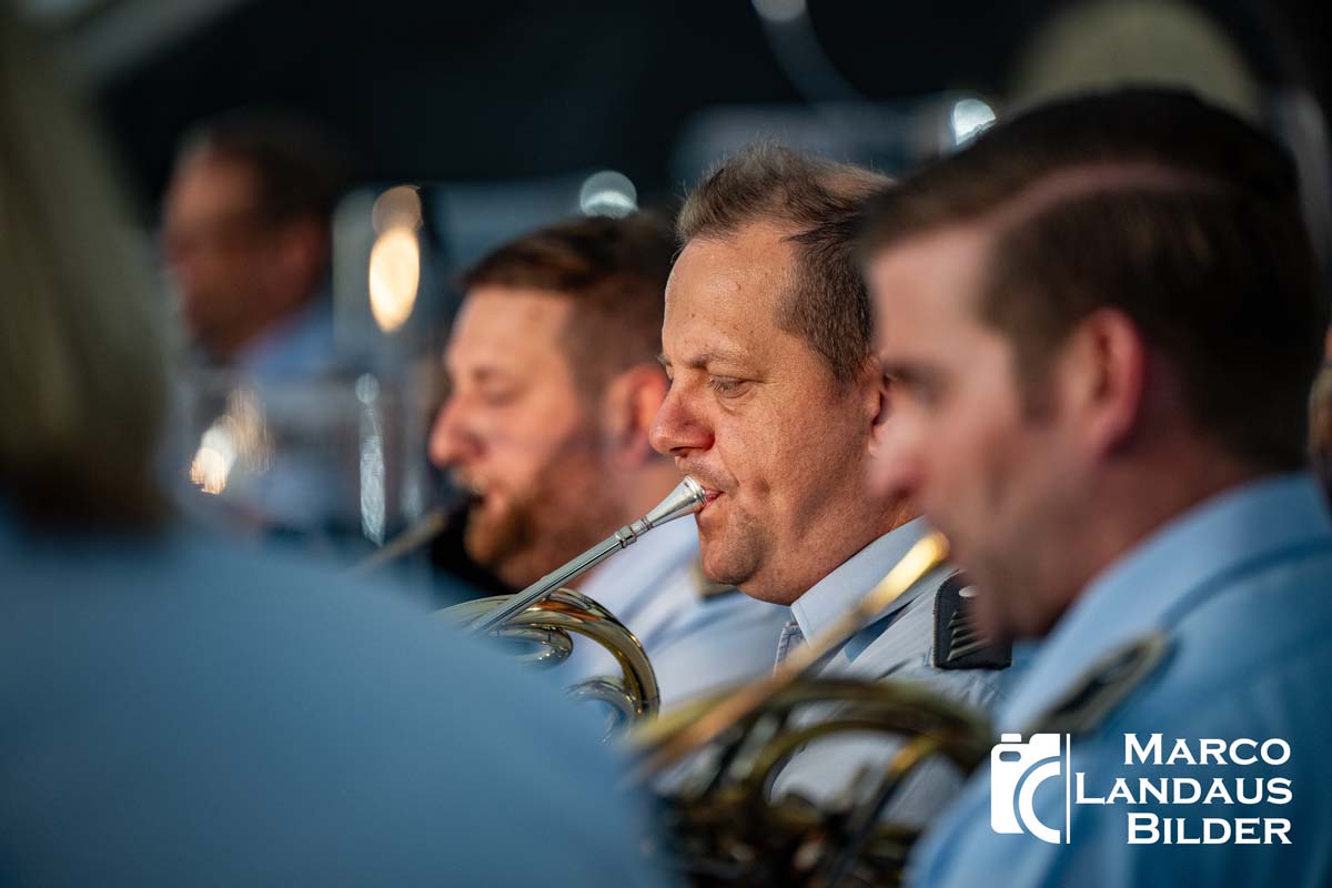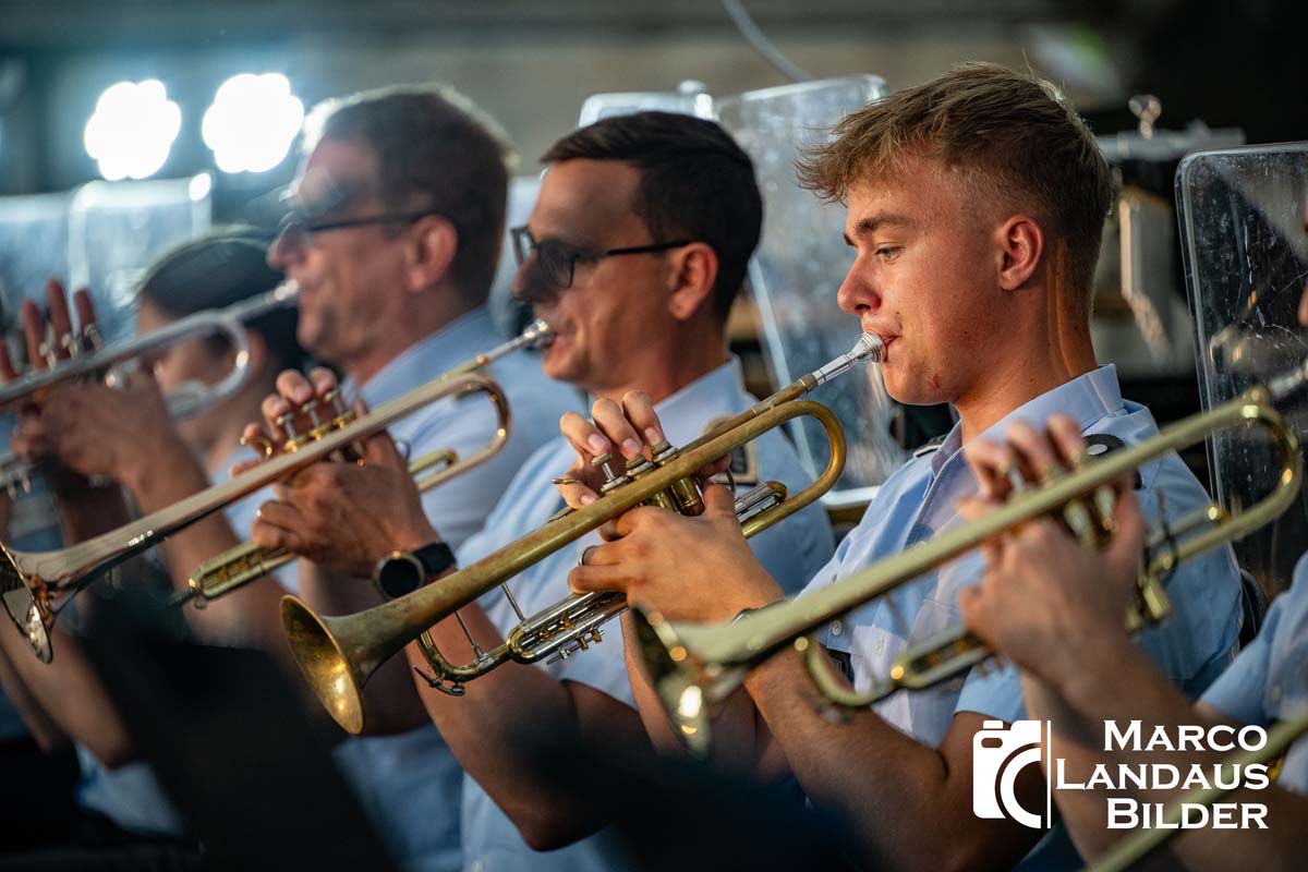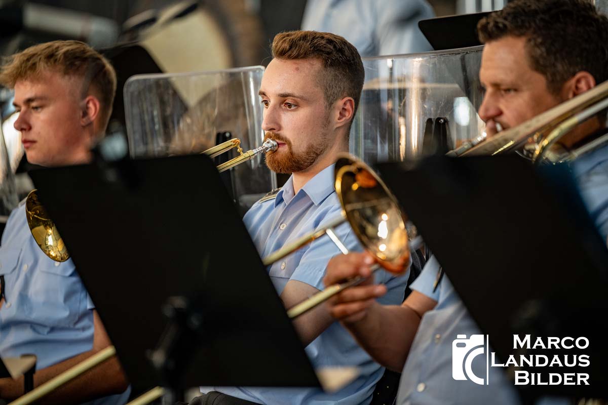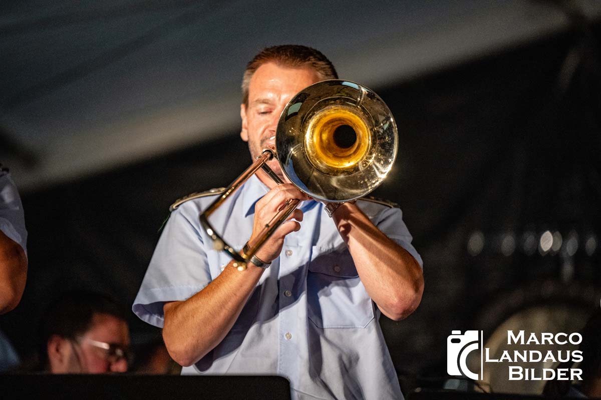 Nach einer kurzen Pause kehrte das Orchester mit neuen Klängen zurück. „Toto for Trombones“ begeisterte das Publikum und zeigte die Vielseitigkeit des Musikkorps. Mit jedem weiteren Stück wuchs die Begeisterung, bis am Ende des Benefizkonzerts die letzten Töne der Nationalhymne verklangen.