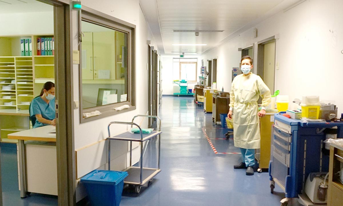 Tobias Buchenau ist Krankenpfleger auf der Station. Ursprünglich kommt er von der neurologischen Station und hat sich dazu bereit erklärt, auf der Süd U3 zu unterstützen. Auf unsere Frage, ob er keine Bedenken davor gehabt habe, dort zu arbeiten, beschreibt er sicher: „Hier weiß man, dass der Patient entweder positiv ist oder dass der Verdacht besteht und das Ergebnis bald vorliegt. Entsprechend werden hier alle Sicherheitsmaßnahmen getroffen. Also nein, Angst hatte ich keine.“ Die Zahlen geben Buchenau recht: Kein Mitarbeiter hat sich bisher durch seine Arbeit vor Ort infiziert. „Ich schätze vor allem das Team hier sehr, da jeder aus einem anderen Fachbereich kommt und seine jeweiligen Kompetenzen einsetzen kann. Gleichzeitig lernen wir voneinander und tauschen uns aus“, so Buchenau. Zum Arbeitsbeginn blickt das Team jeden Tag neu auf den Einsatzplan und entscheidet, wer direkt am Patienten arbeitet, wer Verwaltungsaufgaben übernimmt und wer als sogenannter Springer agiert, also einer Person, die keinen Kontakt zu Infizierten oder Verdachtsfällen hat und Hol- und Bringdienste innerhalb des Klinikums übernimmt. „Wer direkt die Patienten versorgt, kennt sich mittlerweile gut mit den notwendigen Hygienerichtlinien und der Schutzausrüstung aus“, ergänzt Tobias Buchenau. Je nach Patientenaufkommen unterstützen die Pflegefachkräfte der Station auch die Zentrale Notaufnahme oder ihre ursprünglichen Stationen. Steigt die Anzahl der Patienten an, sind sie innerhalb weniger Minuten auf der Station und wissen, was zu tun ist. (pm)