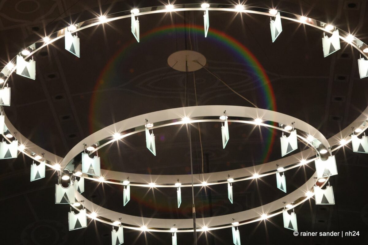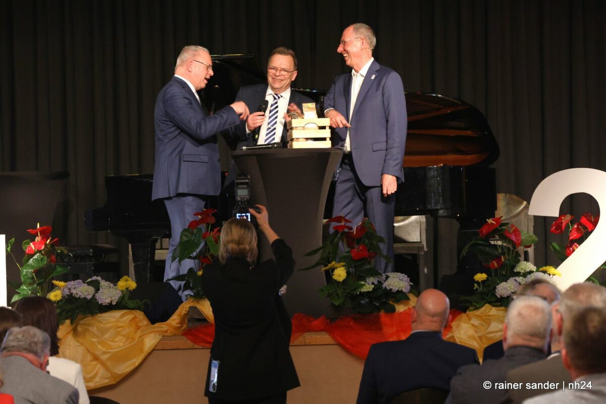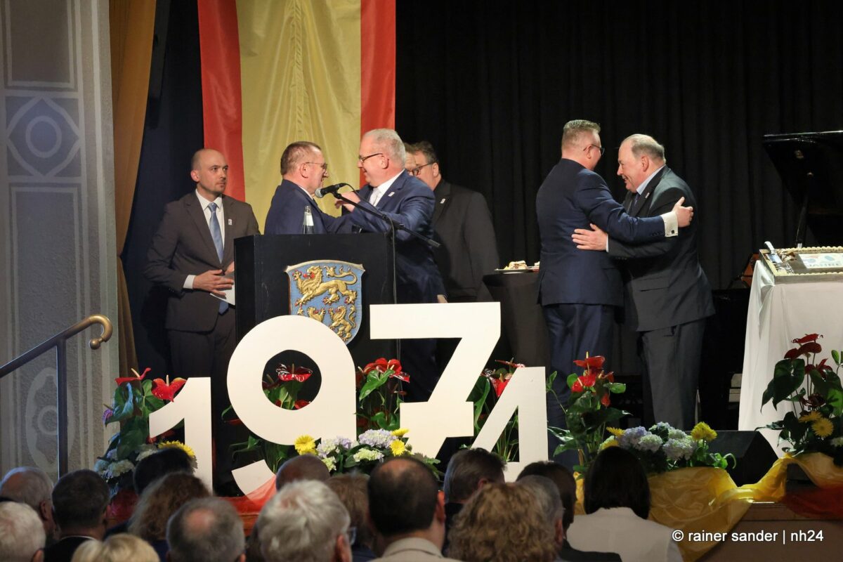 Der Kreistagsvorsitzende Michael Kreutzmann schilderte die politische Entwicklung im Kreistag von einst drei Parteien auf heute neun und die Entstehung der Hoheitszeichen. Einst sollte auch die Fulda im Kreisnamen vorkommen, was vom Land nicht genehmigt wurde, hatte Becker bereits resümiert. Im Wappen sind aber alle drei als silberne Linien vorhanden. Fast niemandem, so Kreutzmann, seien die offiziellen Farben des Landkreises bewusst. Die Original-Fahne, die rechts und links der Bühne aufgehängt war, erinnert stark an die spanischen Farben. Zwei Tourismusregionen, die sich offensichtlich ganz gut verstehen.