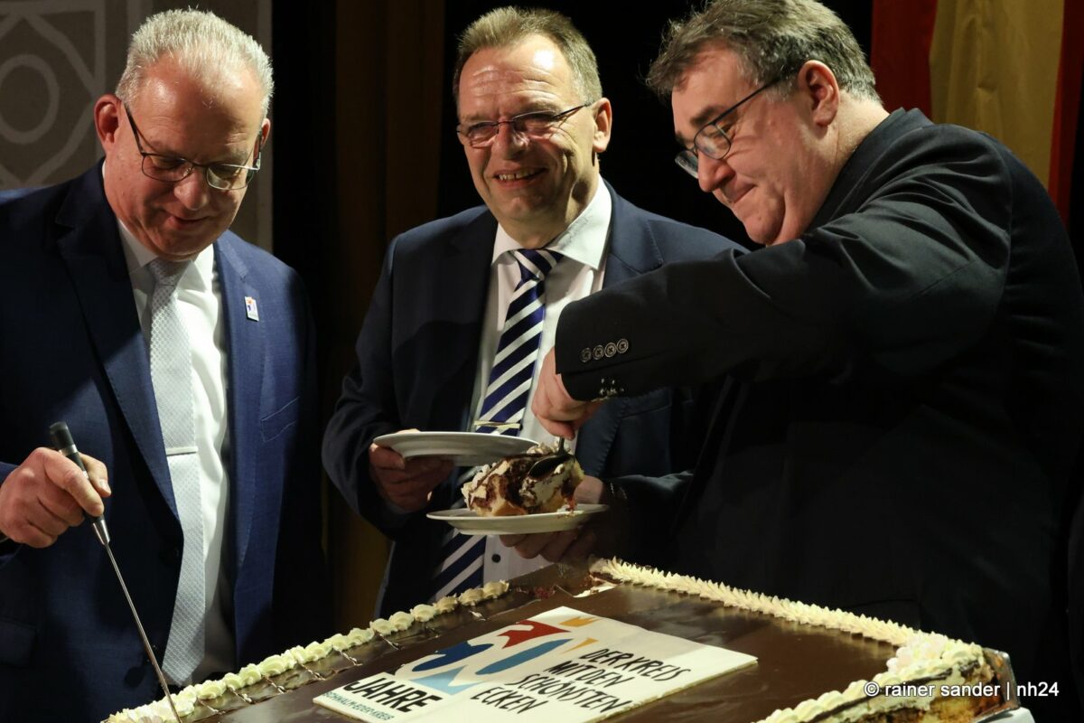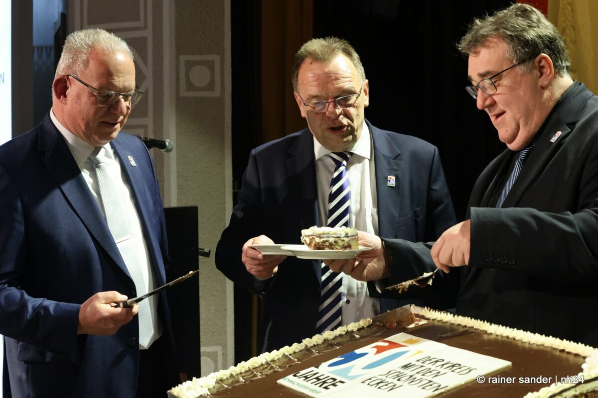 Helmut Schmidt trat damals sein Amt an, nachdem Willy Brandt zurückgetreten war, die Verkehrssünderkartei startete ihre Punktesammlung (auch der Landrat ist Kunde), Playmobil kam auf den Markt und der Europäische Rat wurde gegründet. Er versuchte sich vorzustellen, wie es wohl möglich gewesen ist, dass sich die Landräte Franz Baier (Melsungen), August Franke (Fritzlar-Homberg) und Albert Pfuhl (Ziegenhain) auf August den Starken einigten. Alle Wege von Nord nach Süd führen durch den Schwalm-Eder-Kreis. Winfried Becker erinnerte auch an die schicksalhaften Stunden des Kreises, wie das Grubenunglück in Borken. Dass der Kreis von Ehrenamtlichen getragen wird, hatte seinen Platz in der „Abteilung Danke“ seiner Ansprache und kam auch in den Diskussionsrunden nicht zu kurz.