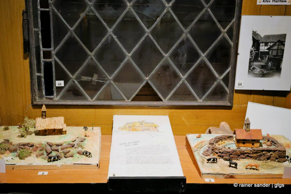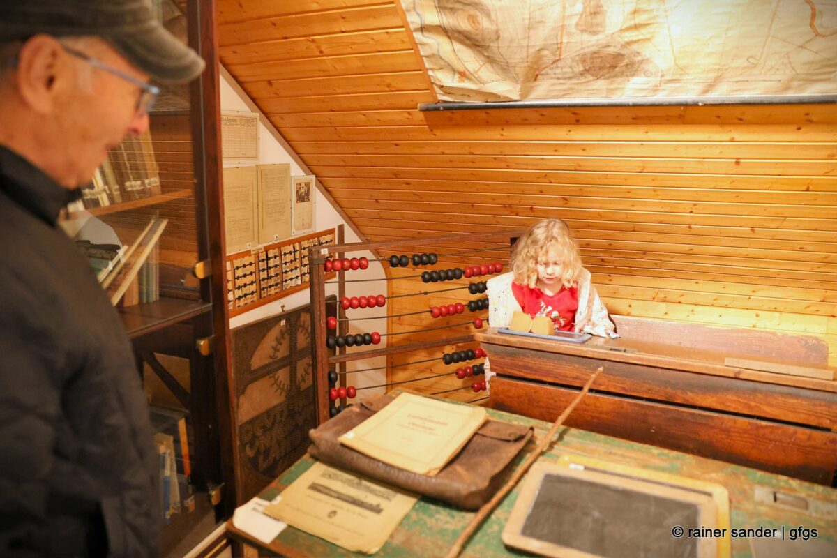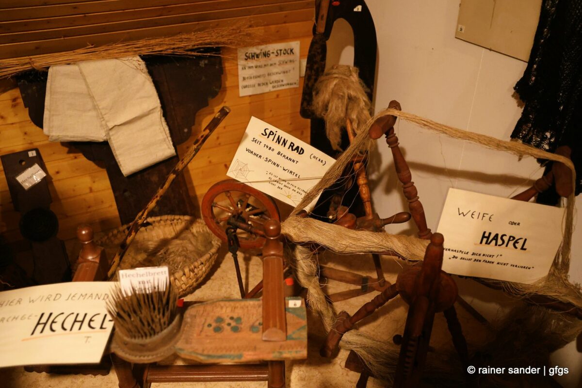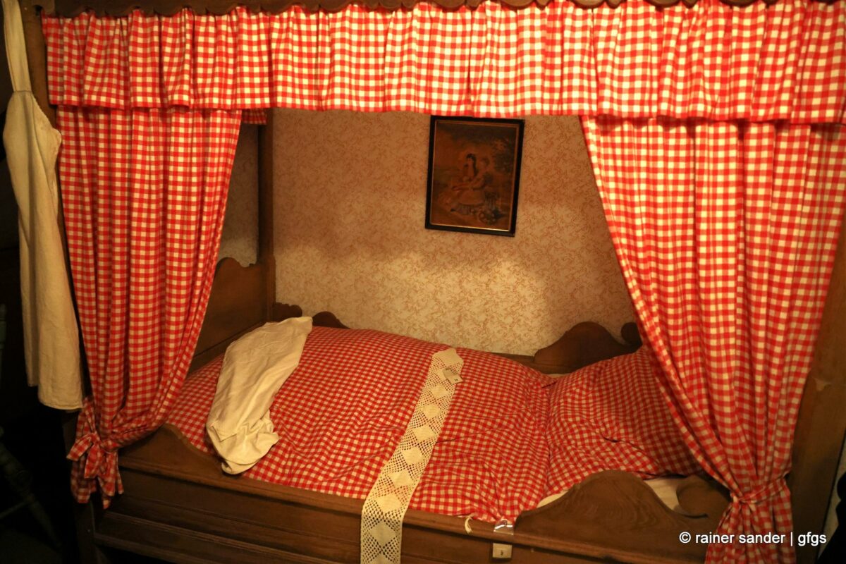Eine Leineweber-Werkstatt, eine Presse zum Keltern, eine Schumacher-Werkstatt und auch eine komplett eingerichtete Küche sehen so aus, als würden hier noch Menschen leben und nur mal kurz Pause machen. Wer möchte, kann auf den Bänken der alten Dorfschule Platz nehmen und gedanklich zurückreisen in eine Zeit, in der noch mit Federkiel und richtiger Tafelkreide geschrieben wurde. Gleich hinter der Küche findet man auch ein Schlafzimmer mit dem typisch kurzen Bett, in dem wir heute eine orthopädisch ungünstige Körperhaltung einnehmen müssten. Dass die Menschen früher kleiner gewesen sind, wird auch an einer alten Tür deutlich.