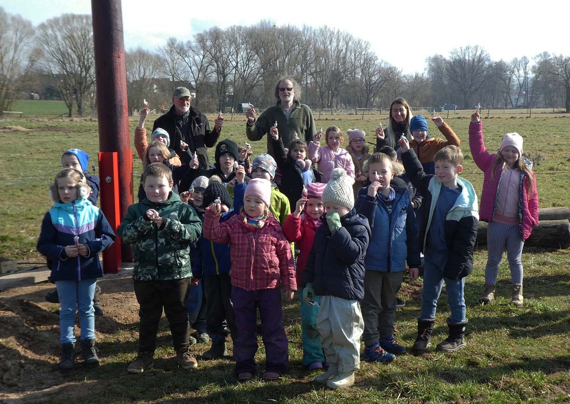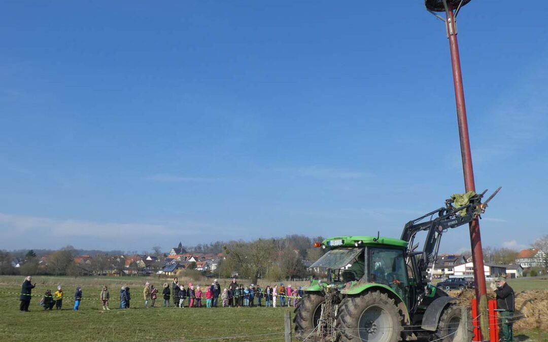 Am Donnerstag, dem 13.3. verfolgten eine Schulklasse der Grundschule sowie eine Kindergarten-Gruppe mit ihren Lehrerinnen und Betreuerinnen vor Ort das Aufrichten des Mastes. Das Traggerüst war bereits einbetoniert. Einige Kinder hatten schon im vergangenen Herbst bei den Flechtarbeiten für die Nistunterlage mitgewirkt. Behutsam schob der Vorsitzende des Fördervereins Kulturlandschaft Schwalm, Jörg Haafke, die Nistplattform mit seinem Traktor an dem zuvor installierten Festpunkt des Traggerüstes gesichert in seine Endposition. Spontan applaudierten die Kinder als der Mast senkrecht stand und mit starken Gewindestangen gesichert war.
