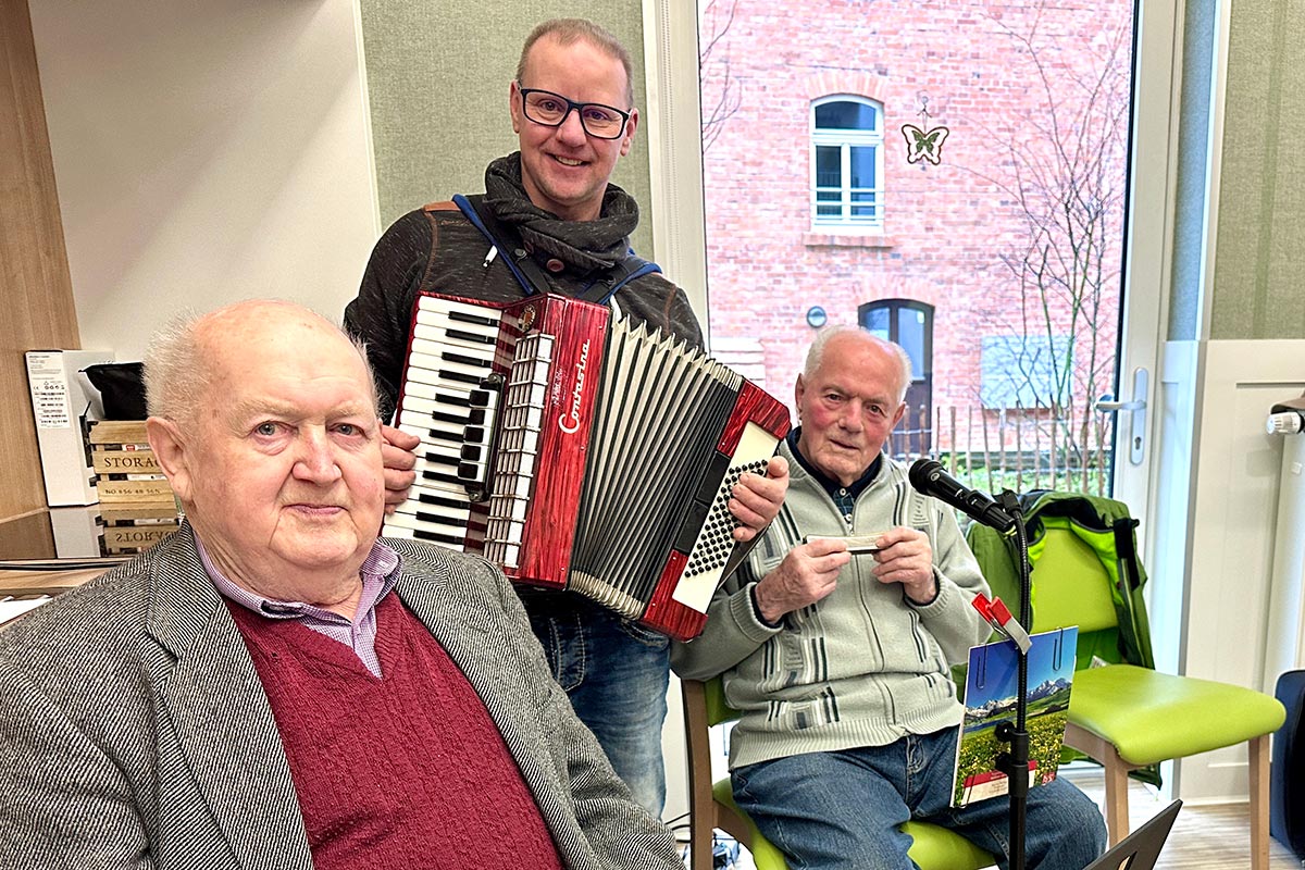 Alle zwei Wochen besuchen Albert Schmelz (88), Alfred Mohr (95) und Bernd Brandenburg (53) die Pflegeeinrichtung in Lauterbach ehrenamtlich, um die Bewohnenden musikalisch zu unterhalten. Wegen der Corona-Regelungen durfte das Trio in den vergangenen Jahren ausschließlich vom Innenhof aus musizieren.
