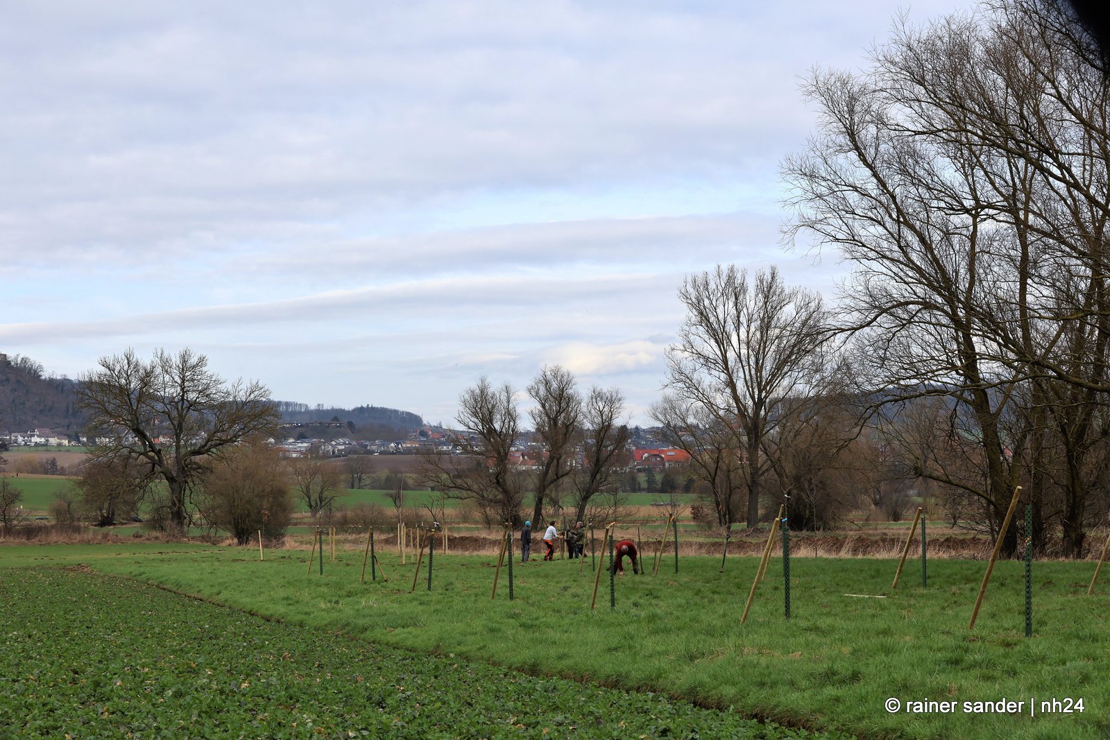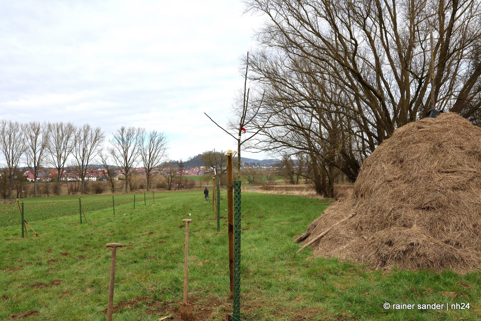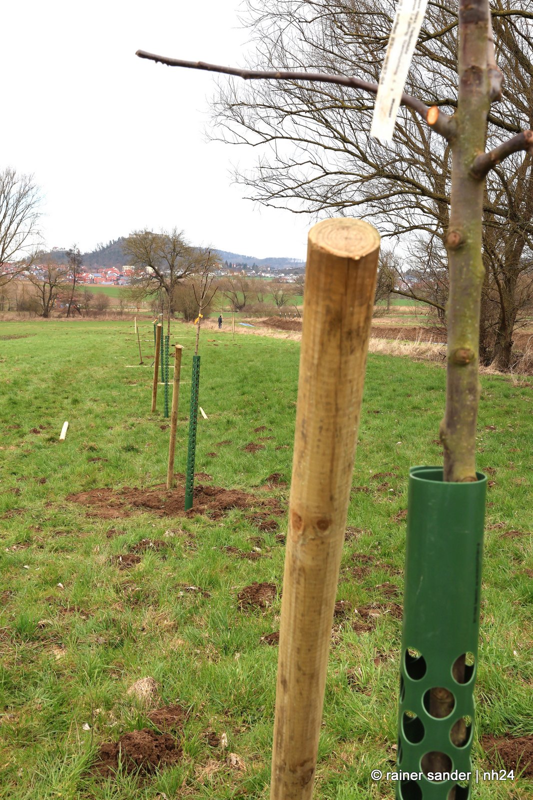 GUDENSBERG. Wer kennt noch die „Hessische Tiefenblüte“ oder einen „Ausbacher Roten“? Zwei alte Apfelsorten, die der Naturschutzbund „NABU“ am gestrigen Samstagvormittag nahe der Ems im Gudensberger Ortsteil Obervorschütz gepflanzt hat. 27 Bäume, alles Hochstämme und alte Sorten von Äpfeln, Birnen und Süßkirschen ergeben eine Streuobstwiese.