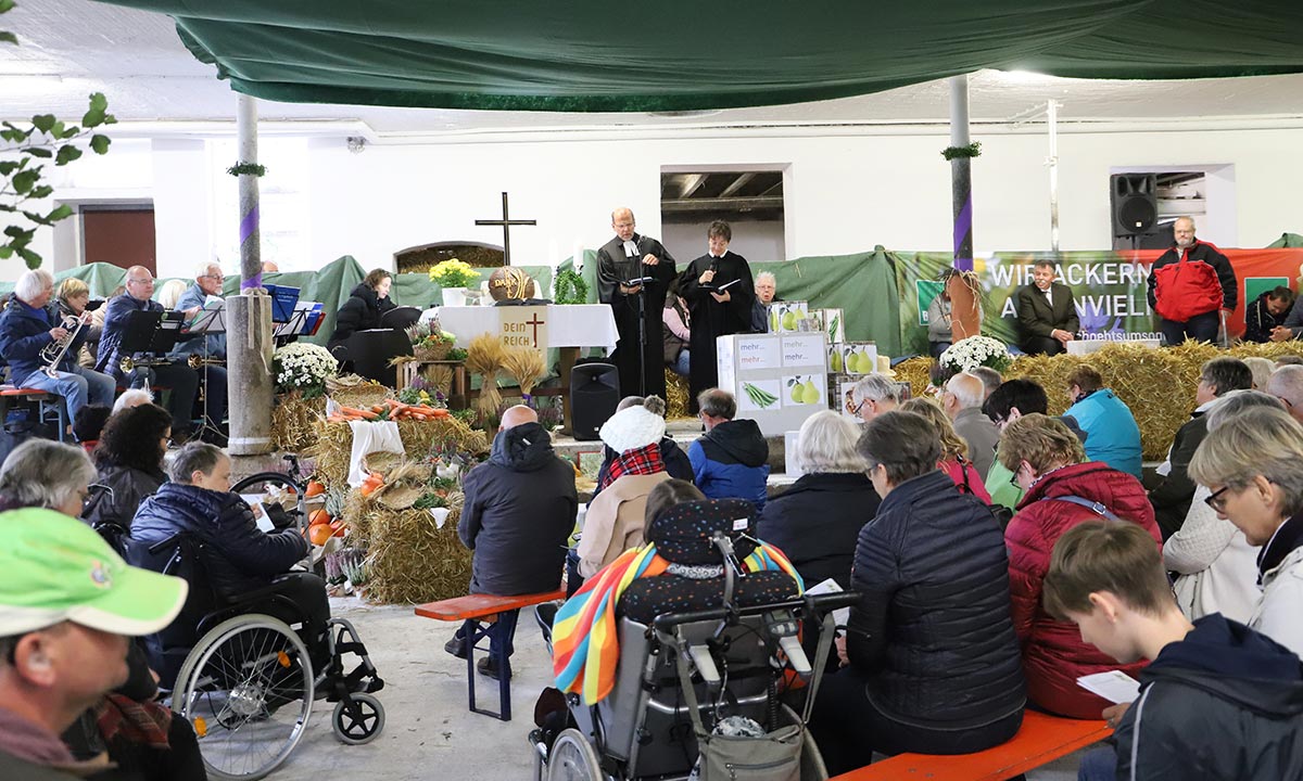 Das Fest begann traditionell mit dem Erntedankgottesdienst. Im herbstlich dekorierten Rinderstall des Hofguts sahen die rund 250 Gottesdienstbesucher das Anspiel zum Gleichnis vom reichen Kornbauern, das einige Bewohner vorführten. Pfarrerin Annette Hestermann (Hephata-Kirchengemeinde) und Pfarrer Reinhard Keller (Jesberg) gestalteten den Gottesdienst gemeinsam. Für Musik sorgte der Hephata-Posaunenchor unter der Leitung von Dorothea Grebe. Zum Abschluss erhielt jeder Gottesdienstbesucher ein kleines Glas selbstgemachte Marmelade.