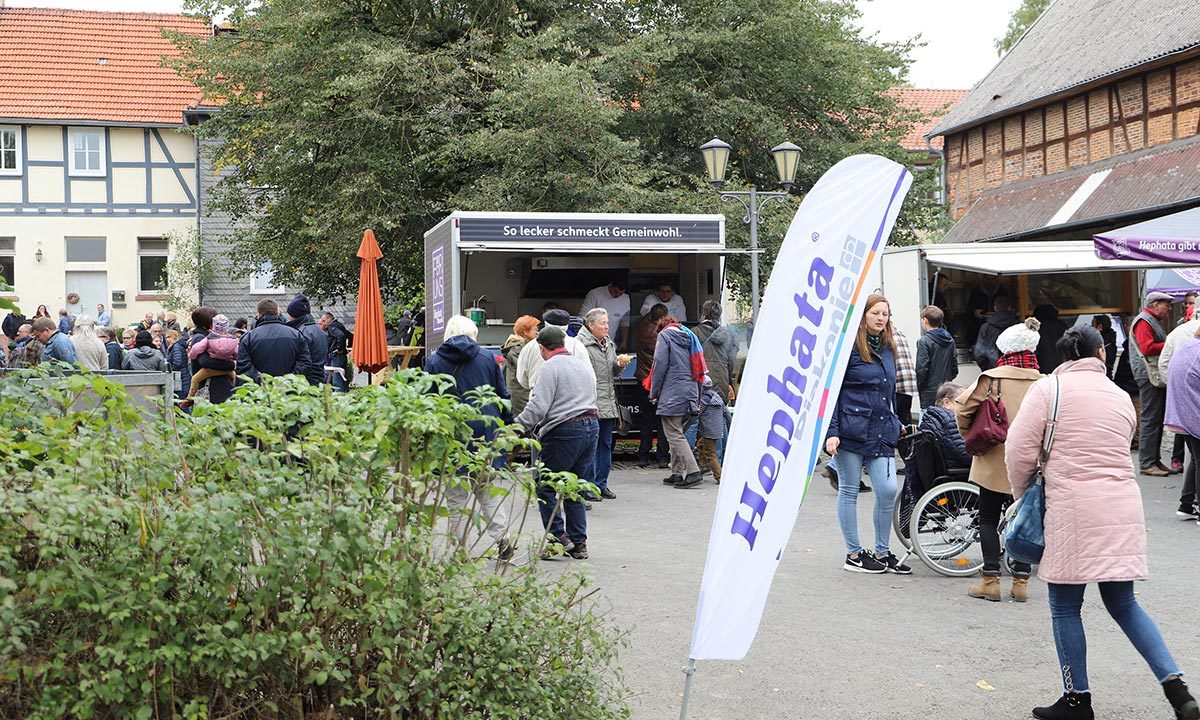 Natürlich gab es auch Leckeres aus den Produkten der ökologischen Landwirtschaft der Hephata Diakonie. Kartoffeln von Gut Halbersdorf und Richerode wurden zu Pellkartoffeln und Kartoffelpuffern verarbeitet, Kürbisse vom Zechenhof zu wärmender Suppe und Bratwurst und Burger aus der Alsfelder Biometzgerei landeten auf dem Grill. Die Pfadfinder aus Jesberg backten Waffeln und Stockbrot, es gab frisch gepressten Apfelsaft und selbstgebackenen Kuchen. Die Für-Uns-Manufakturen Treysa und Fritzlar präsentierten Papeterie und Geschenkartikel, das Herzberghaus stellte Gartenmöbel aus. Daneben erfuhren die Besucher interessantes zur ökologischen Landwirtschaft und dem Kulturgut Richerode.
