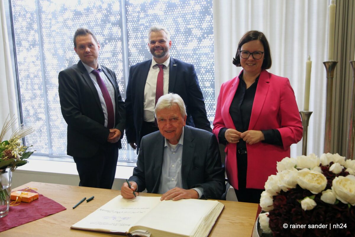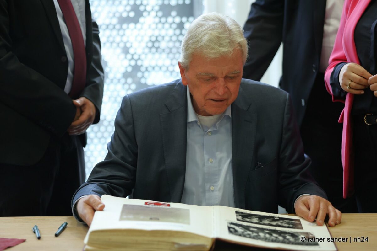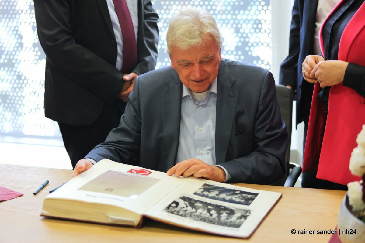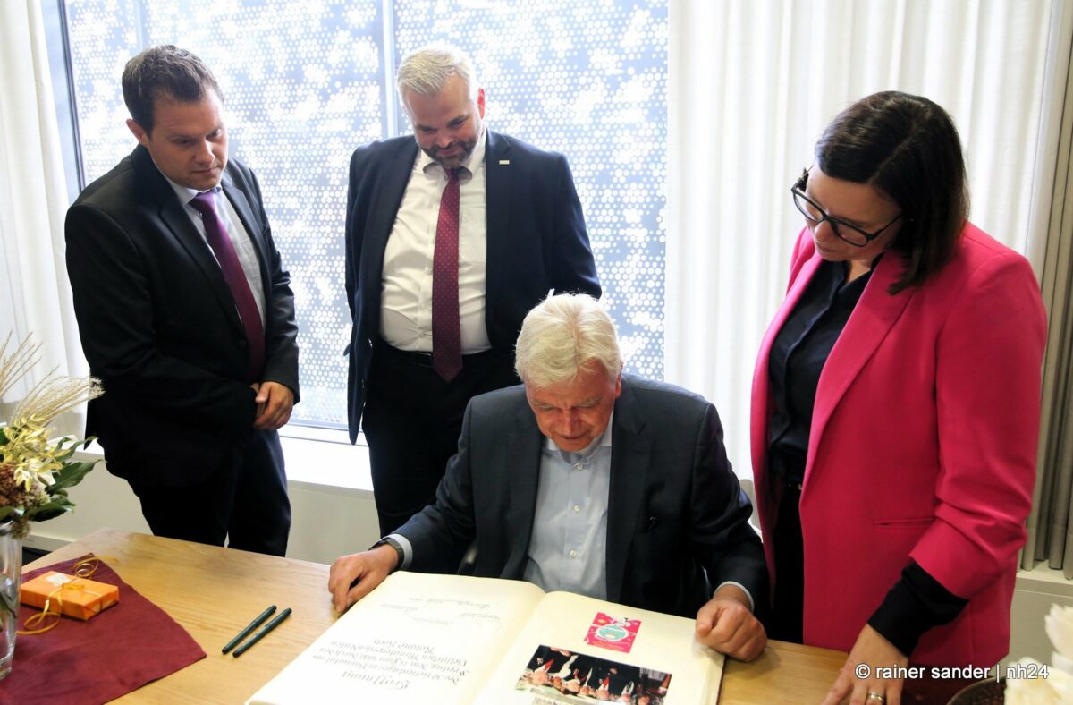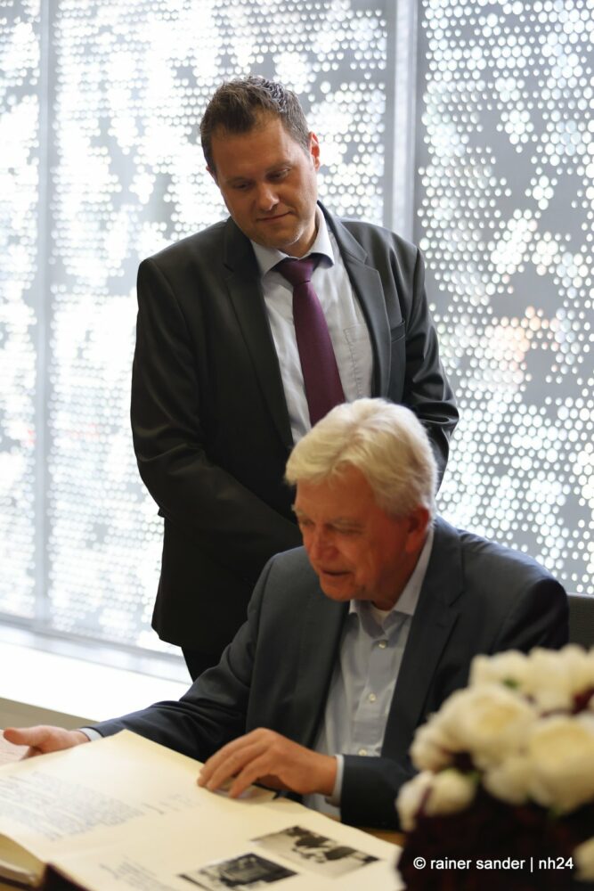 Wenn nämlich erst nach Ende einer langen Zeit als Ministerpräsident eine Unterschrift im „Geschichtsbuch“ einer Stadt geschehen darf, entsteht eine Atmosphäre ohne Anspannung und Zeitdruck. Es ist plötzlich Zeit, im Buch zurückzublättern. Viele Seiten, beispielsweise bis zum Hessentag 1999, um zu sehen, wer dort sonst noch alles drinsteht. Bürgermeisterin Manuela Strube und Erster Stadtrat Daniel Jung hatten sich extra vergewissert, aber nur einen Eintrag mit der ganzen hessischen Landesregierung zum Hessentag 1999 gefunden. So hat sich Volker Bouffier gestern Nachmittag zum ersten Mal allein im Goldenen Buch der Stadt Baunatal verewigt. Dabei war Muße für ein paar persönliche sowie ein paar wenige politische Worte.