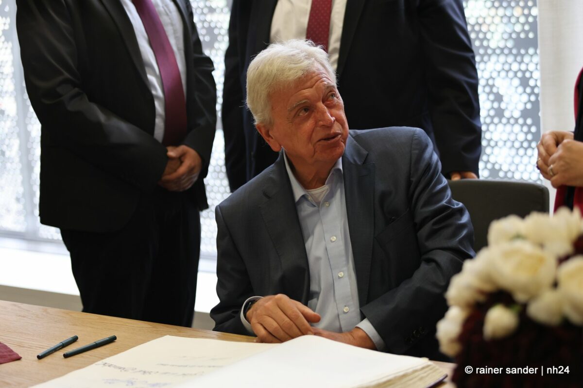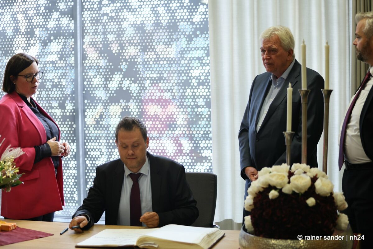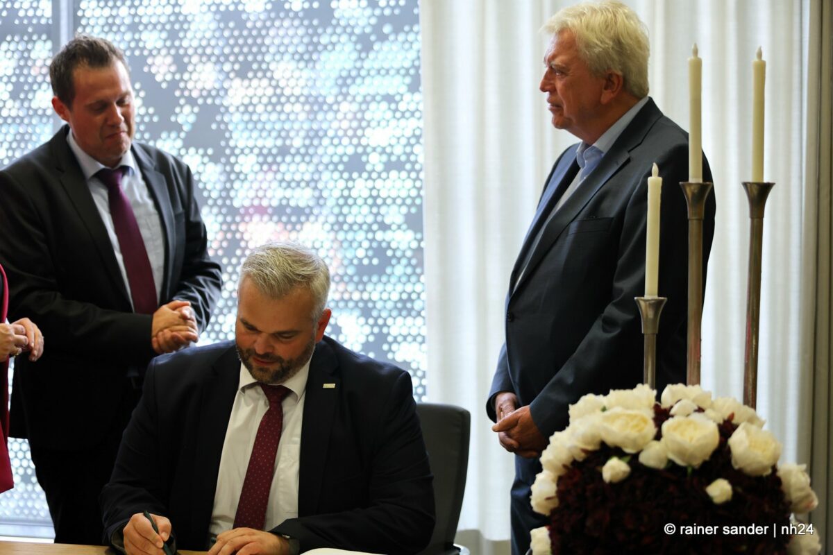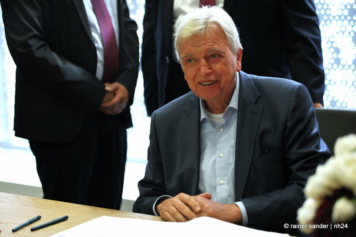 Wenn nämlich erst nach Ende einer langen Zeit als Ministerpräsident eine Unterschrift im „Geschichtsbuch“ einer Stadt geschehen darf, entsteht eine Atmosphäre ohne Anspannung und Zeitdruck. Es ist plötzlich Zeit, im Buch zurückzublättern. Viele Seiten, beispielsweise bis zum Hessentag 1999, um zu sehen, wer dort sonst noch alles drinsteht. Bürgermeisterin Manuela Strube und Erster Stadtrat Daniel Jung hatten sich extra vergewissert, aber nur einen Eintrag mit der ganzen hessischen Landesregierung zum Hessentag 1999 gefunden. So hat sich Volker Bouffier gestern Nachmittag zum ersten Mal allein im Goldenen Buch der Stadt Baunatal verewigt. Dabei war Muße für ein paar persönliche sowie ein paar wenige politische Worte.