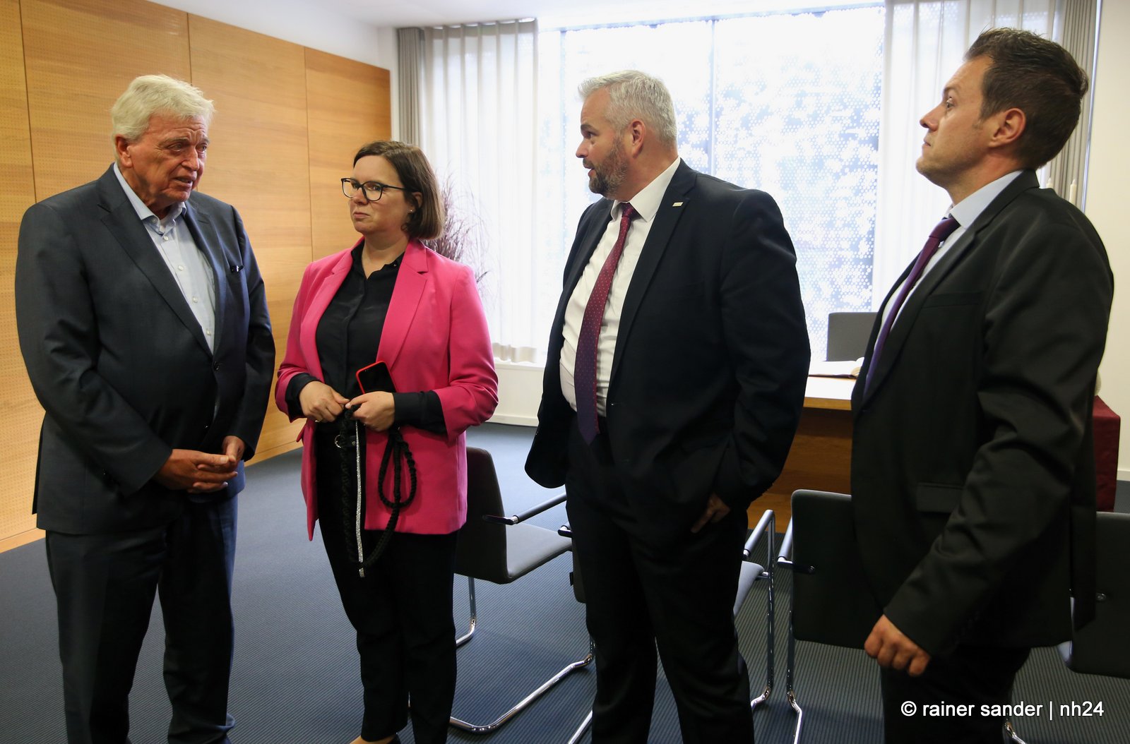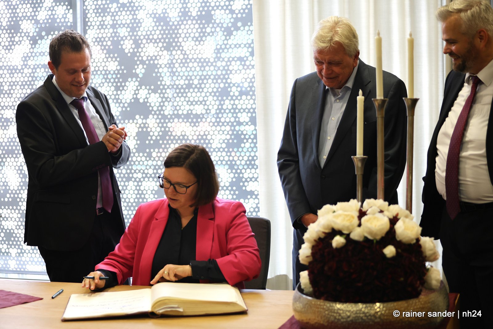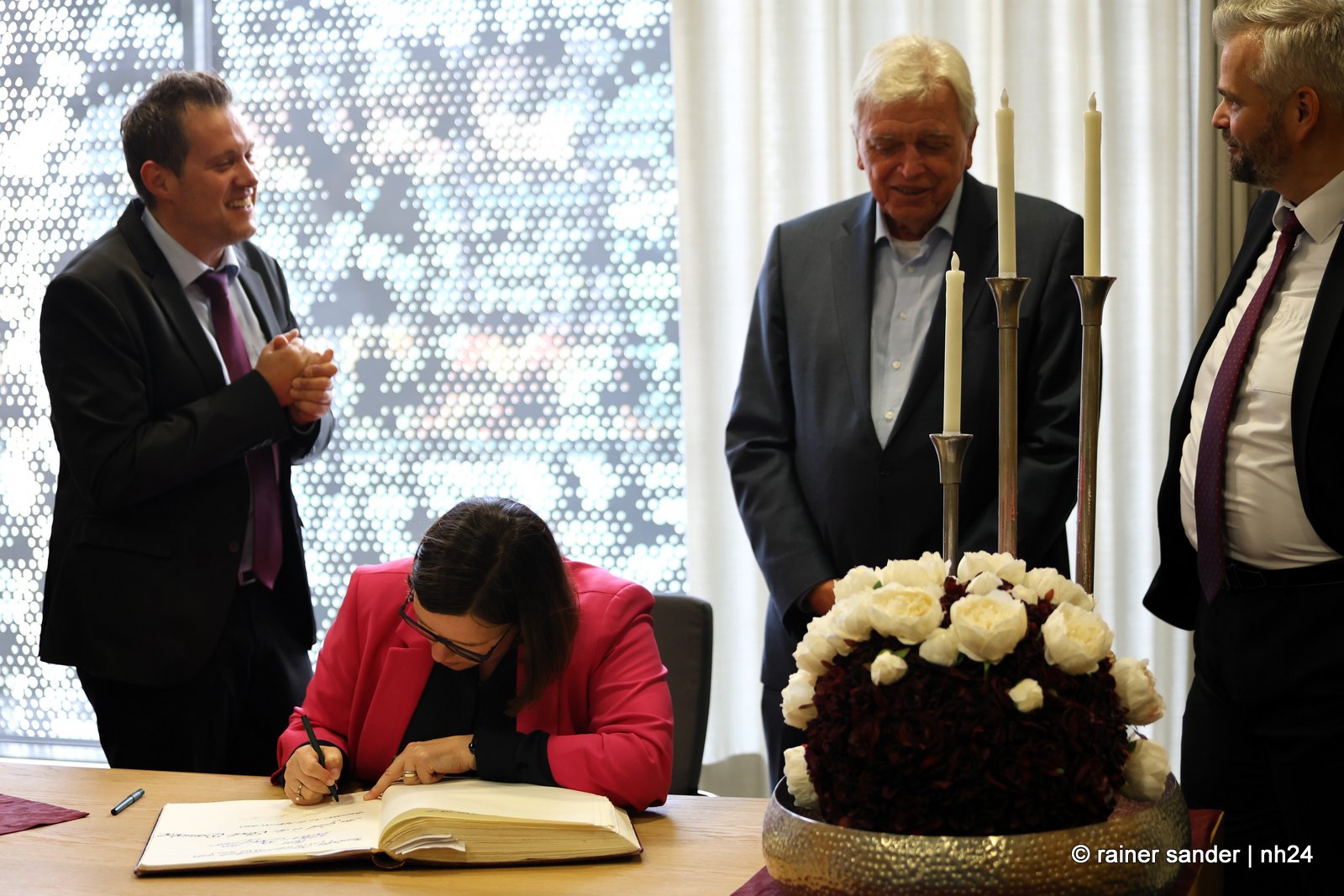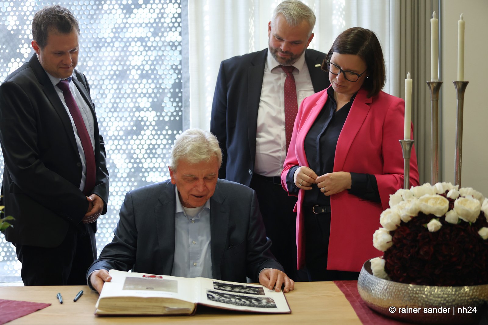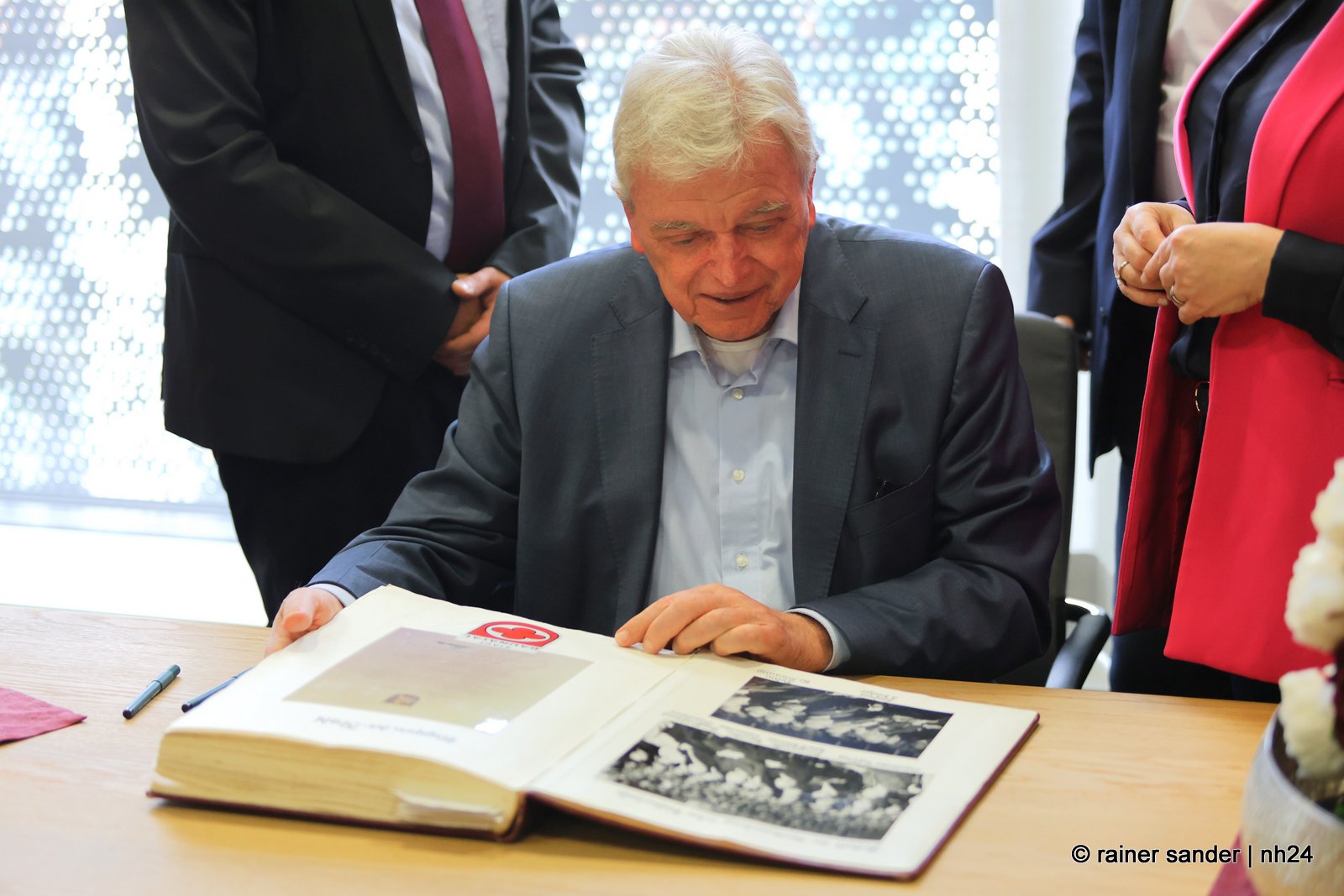 Wenn nämlich erst nach Ende einer langen Zeit als Ministerpräsident eine Unterschrift im „Geschichtsbuch“ einer Stadt geschehen darf, entsteht eine Atmosphäre ohne Anspannung und Zeitdruck. Es ist plötzlich Zeit, im Buch zurückzublättern. Viele Seiten, beispielsweise bis zum Hessentag 1999, um zu sehen, wer dort sonst noch alles drinsteht. Bürgermeisterin Manuela Strube und Erster Stadtrat Daniel Jung hatten sich extra vergewissert, aber nur einen Eintrag mit der ganzen hessischen Landesregierung zum Hessentag 1999 gefunden. So hat sich Volker Bouffier gestern Nachmittag zum ersten Mal allein im Goldenen Buch der Stadt Baunatal verewigt. Dabei war Muße für ein paar persönliche sowie ein paar wenige politische Worte.